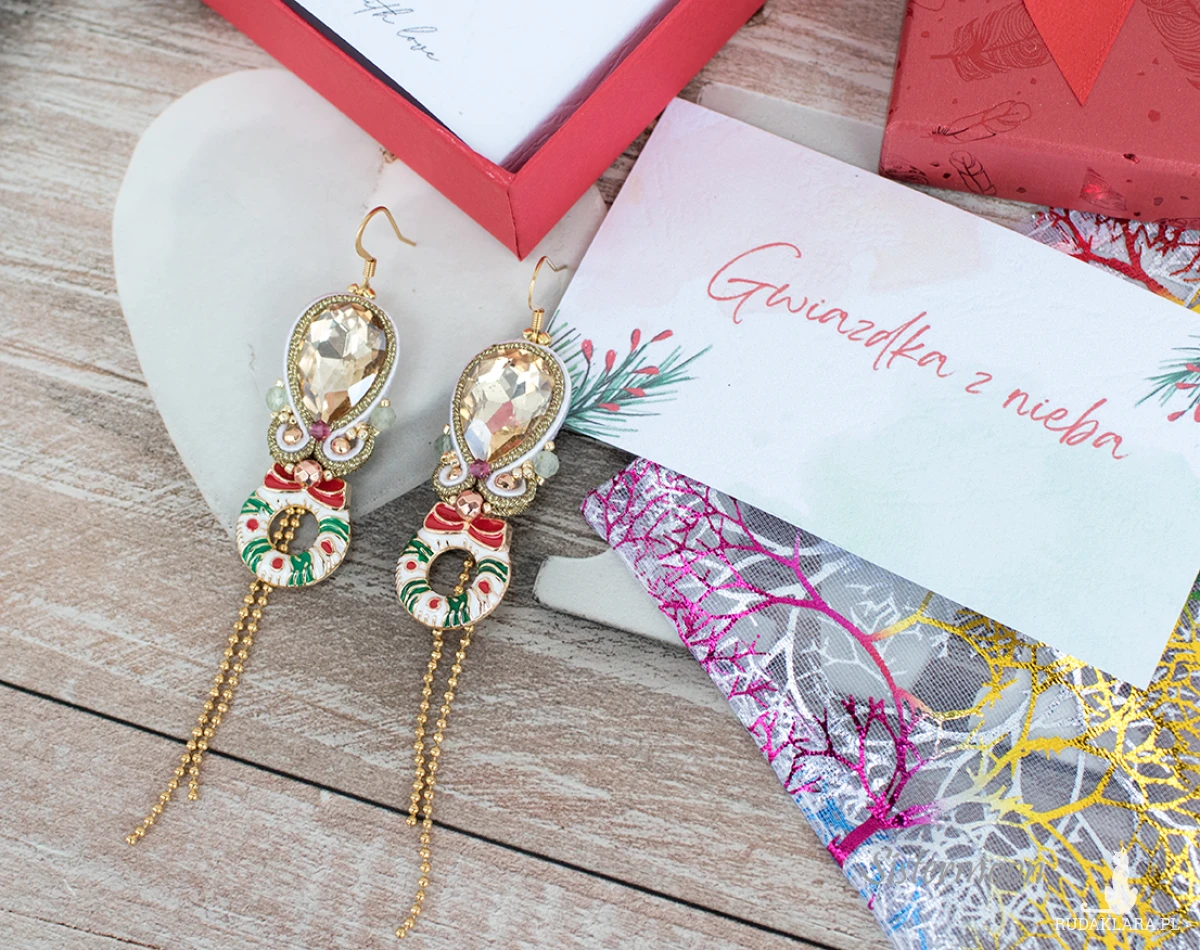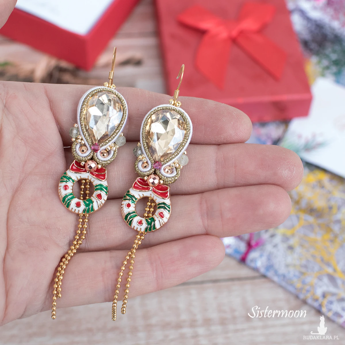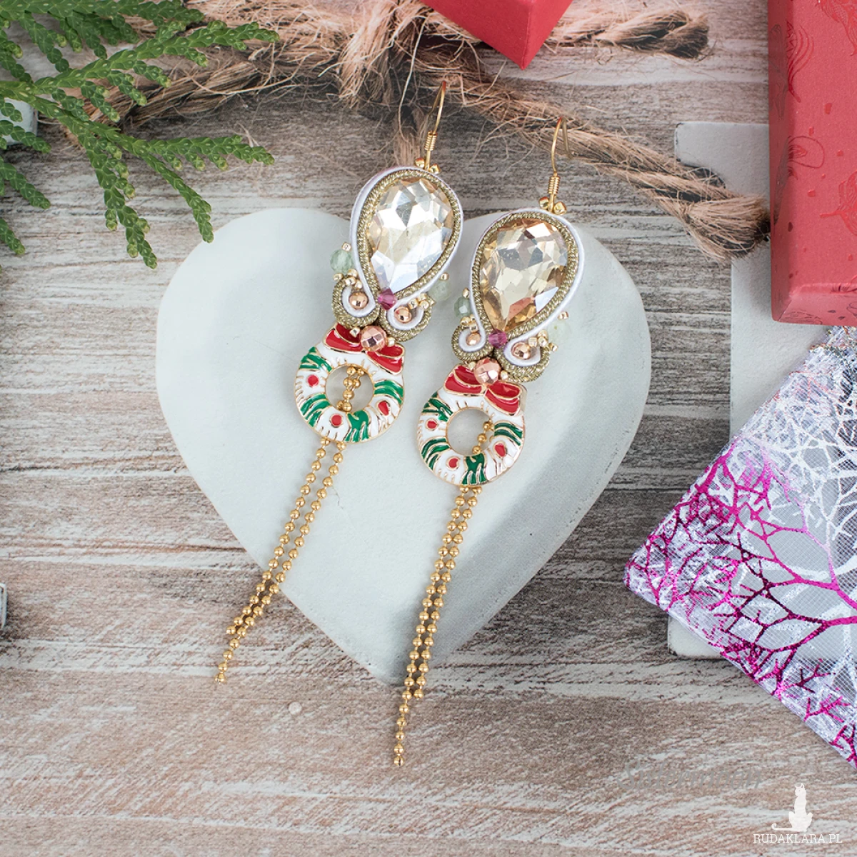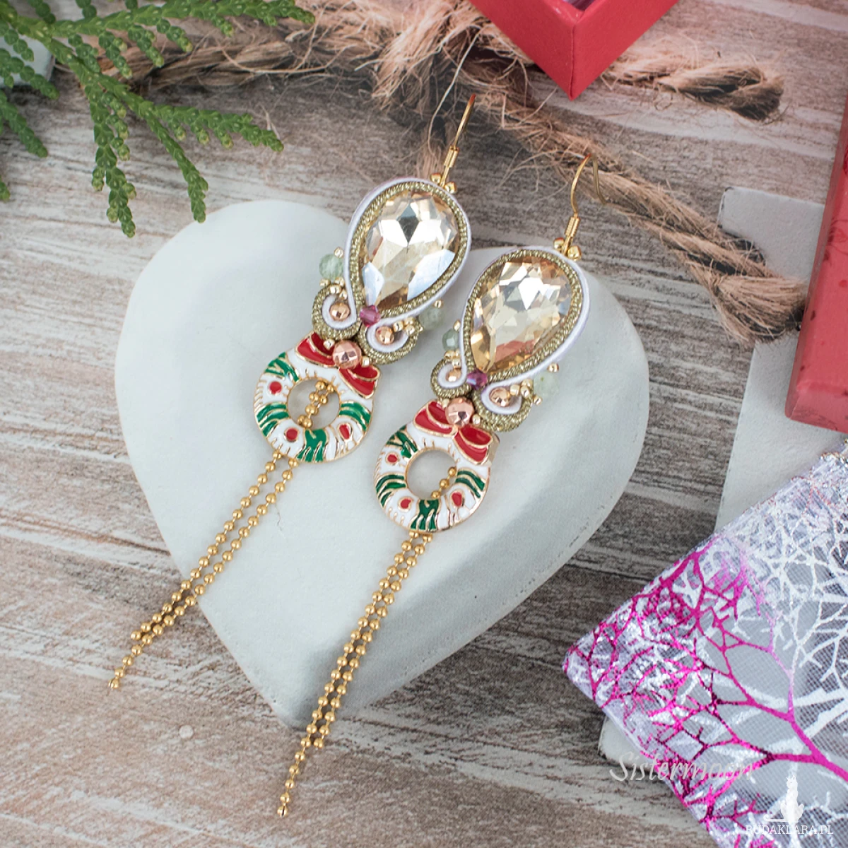 Świąteczne Kolczyki sutasz. Smukłe, dość długie kolczyki sutasz z kolekcji zimowej. Szklane