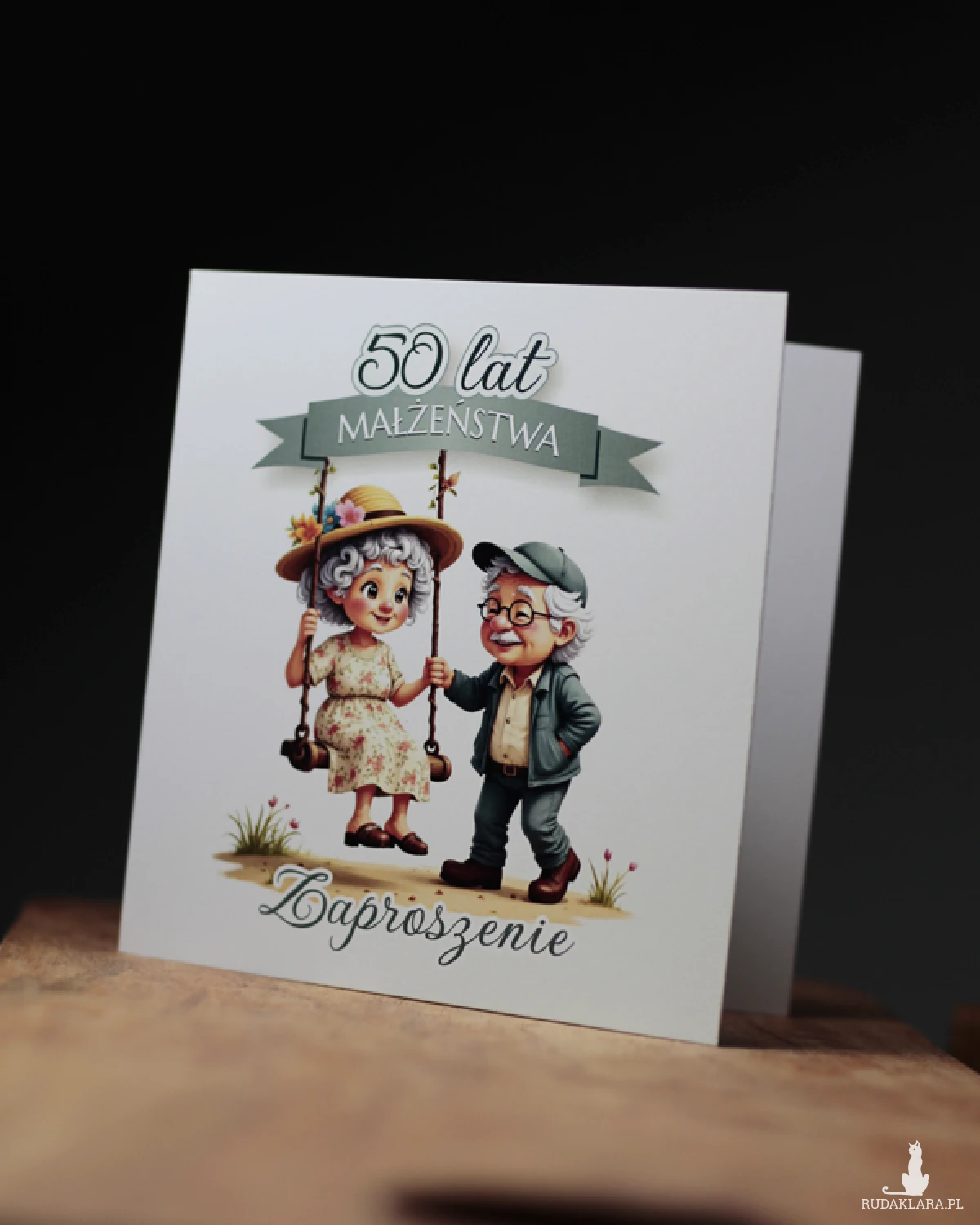 Zaproszenie z okazji 50 rocznicy ślubu. Zaproszenie składane do formatu 14x14. Wydruk cyfrowy na papierze kredowym o gramaturze 250g.