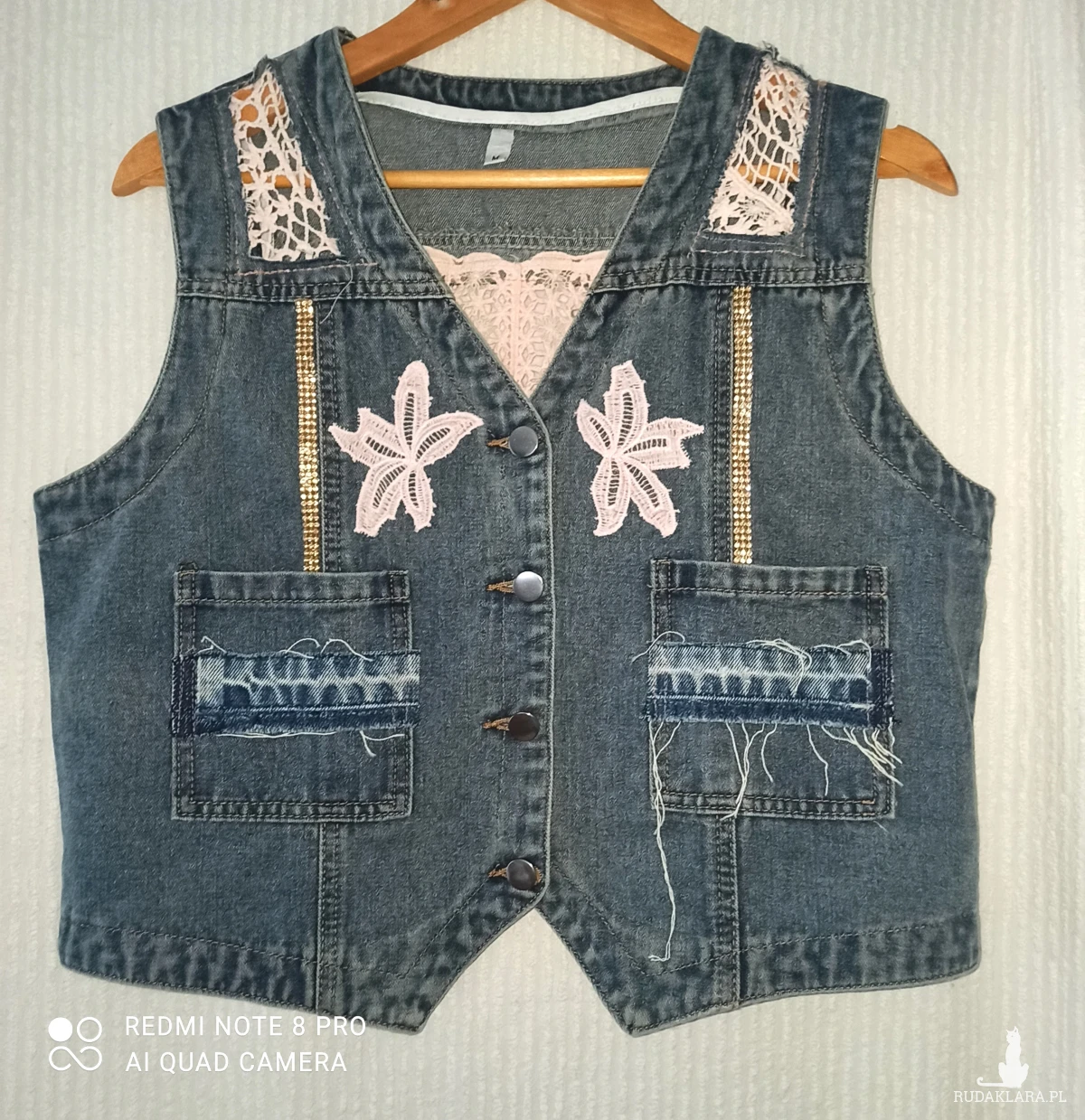 Kamizelka  jeansowa rozmiar M ręcznie ozdobiona, kolor niebieski. Do zdobienia wykorzystałam bawełniany haft, jeans, taśmę połyskującą. Zdobienia wykonane metodą patchworkową. Przód delikatnie zdobiony haftem, taśmą połyskującą i kieszonki postrzępionym jeansem. Zapinana na 4 metalowe guziczki.Tył z prześwitującą wstawką. Zastosowana kolorystyka jest spokojna ale w całości elementy dają efekt WOW! Element odzieży, który można zestawić ze spódniczką, spodniami, t-shirtem, koszulą. Jedyny taki. Długość 46 cm, szerokość 53 cm/mierzona pod pachami/. Polecam!