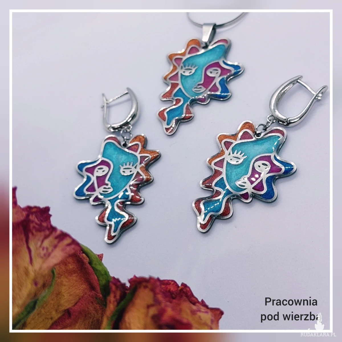 komplet biżuterii ręcznie malowanej kobieta twarz abstrakcjastal żywica
