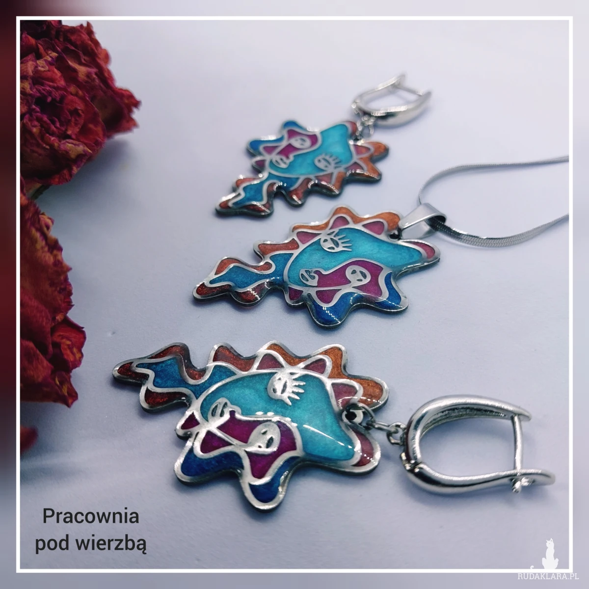Uroczy zestaw biżuterii ręcznie malowanej żywicą jubilerską. Elementy metalowe to stal szlachetna.