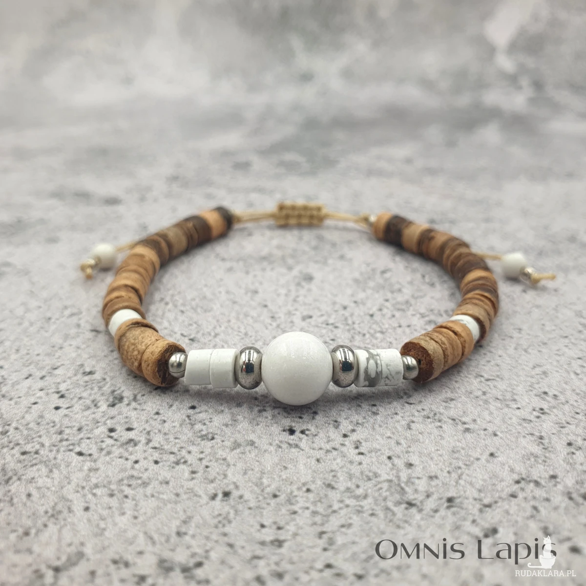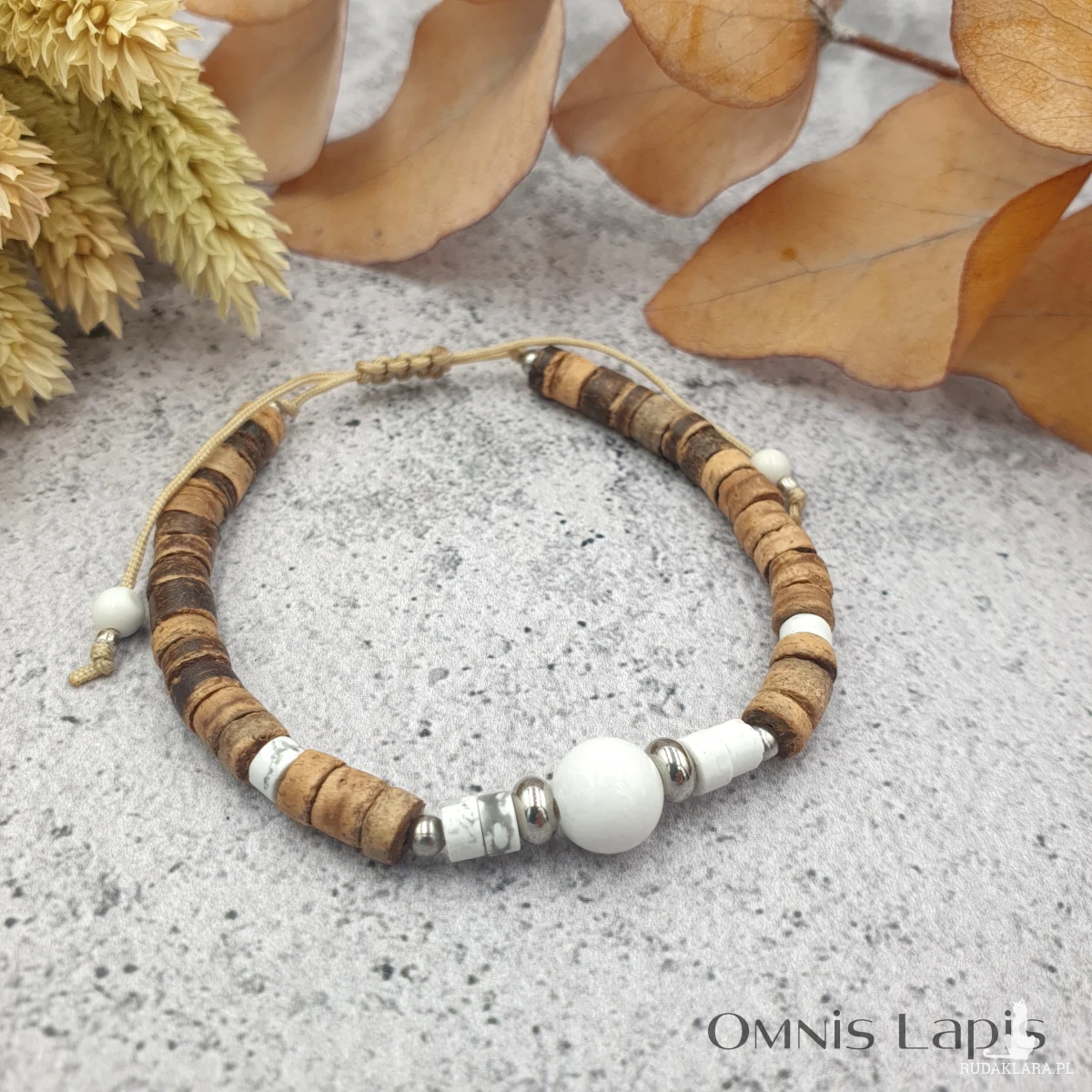 Wykonana z kul drewna egzotycznego. Główną ozdobę bransoletki stanowią przekładki z białego howlitu i jadeitu.