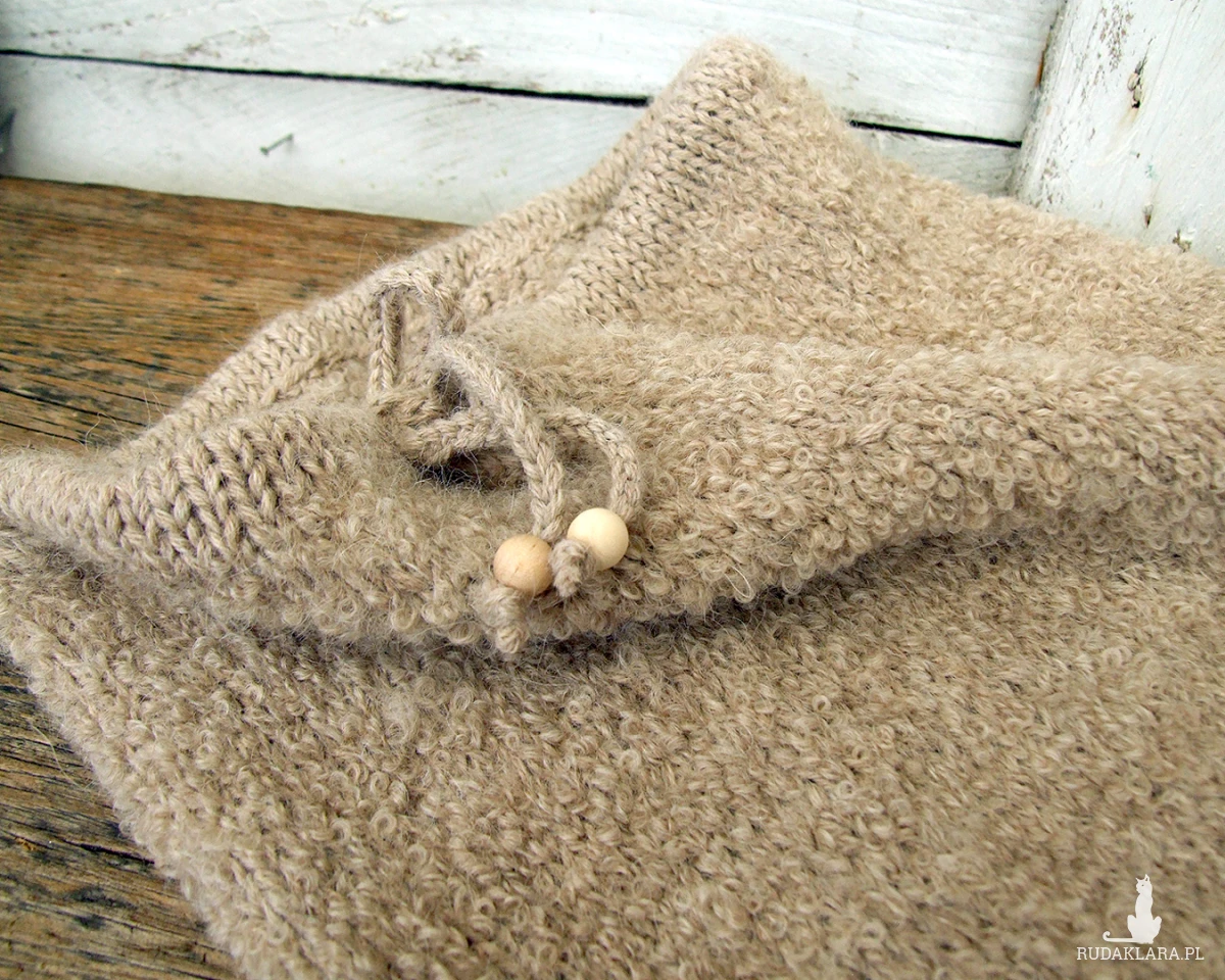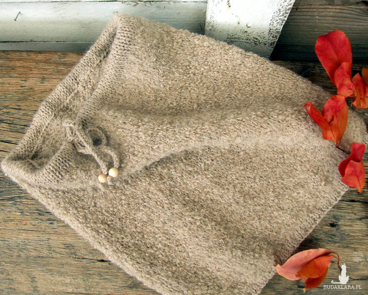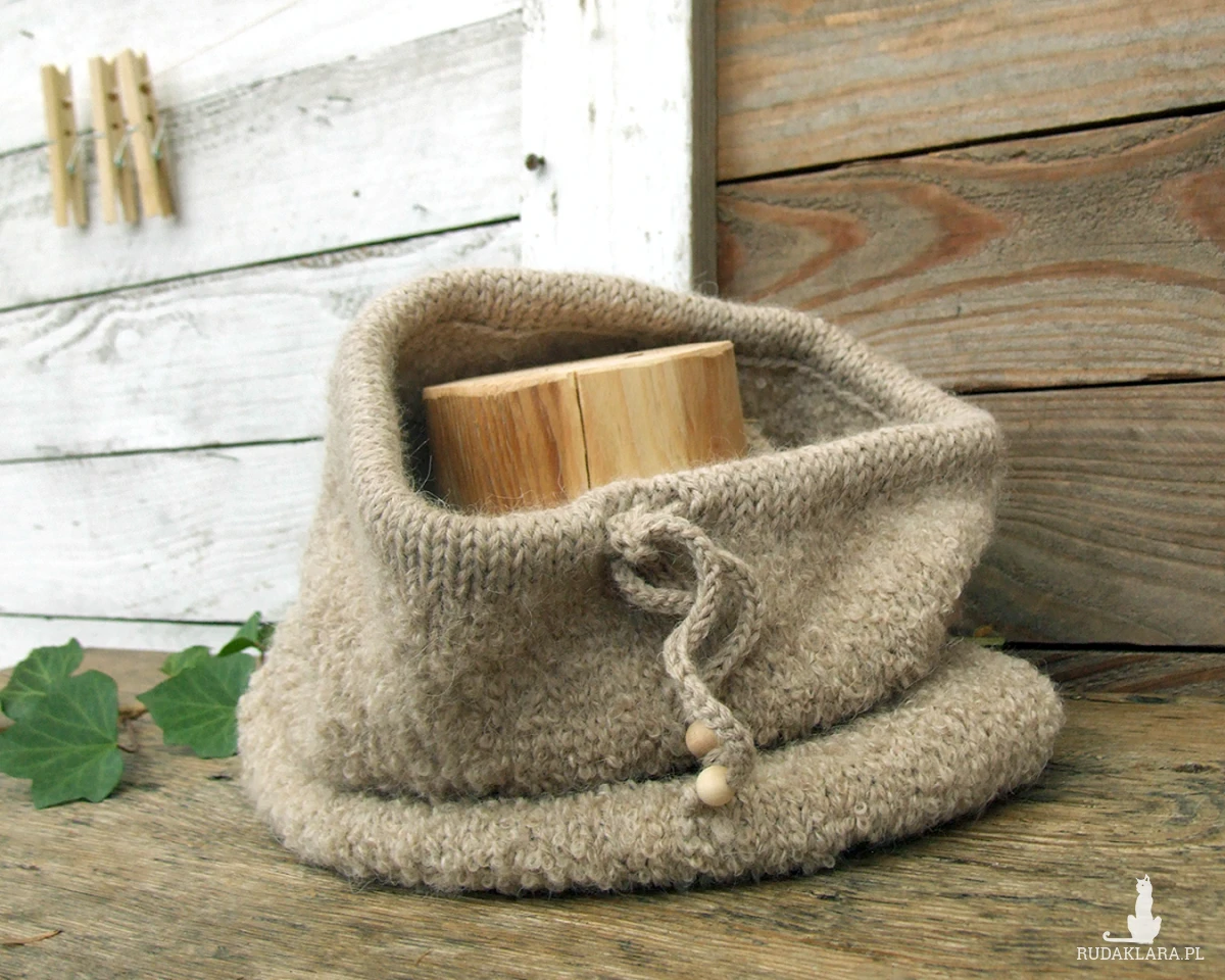 Komin, ciepły i miękki, wykonany ręcznie na drutach, z supełkowej alpaki i wełny owczej. Góra zakończona wąskim tunelem i troczkami do wiązania pod brodą.