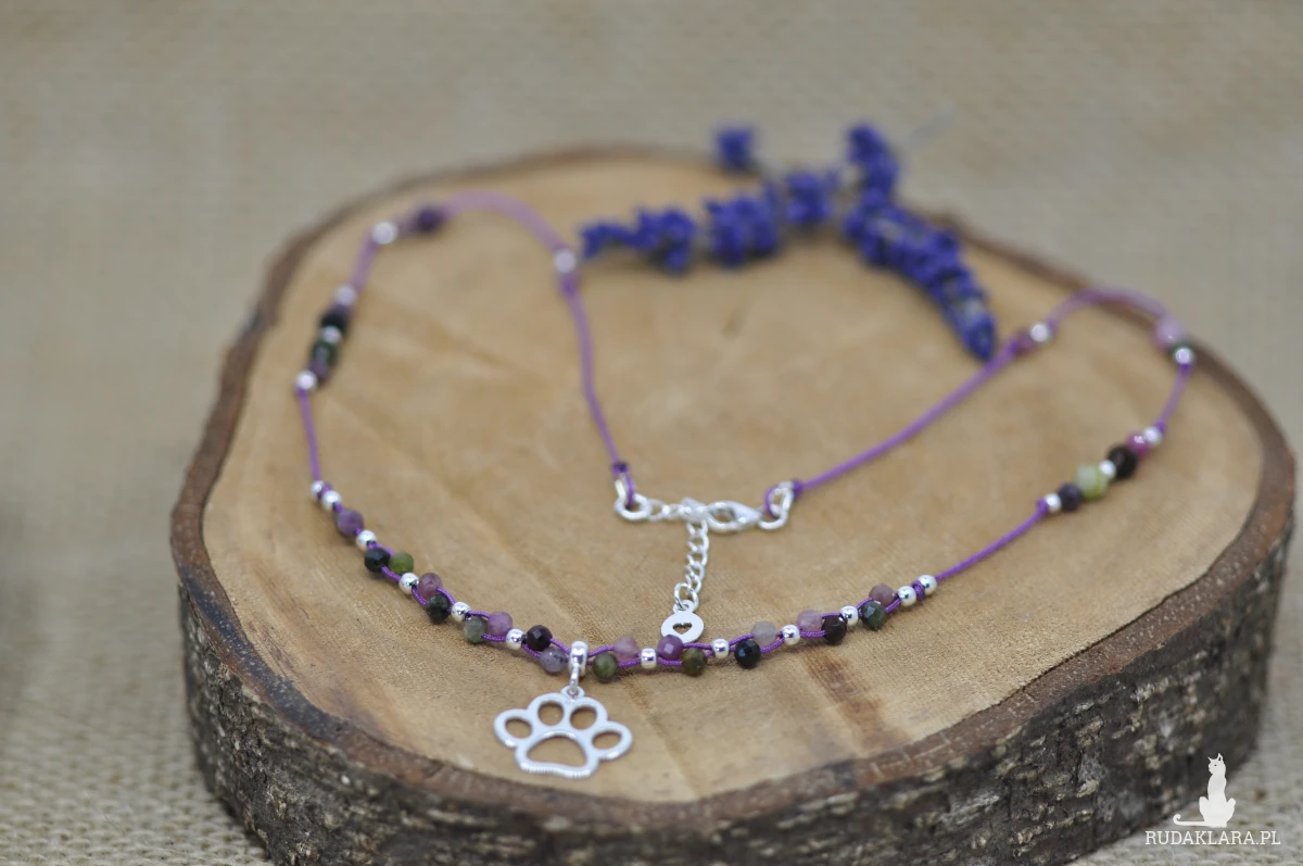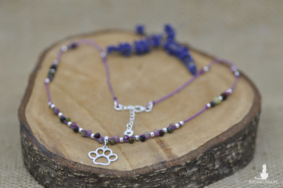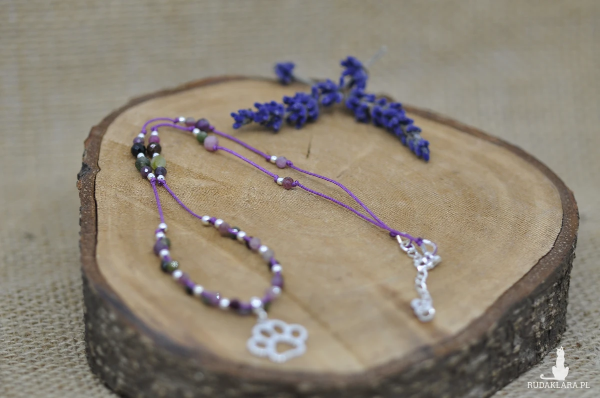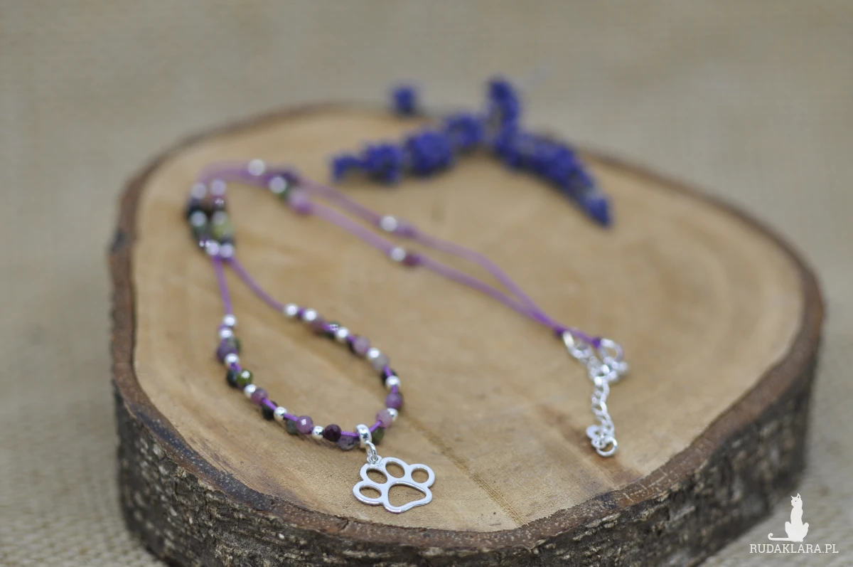 Naszyjnik w którym bazą jest sznurek nylonowy w kolorze fioletu, elementy srebrne wykonane są ze srebra próby 925,