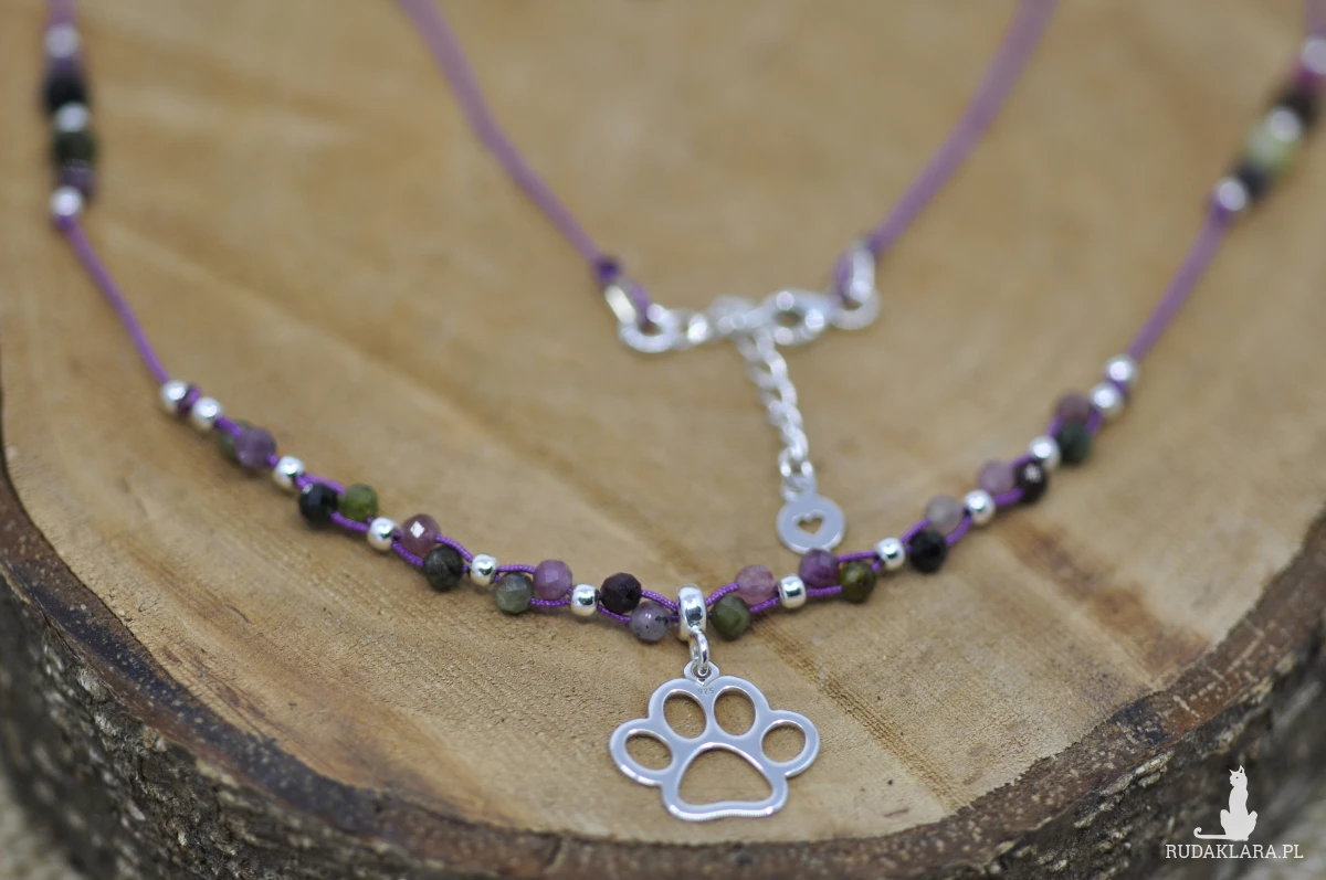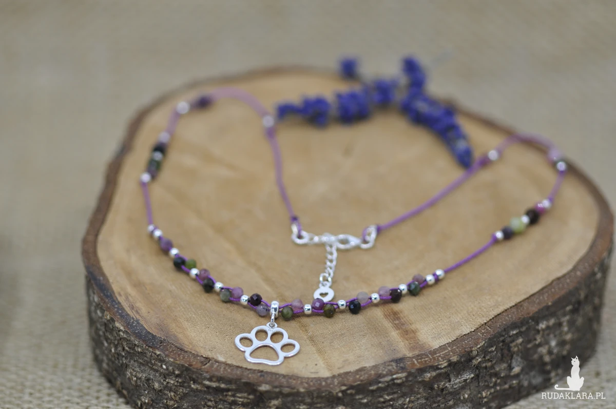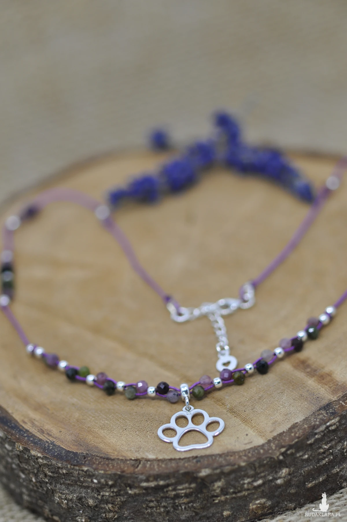 Naszyjnik w którym bazą jest sznurek nylonowy w kolorze fioletu, elementy srebrne wykonane są ze srebra próby 925,