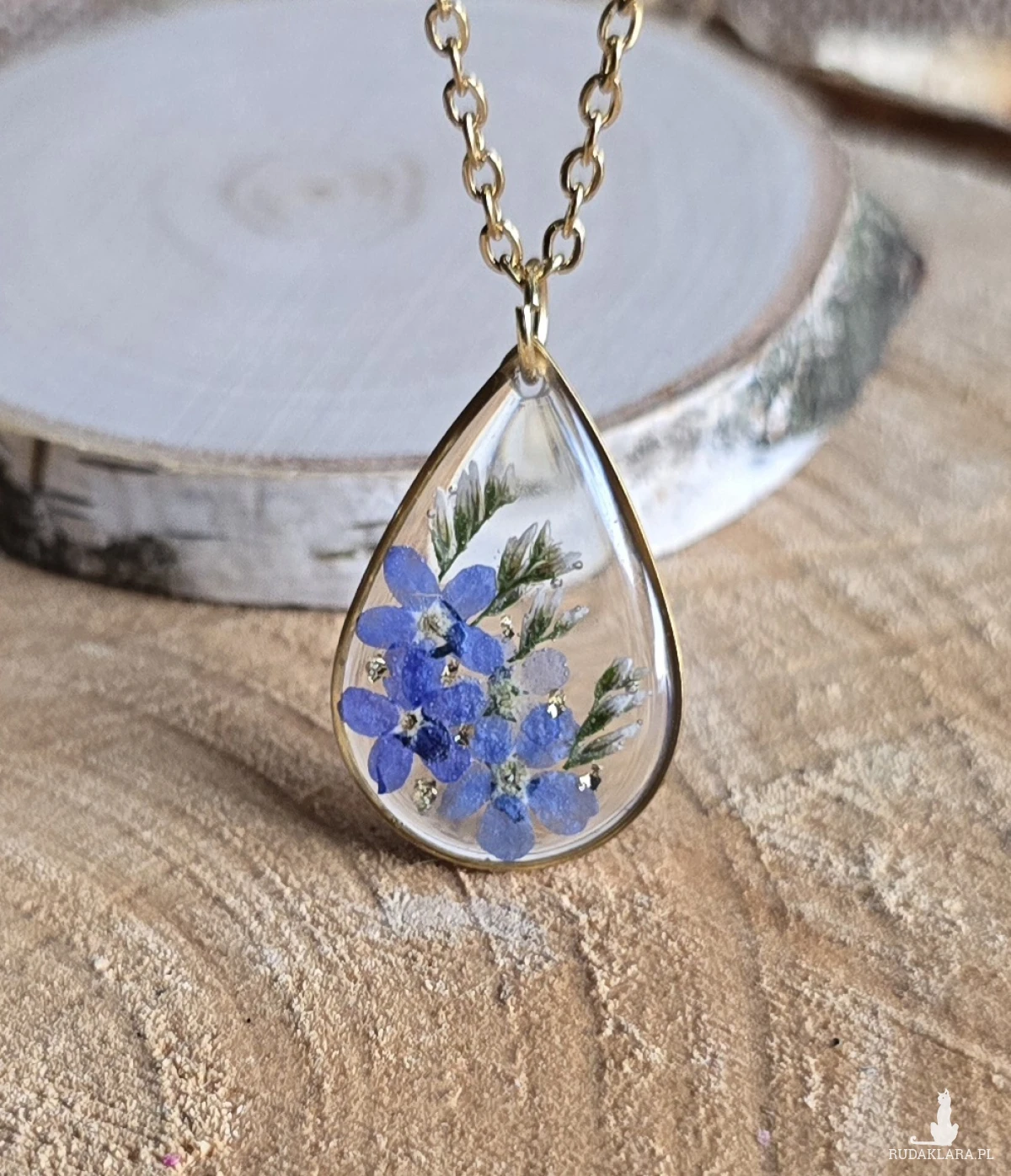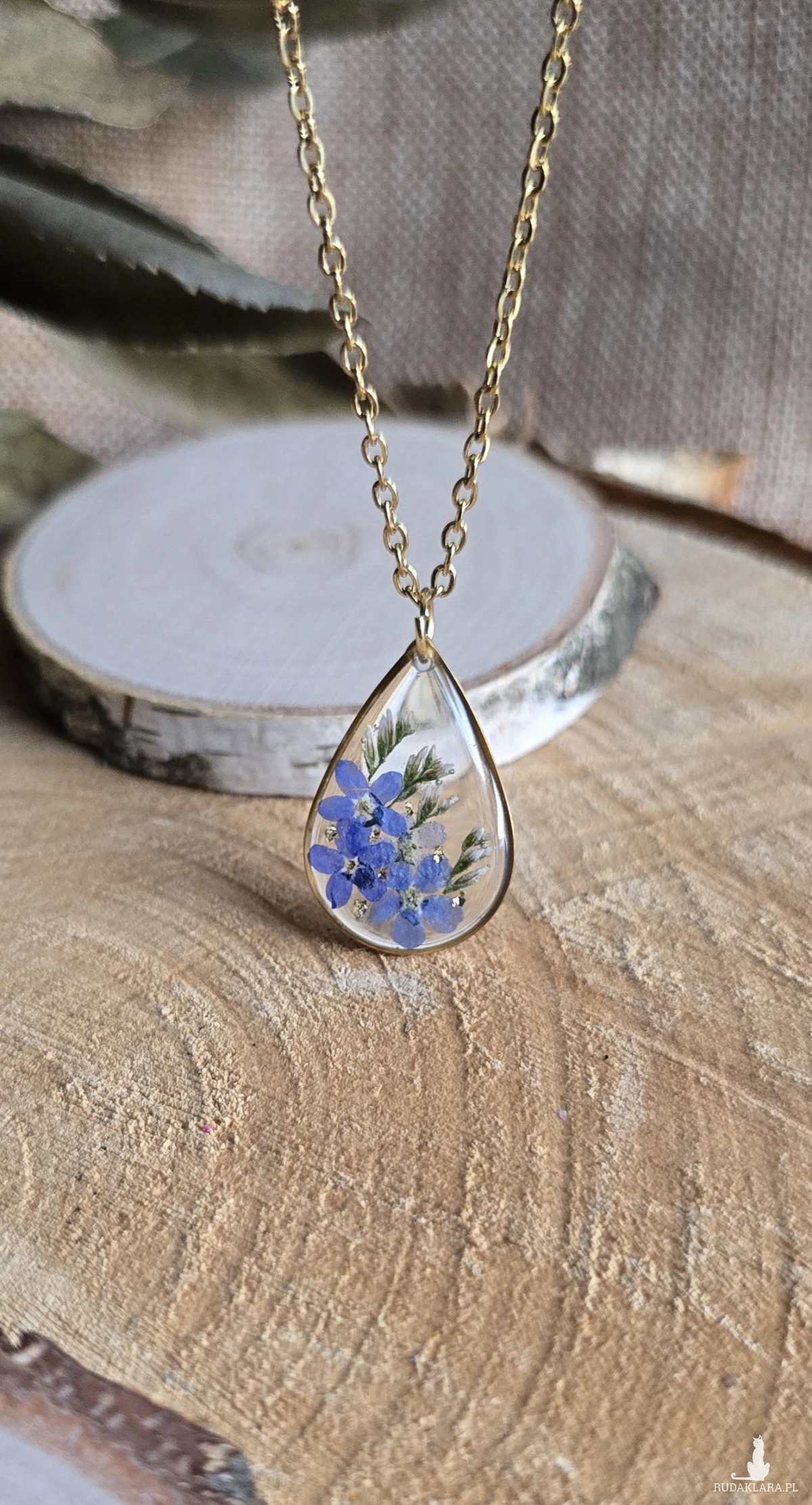 Złota zawieszka złoty wisiorek kwiat naszyjnik żywica z żywicy kwiaty łezka łza niezapominajka niezapominajki