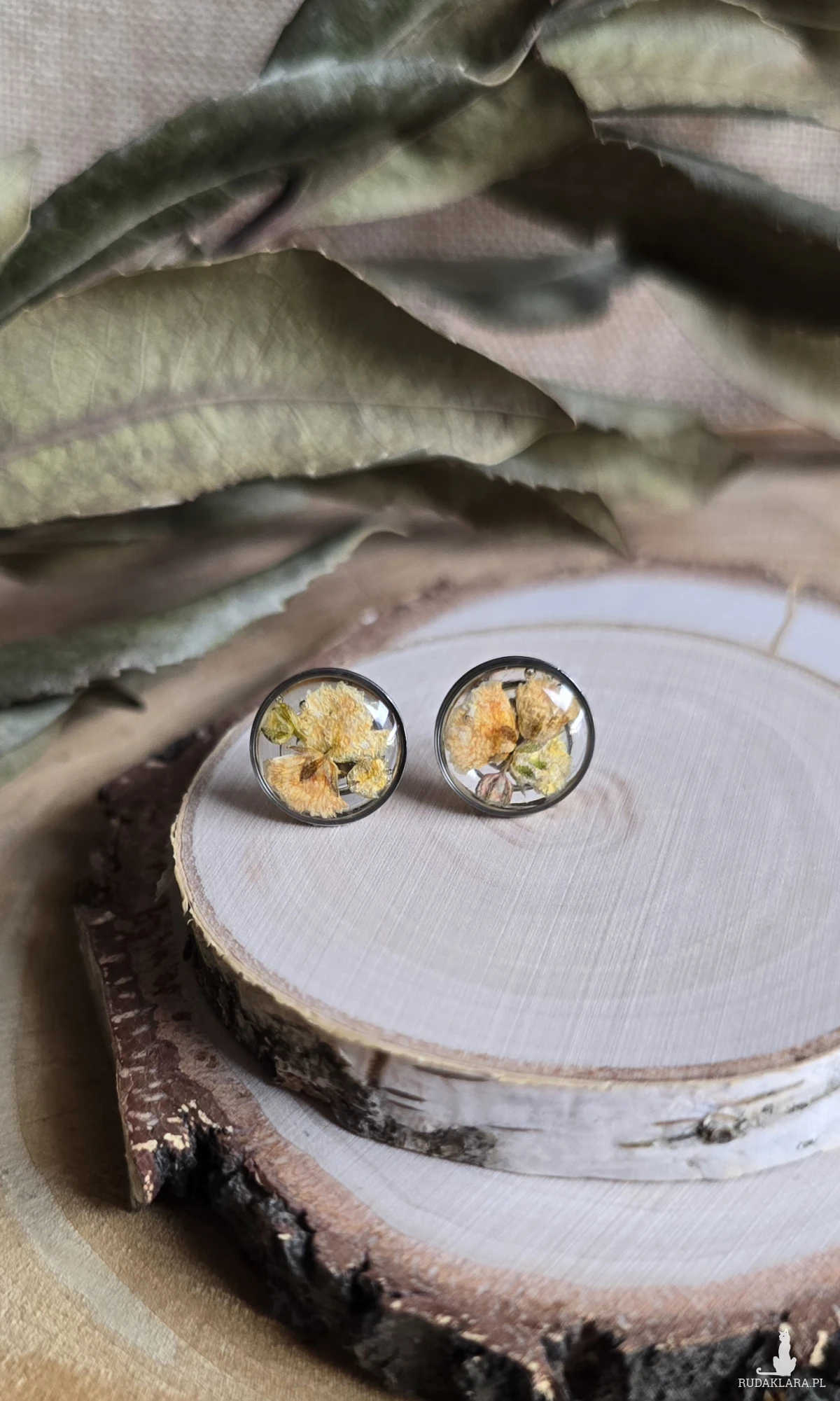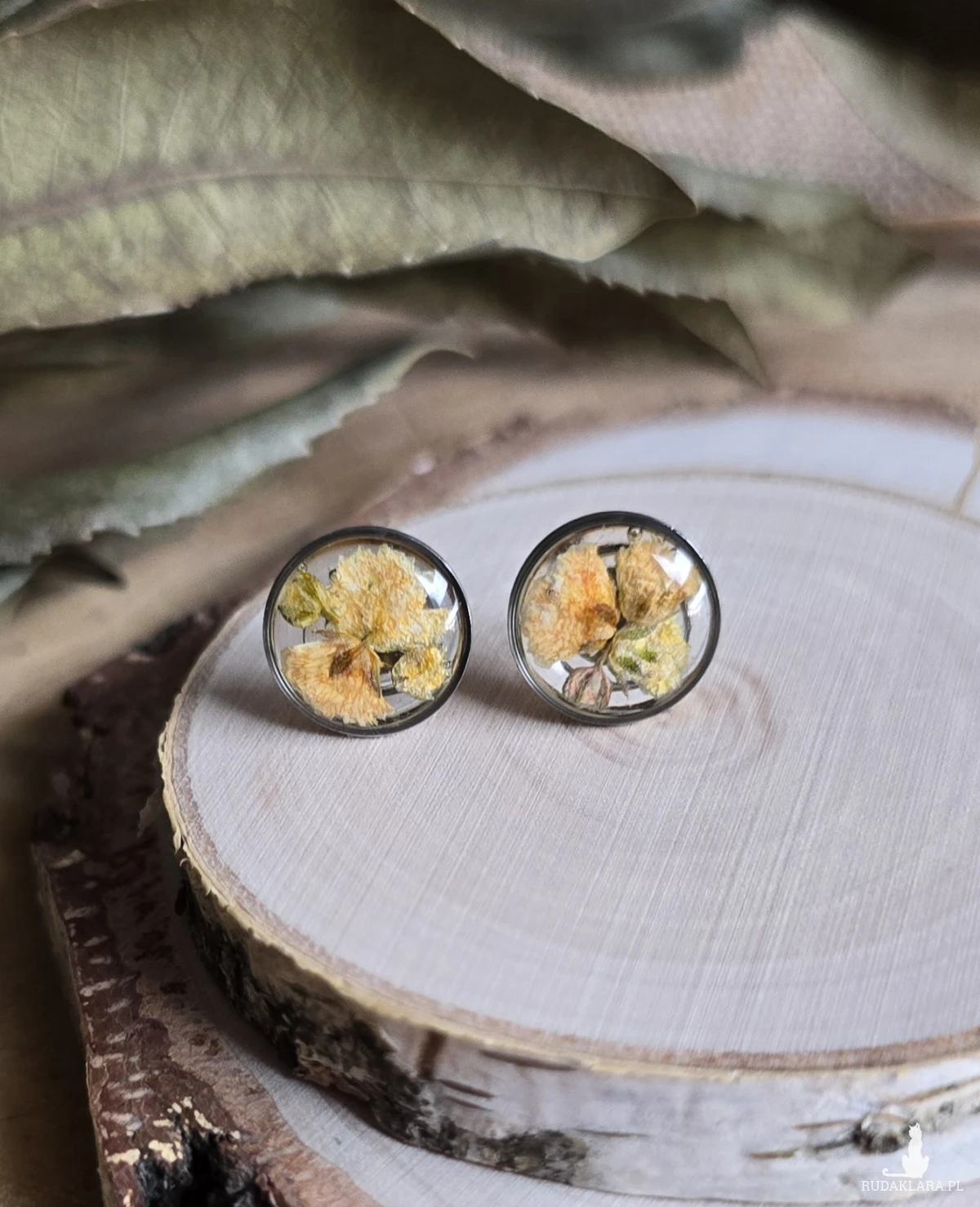 Srebrne kolczyki z kwiatami wkręty sztyfty z żywicy żywica epoksydowa z suszonymi prawdziwymi kwiatami żółte