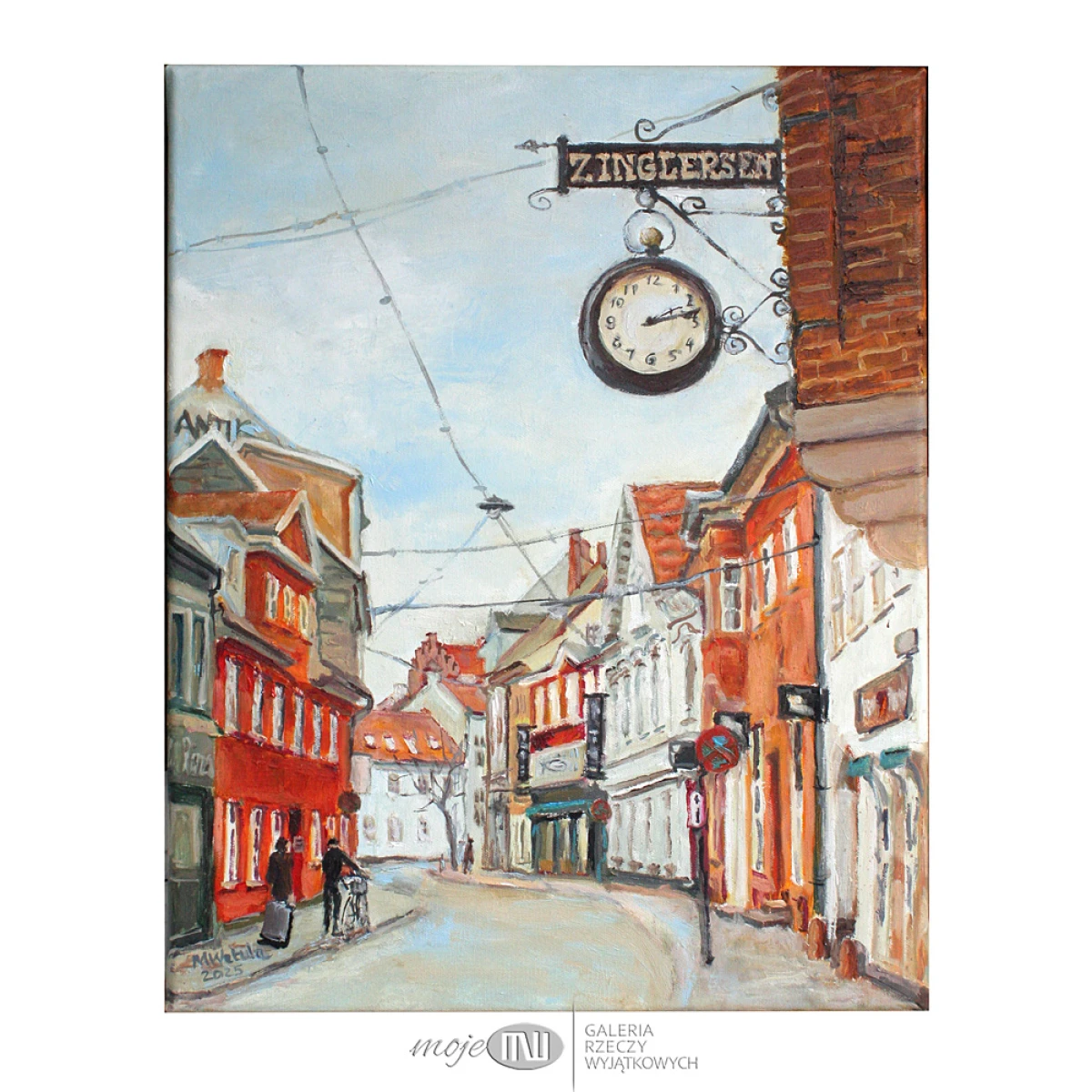 Obraz olejny malowany na płótnie, utrzymany w zawężonej, głównie ciepłej palecie barw, z wyraźną dominantą ciepłych odcieni pomarańczu, czerwieni i bieli z delikatnym dopełnieniem szarych błękitów.