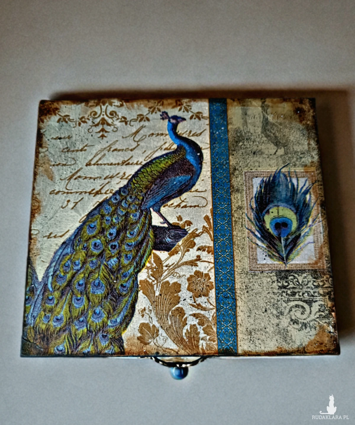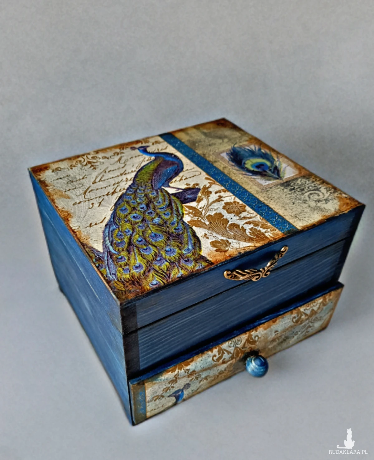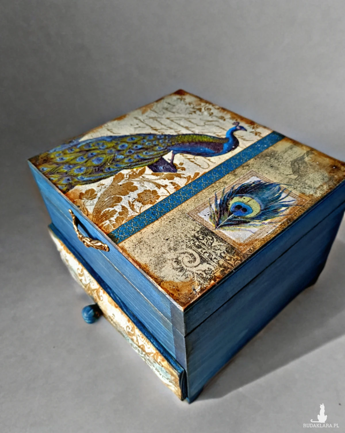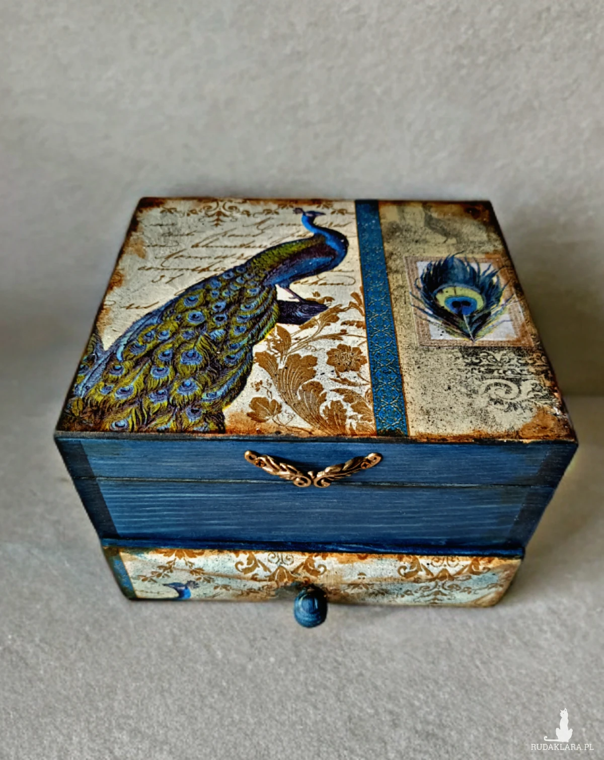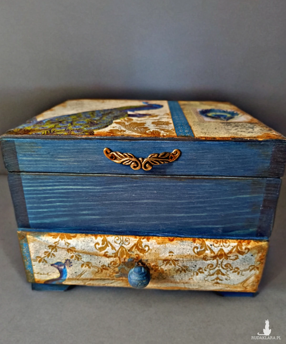 Drewniana skrzyneczka na biżuterię, z przegródkami, dodatkową szufladką i lusterkiem.