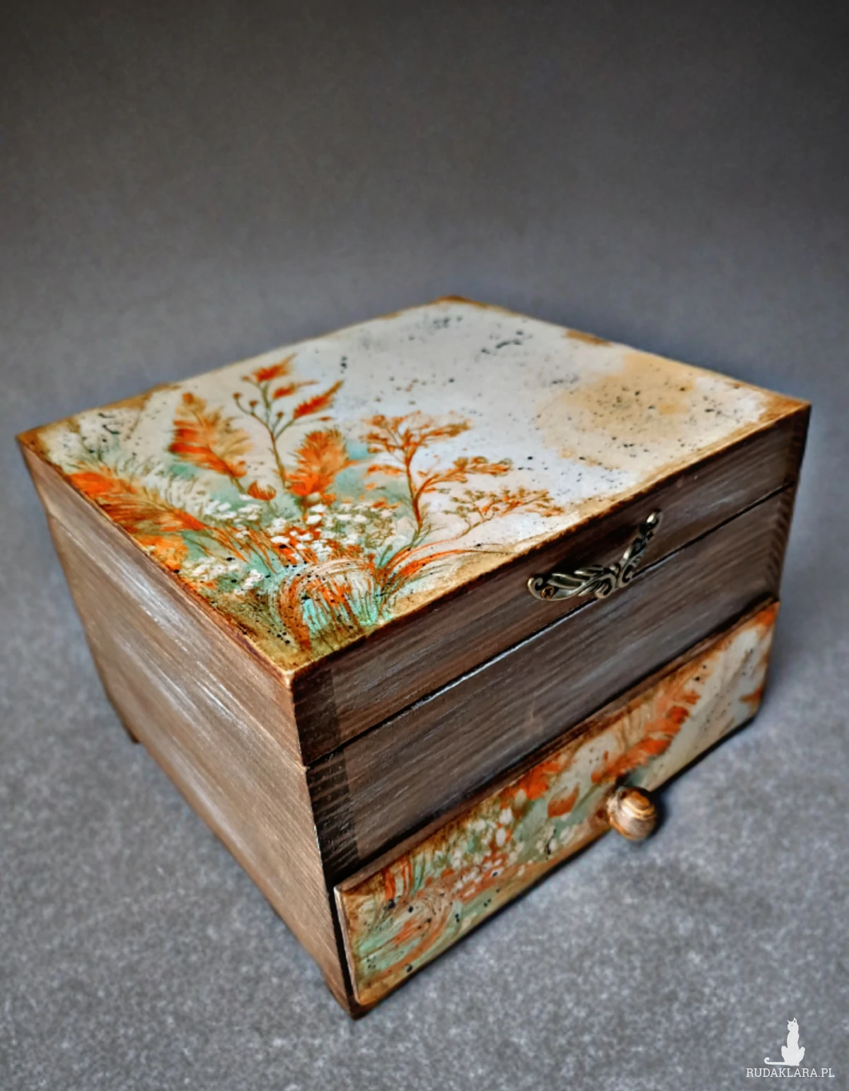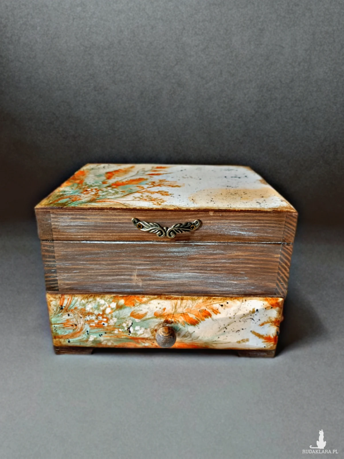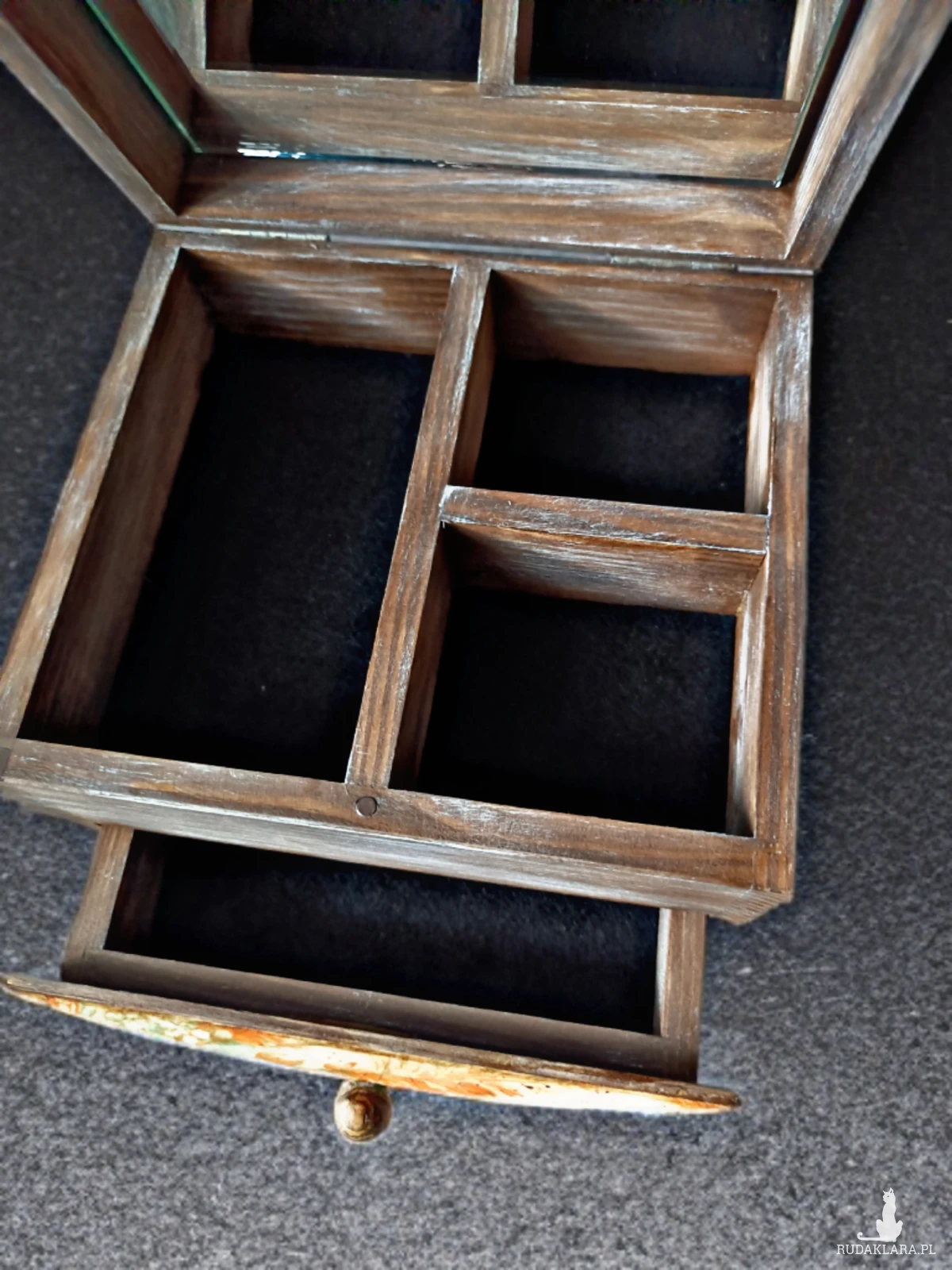 Drewniana skrzyneczka na biżuterię, z przegródkami, dodatkową szufladką i lusterkiem.