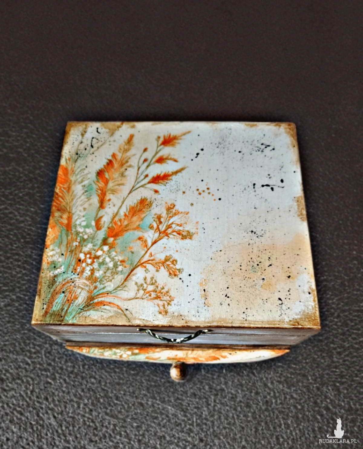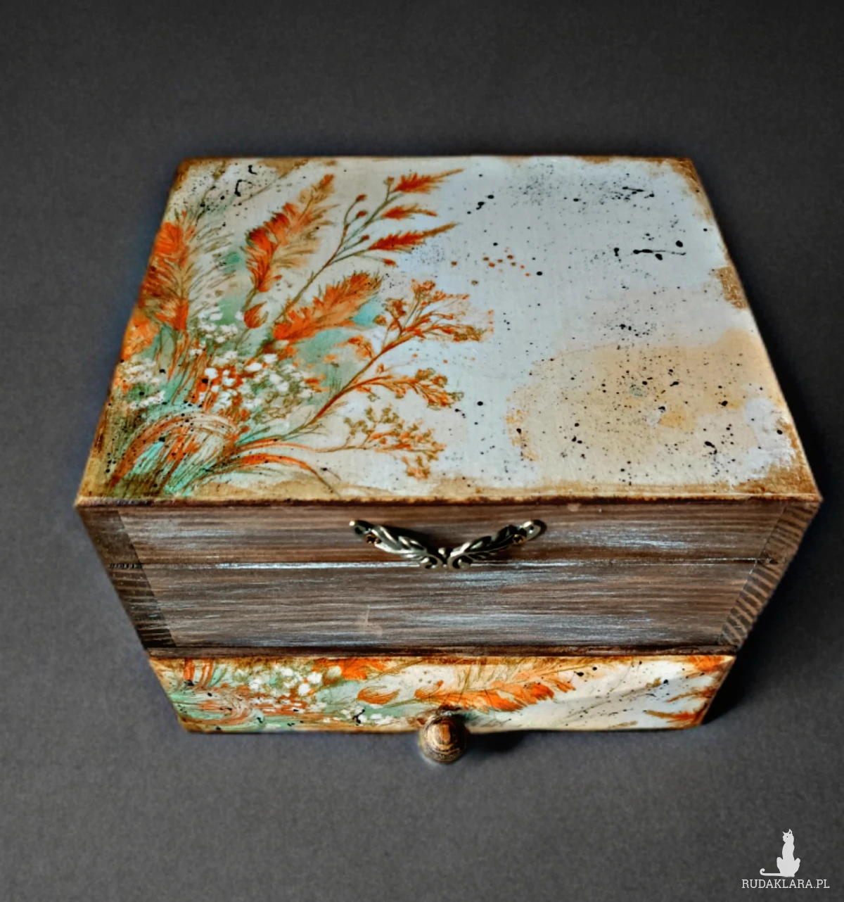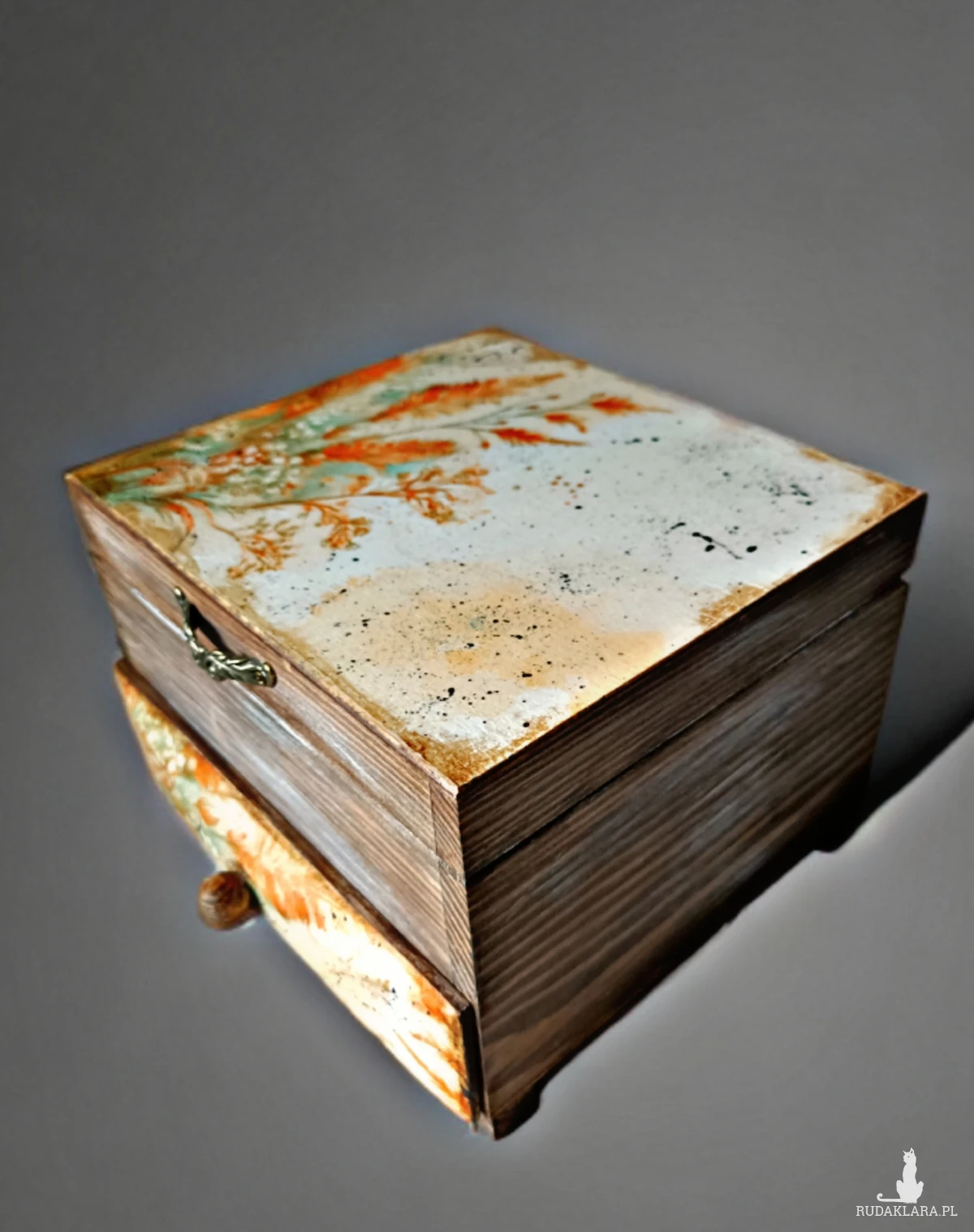 Drewniana skrzyneczka na biżuterię, z przegródkami, dodatkową szufladką i lusterkiem.