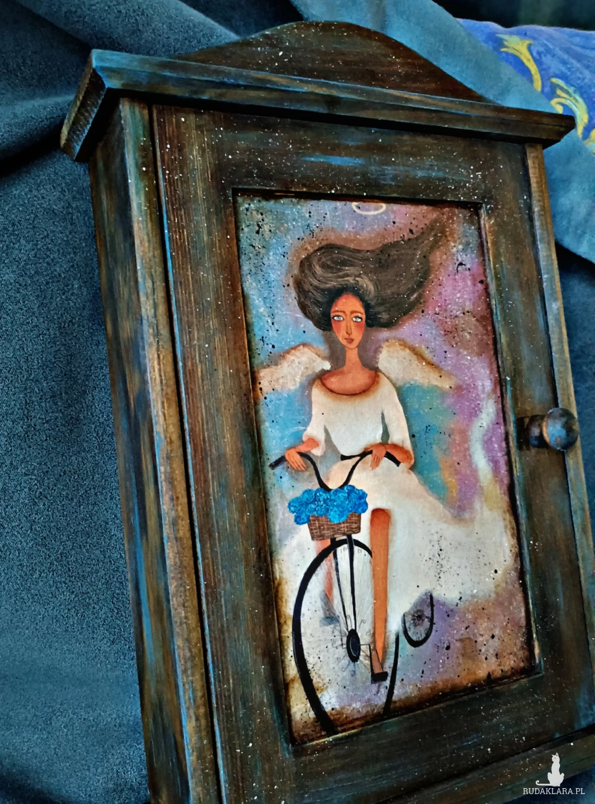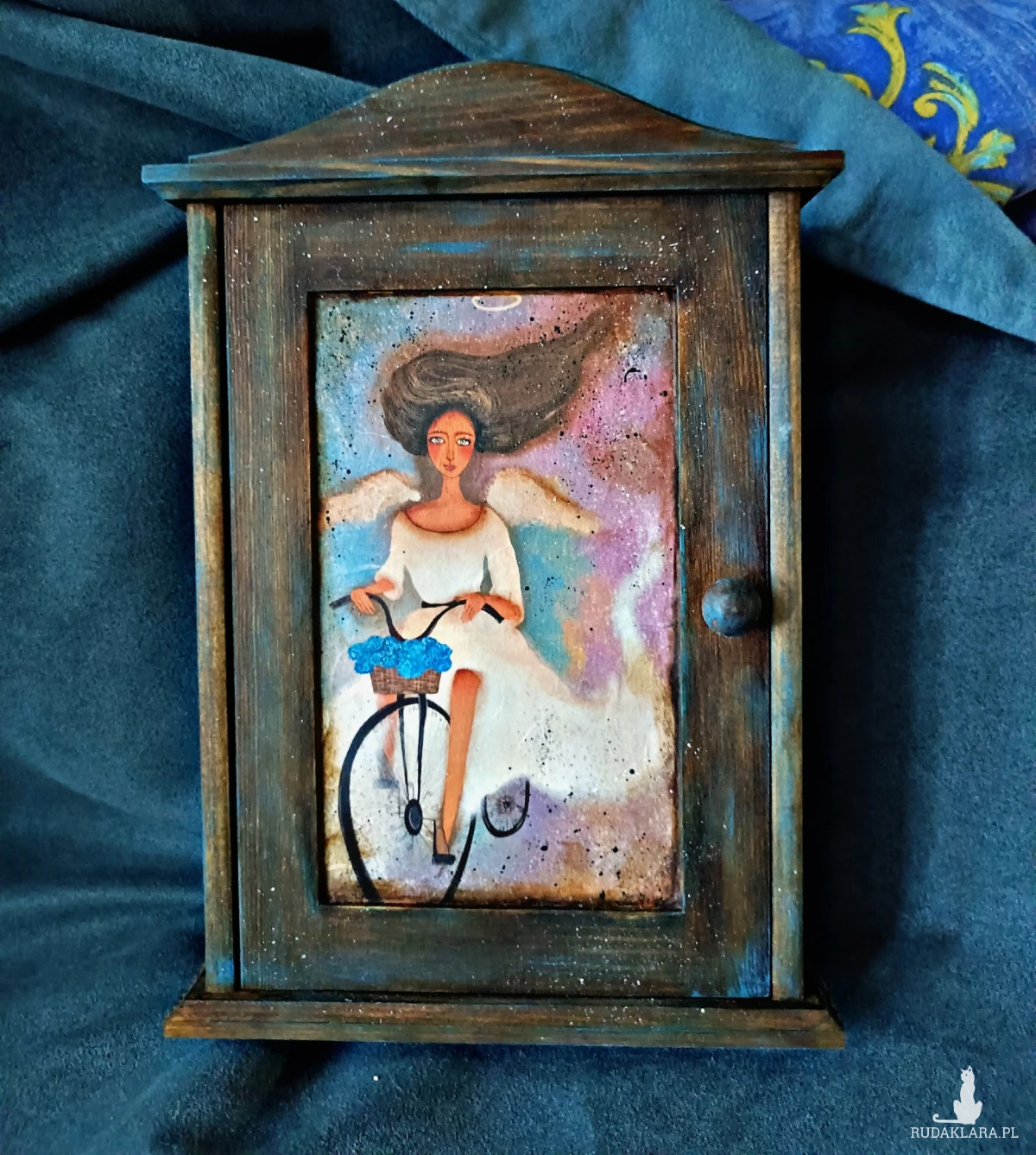 Drewniana skrzyneczka na klucze. Zdobiona za pomocą techniki decoupage (wzór anioła od Arabeska). Wewnątrz sześć haczyków na klucze.