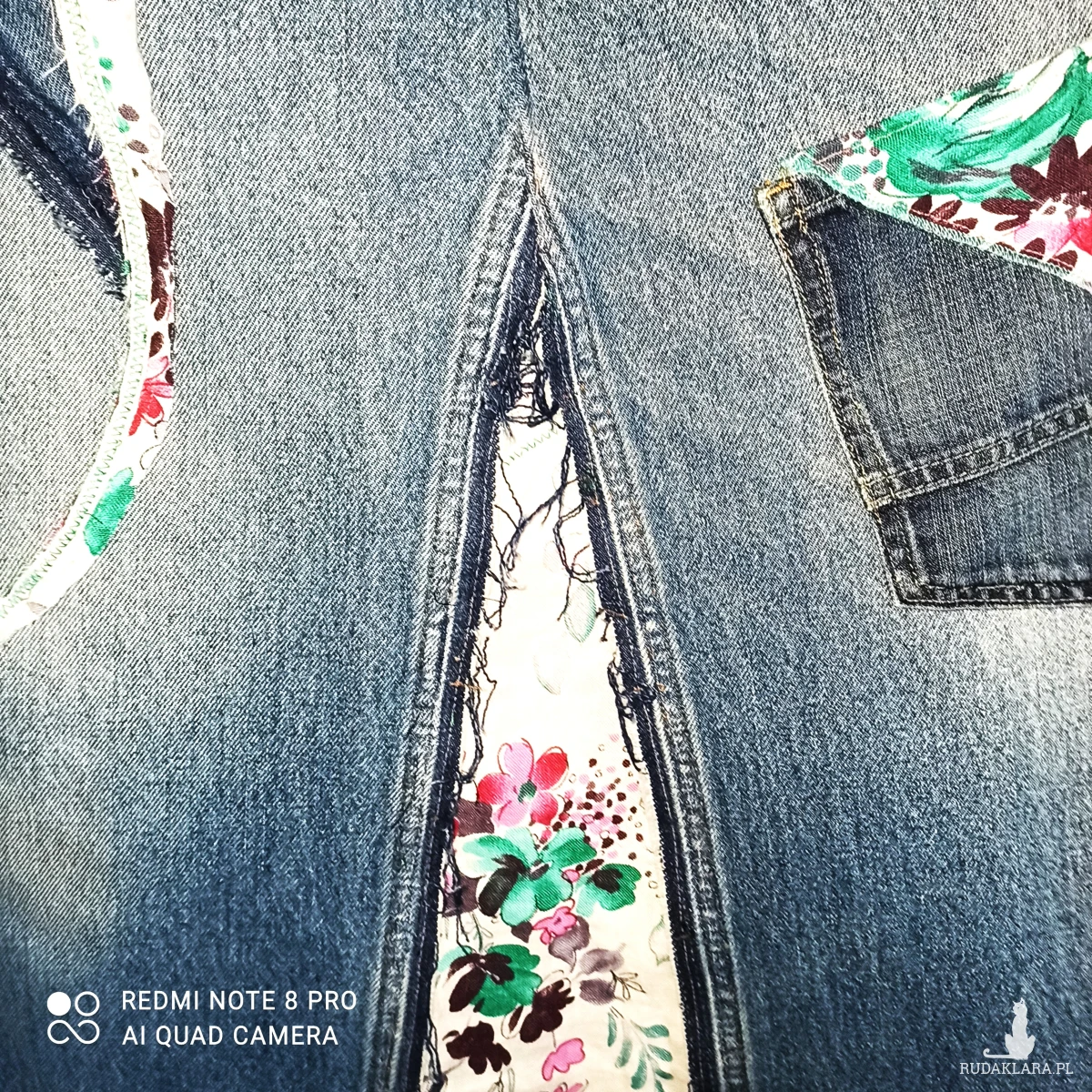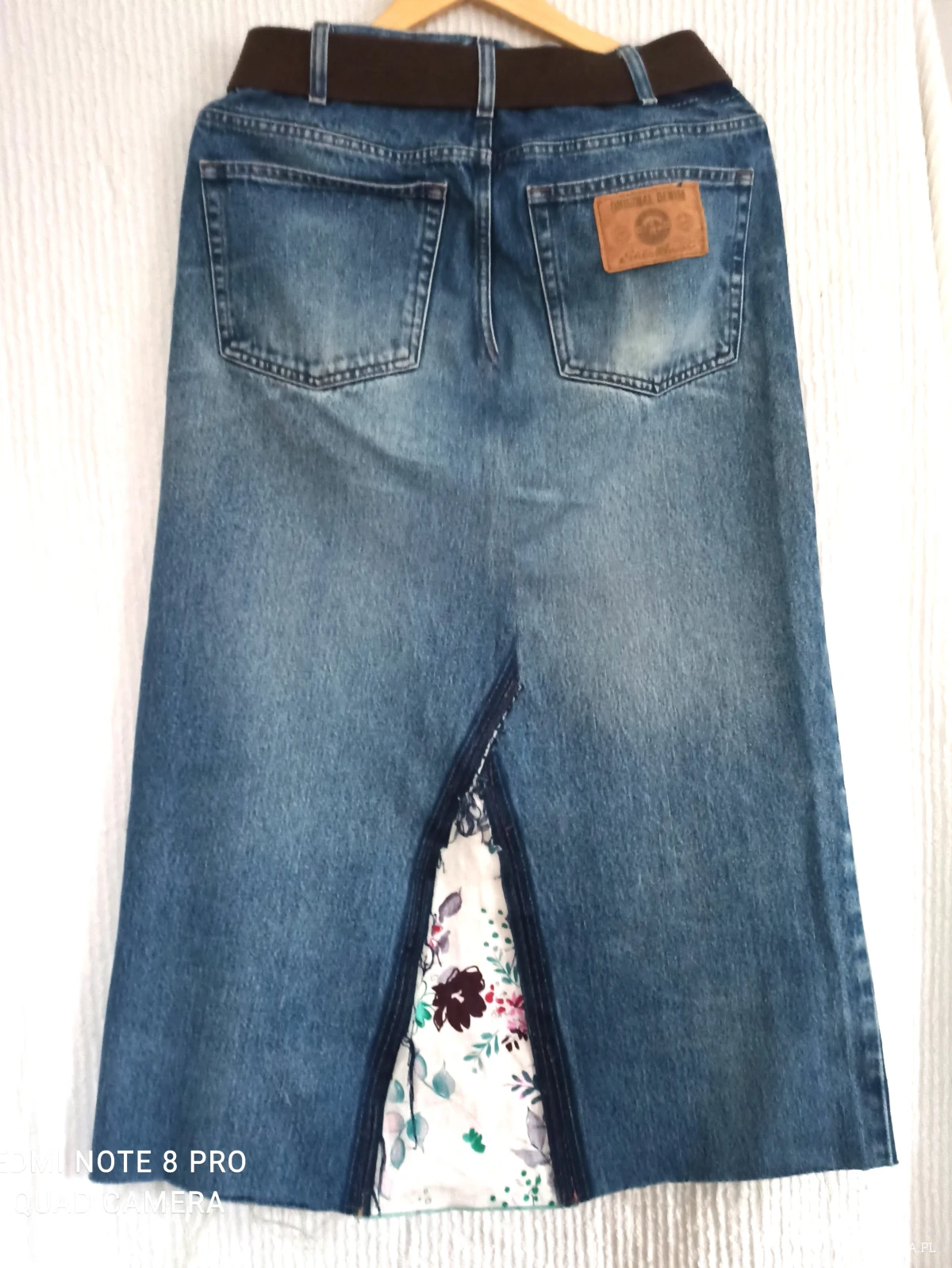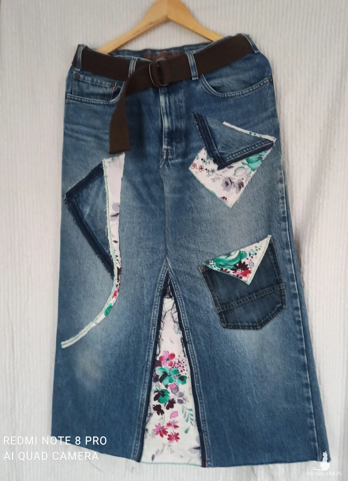 Efektowna spódnica streetwear, moda rycyklingowa. Maxi wykonana z niebieskiego denimu z rozjaśnieniami, dla kobiet lubiących oryginalne i nietuzinkowe ubrania. Jedyna w swoim rodzaju, która przyciąga wzrok. Wykonana metodą patchworkową z wykorzystaniem pięknego lnu z motywem kwiatowym na białym tle. U dołu rozszerzona klinami tej tkaniny. Rozrzucone wstawki lniane i denim. Z przodu cztery kieszenie, w tym jedna mała. Tył z dwiema kieszeniami. Na łączeniu tkanin postrzępienia, dodające nietuzinkowego wyglądu. Pasek parciany w zestawie w kolorze brązowym do regulowania obwodu w talii.Wykonana ręcznie bardzo estetycznie. Idealny model dla osób, które lubią wyrażać swój styl. Elegancki strój sportowy jak również na ważne spotkanie np. biznesowe. Dzięki takiemu zestawieniu spódnica tworzy odważny, a zarazem kobiecy look. Starannie wykonana spódnica, gotowa znaleźć się w Twojej garderobie. Denim pochodzi z recyklingu, dzięki czemu zyskuje nowe życie. Można prać.
