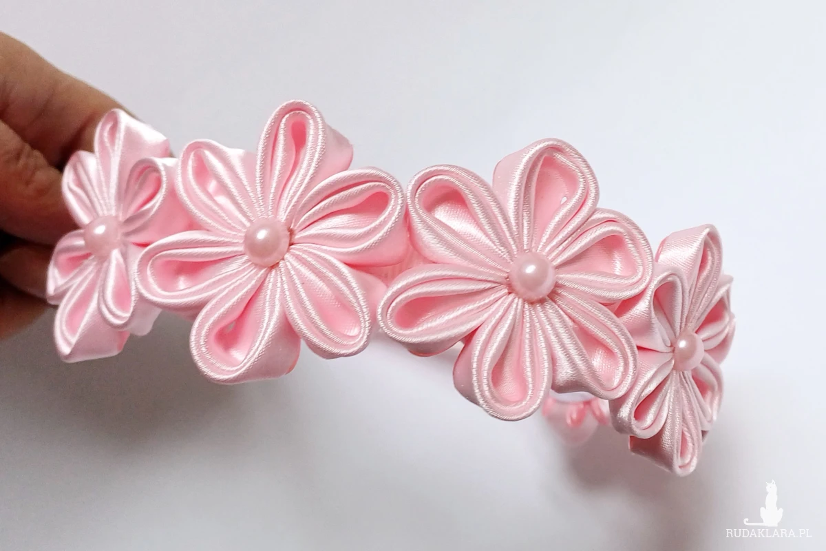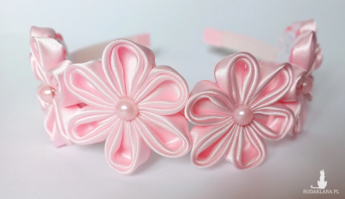 Kwiaty na opasce wykonuję z tasiemek tradycyjną japońską techniką tsunami i były częścią ozdobnych szpilek - kanzashi. Dzisiaj ta technika służy mi do tworzenia współczesnych ozdób na włosy twojego dziecka.