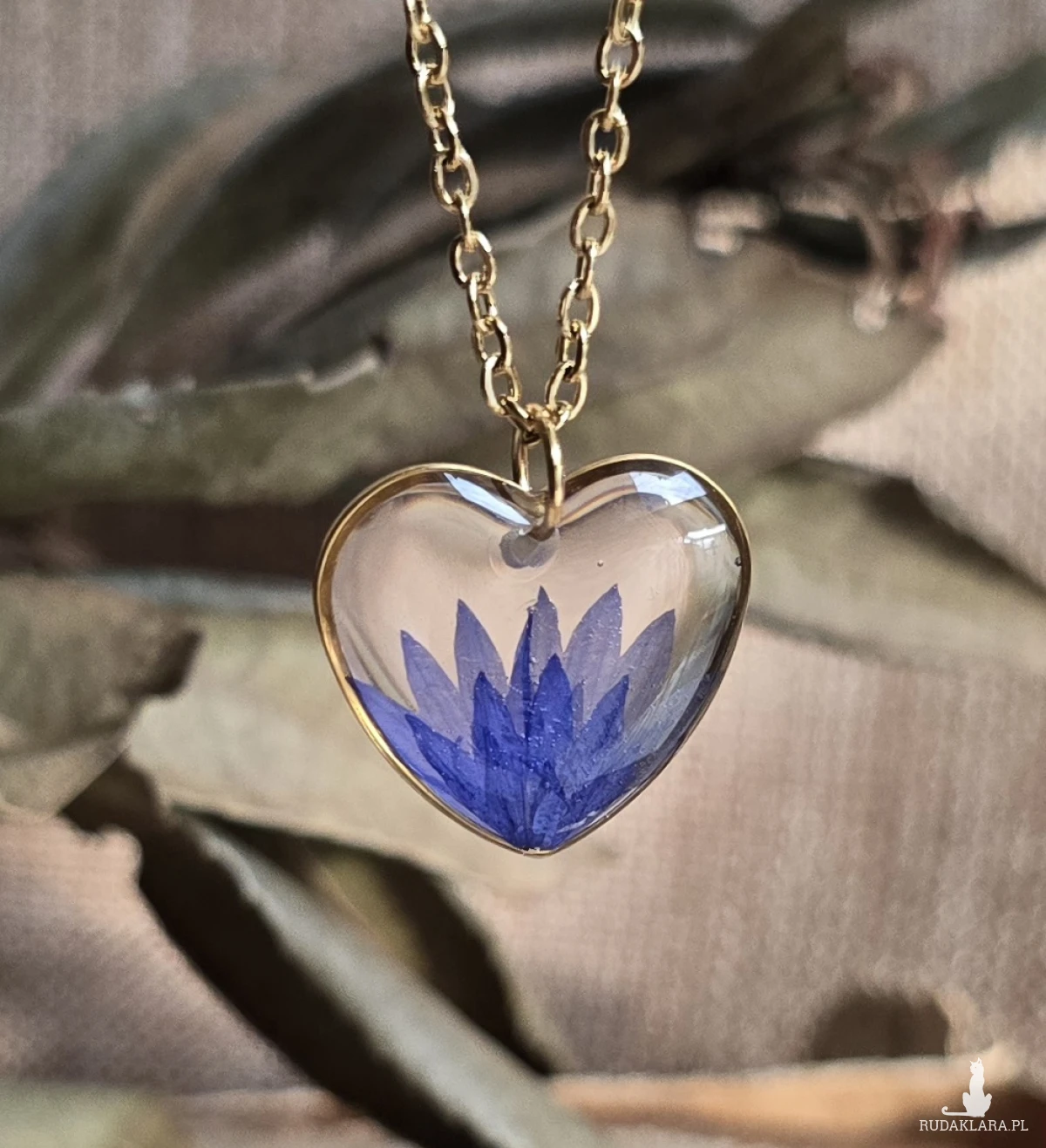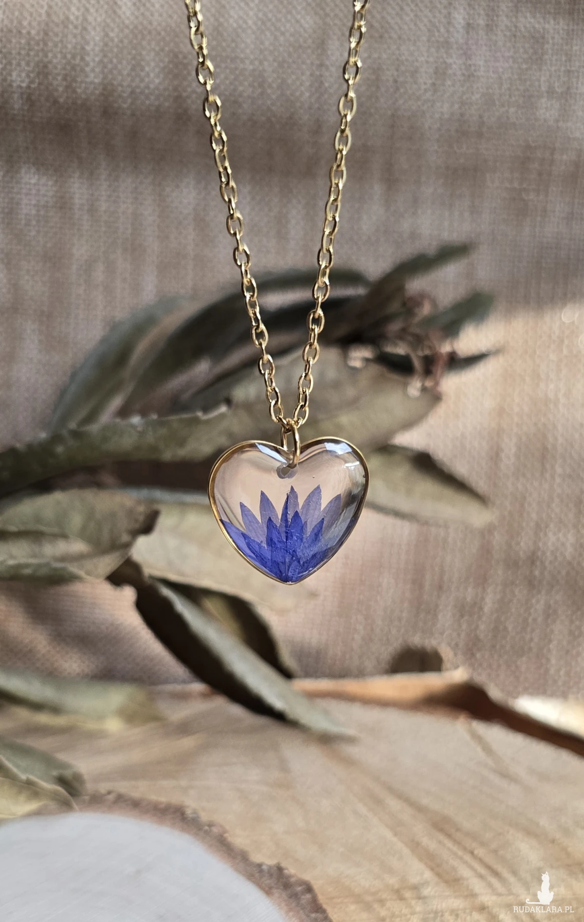 złota zawieszka złoty wisiorek kwiat naszyjnik żywica z żywicy kwiaty serce serduszko chabry z chabrami niebieskie