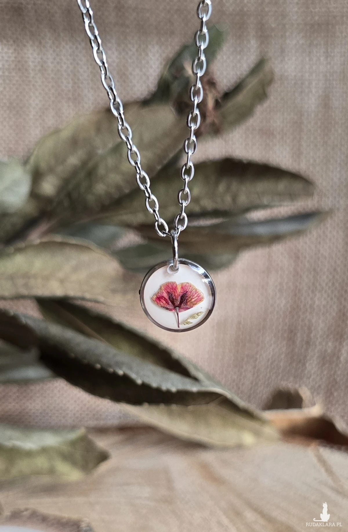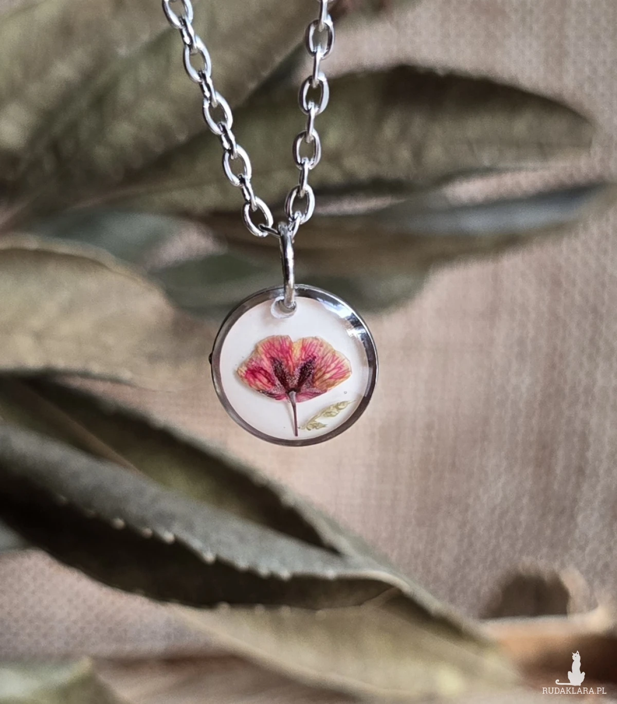 Oferuję Państwu unikalną biżuterię. Zawieszka jest wykonana z suszonych kwiatów i żywicy epoksydowej. Biżuteria jest wspaniałym i oryginalnym prezentem na lata.
