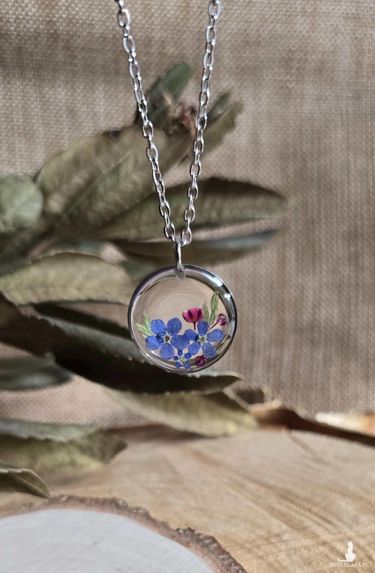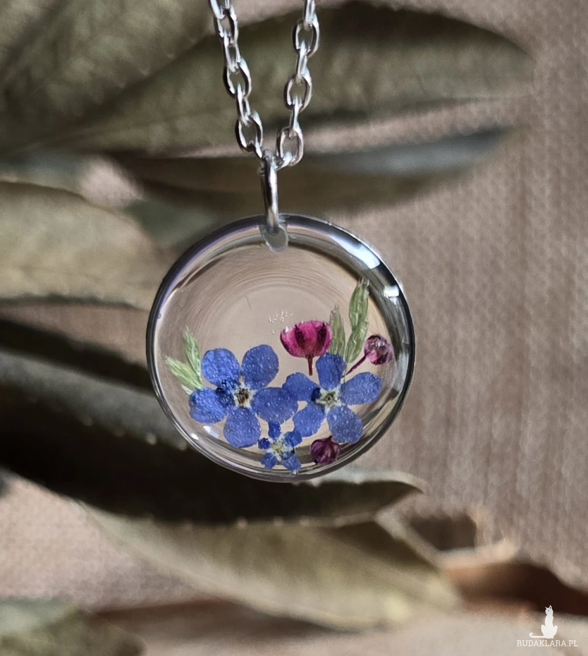 Oferuję Państwu unikalną biżuterię. Zawieszka jest wykonana z suszonych kwiatów i żywicy epoksydowej. Biżuteria jest wspaniałym i oryginalnym prezentem na lata.