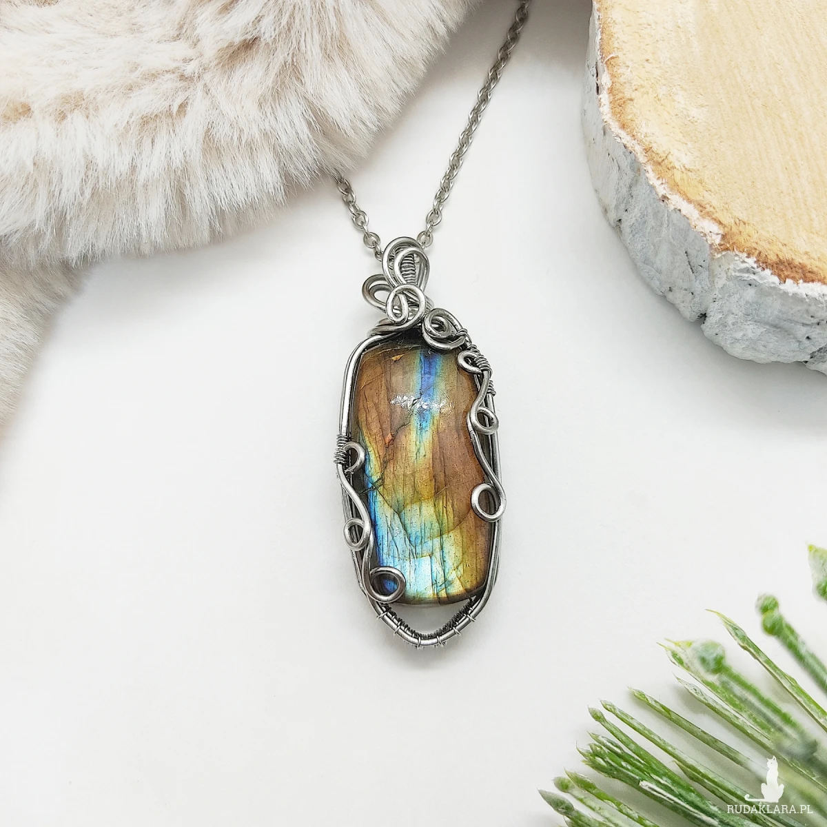 Naszyjnik Labradoryt Wielokolorowy ręcznie robiony. Wykonany techniką wire wrapping z drutów ze stali chirurgicznej. Kamień pod odpowiednim kątem mieni się na złoty kolor.