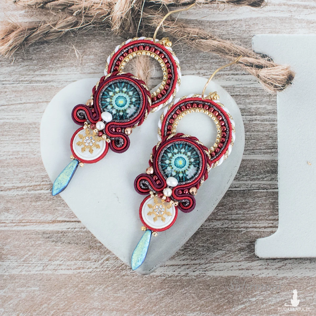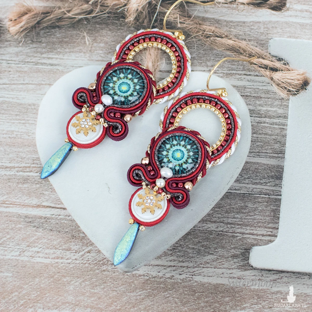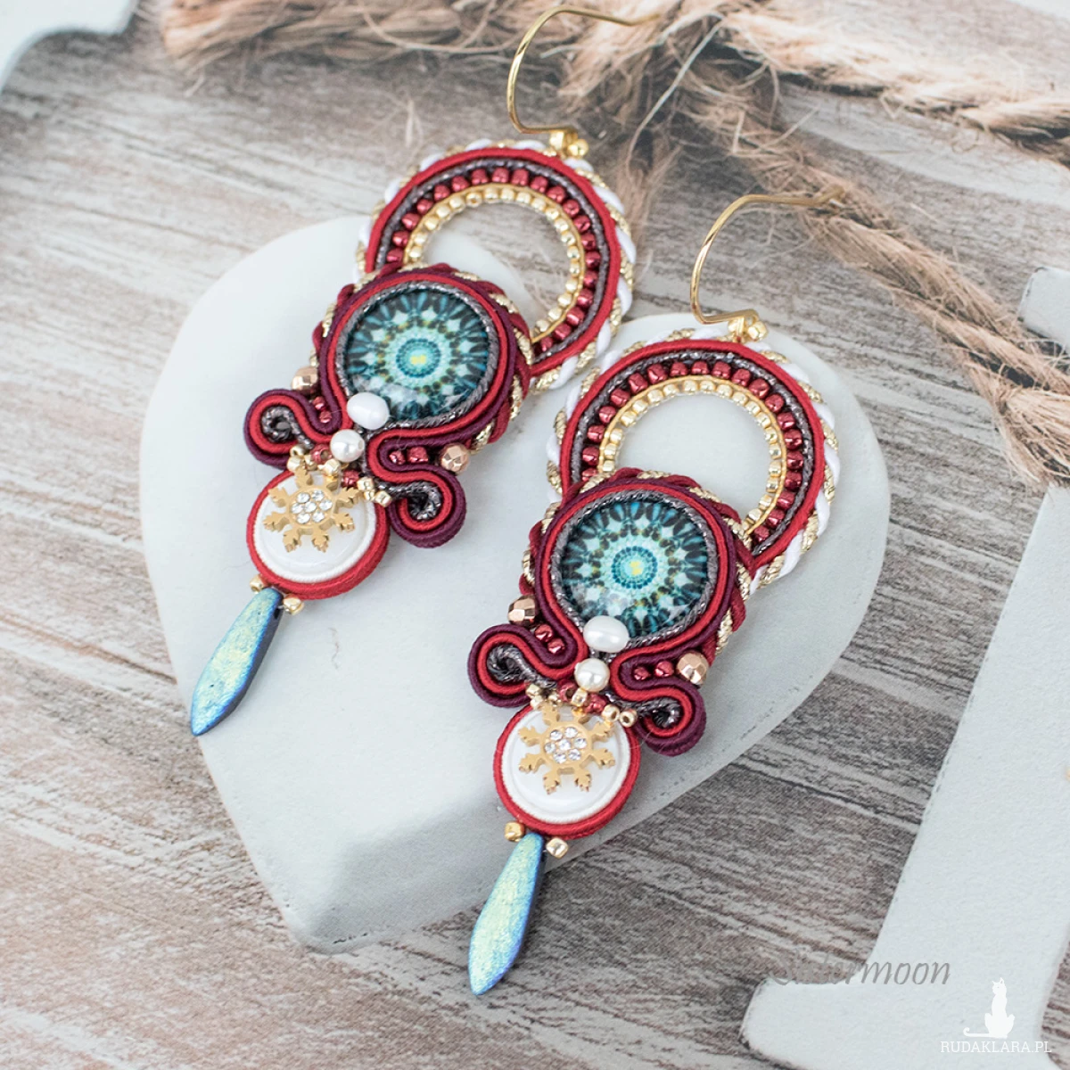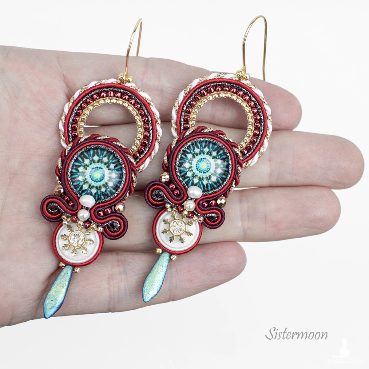 Świąteczne Kolczyki sutasz Gwiazdki. Średniej długości kolczyki sutasz z kolekcji zimowej. Szklane kaboszony z grafiką, masa perłowa, perełki rzeczne, perły Swarovskiego, fasetowane hematyty, czeskie i japońskie koraliki szklane, złote gwiazdki zawieszki stal szlachetna, bigle ze stali szlachetnej. Długość bez bigla 6,5 cm, szerokość 2,5 cm. Tył wykończony naturalną skórką.