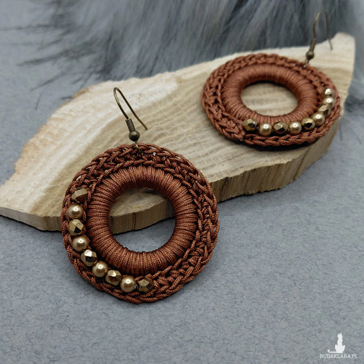Kolczyki są w kolorze brązowym z naszytymi szklanymi koralikami fire polish oraz perełkami Swarovskiego w kolorze złotym.