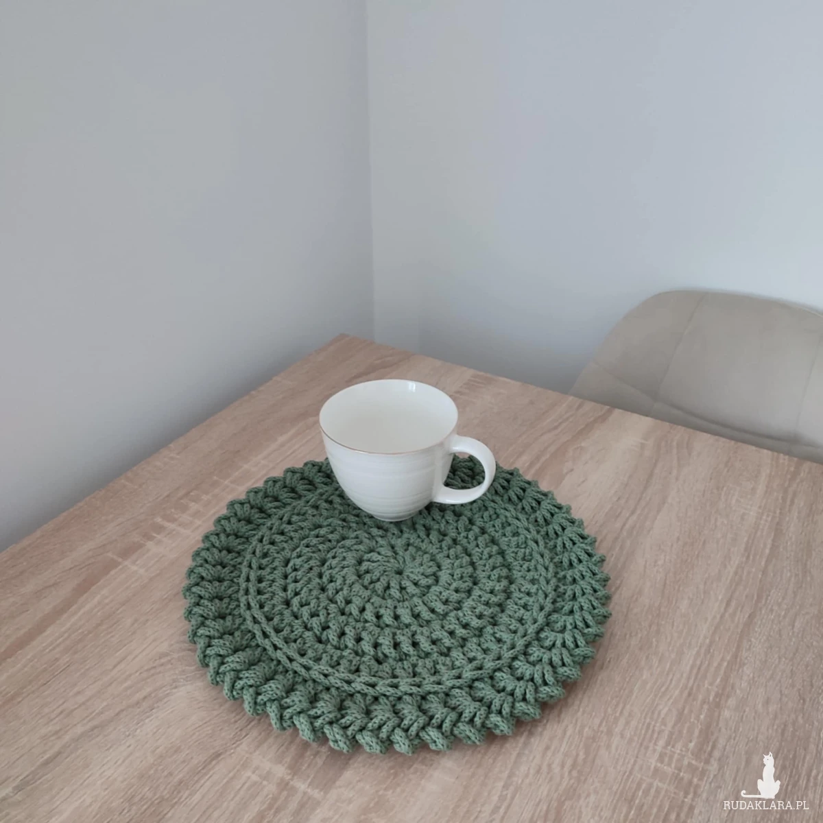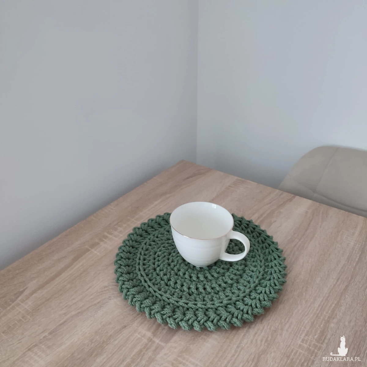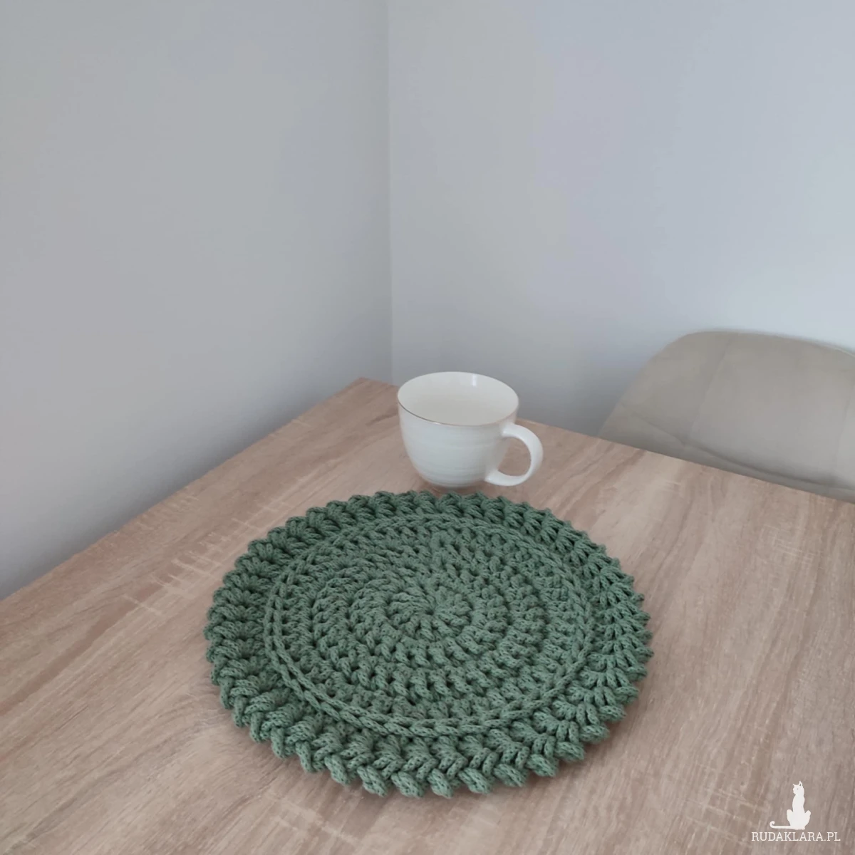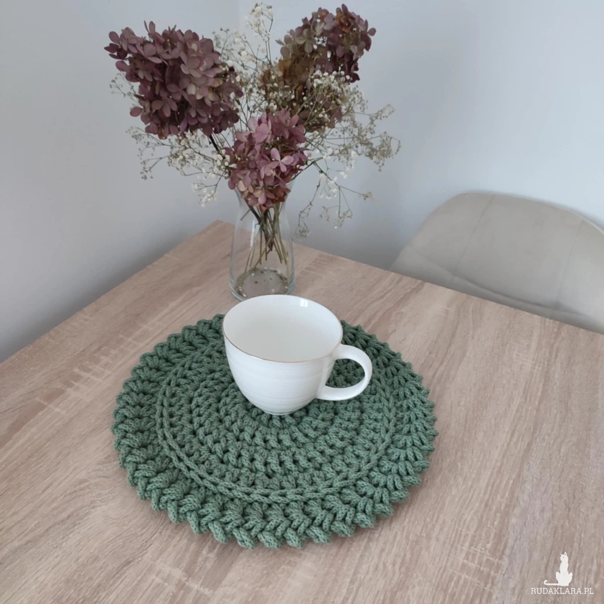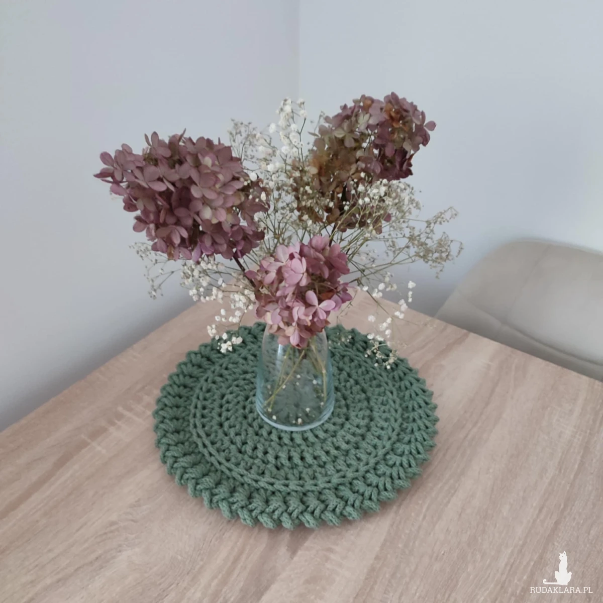 Podkładka o średnicy 33cm, wykonana metodą szydełkowania z polskiego sznurka bawełnianego 5mm.