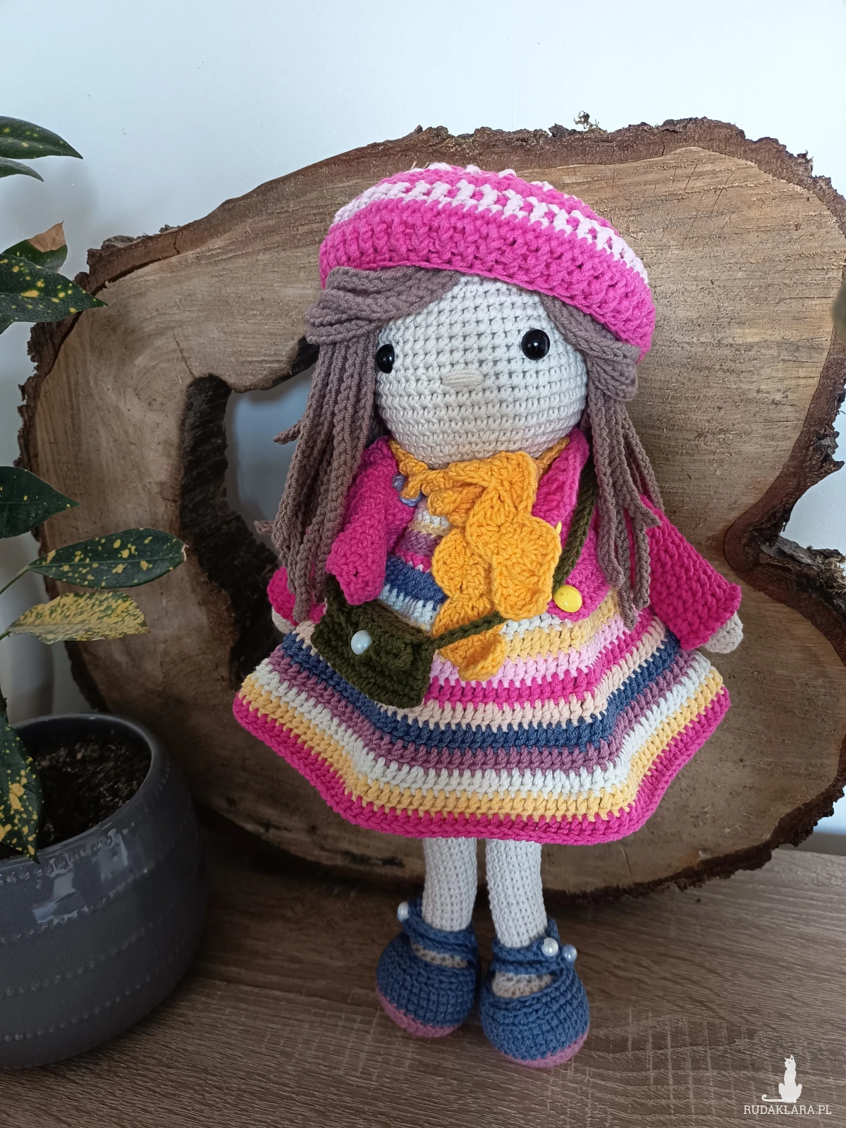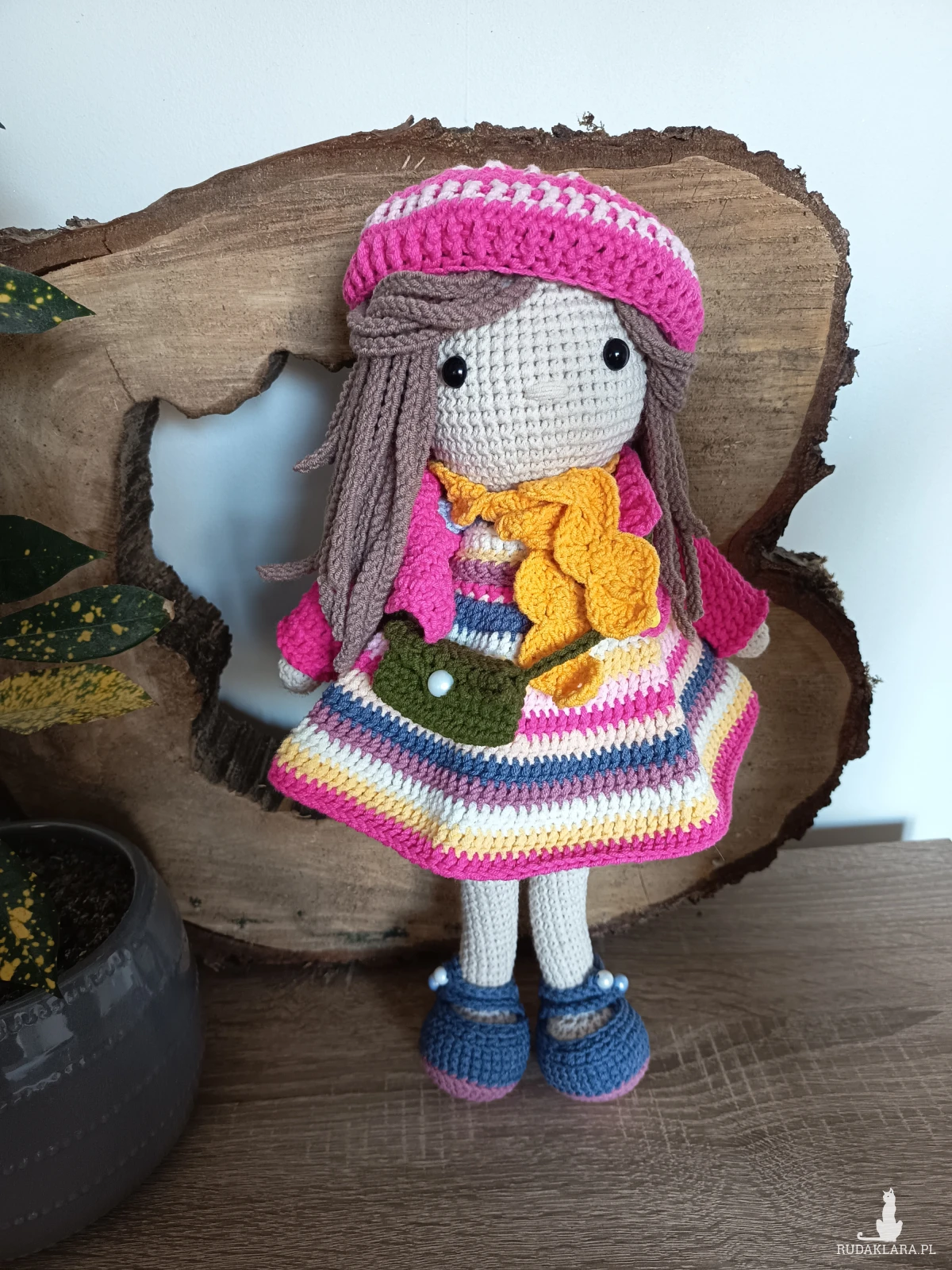 Unikatowa, ręcznie robiona szydełkowa lalka o wysokości ok. 37 cm. Wykonana z dużą starannością z wysokiej jakości włóczki YarnArt Jeans – miękkiej, trwałej i przyjemnej w dotyku, z przewagą bawełny.