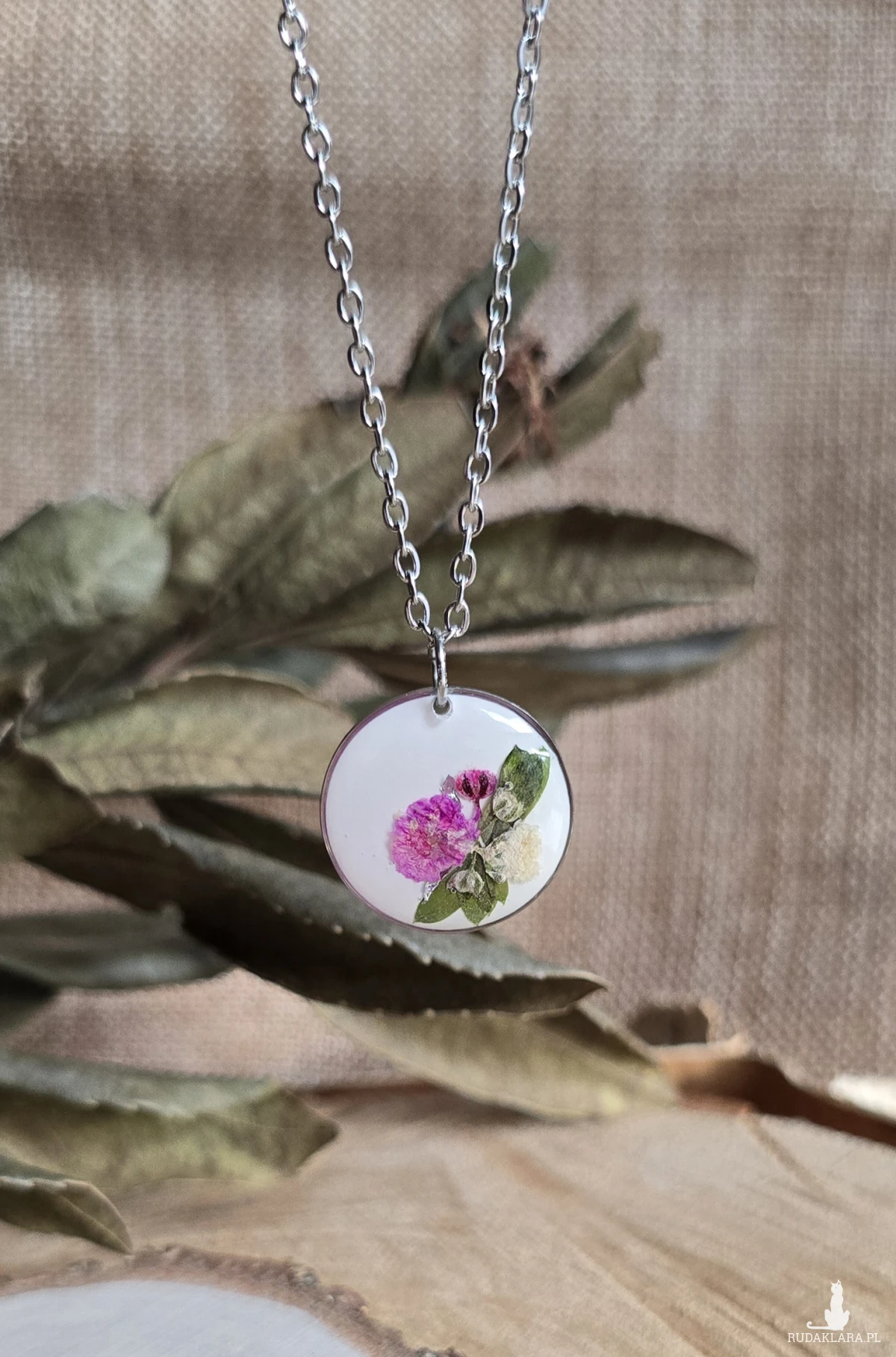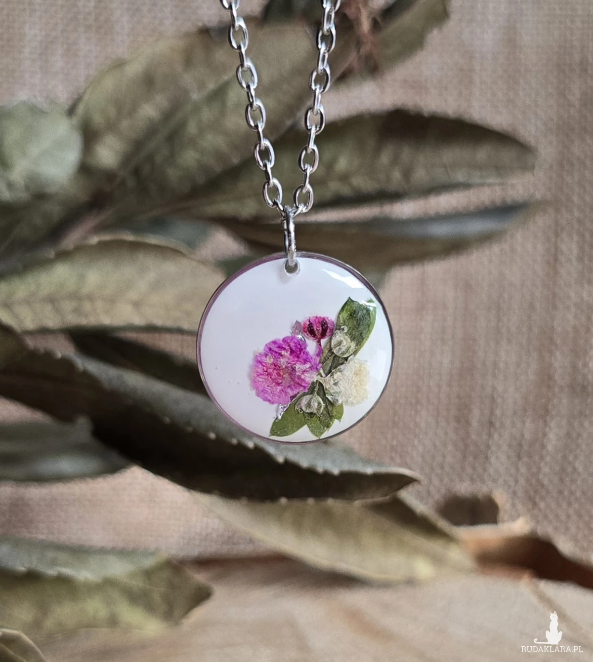 Oferuję Państwu unikalną biżuterię. Zawieszka jest wykonana z suszonych kwiatów i żywicy epoksydowej. Biżuteria jest wspaniałym i oryginalnym prezentem na lata.