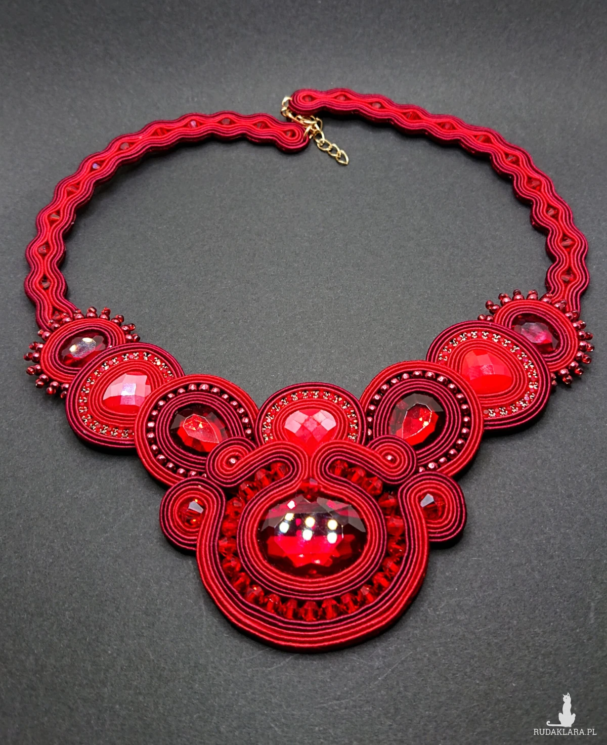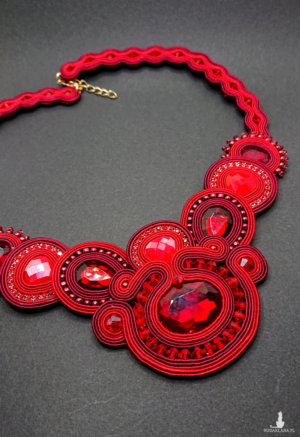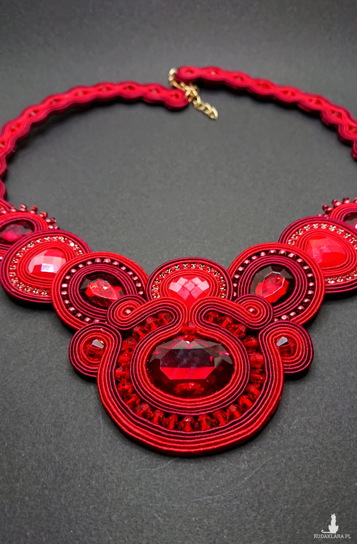 Fasetowane błyszczące kryształki otoczone sznurkami sutasz w odcieniu czerwieni i koloru bordowego oraz szklanymi koralikami o różnych kształtach i wielkościach. Naszyjnik uzupełnia taśma z cyrkoniami, która nadaje jeszcze więcej blasku. Naszyjnik posiada regulowaną długość przy zapięciu.