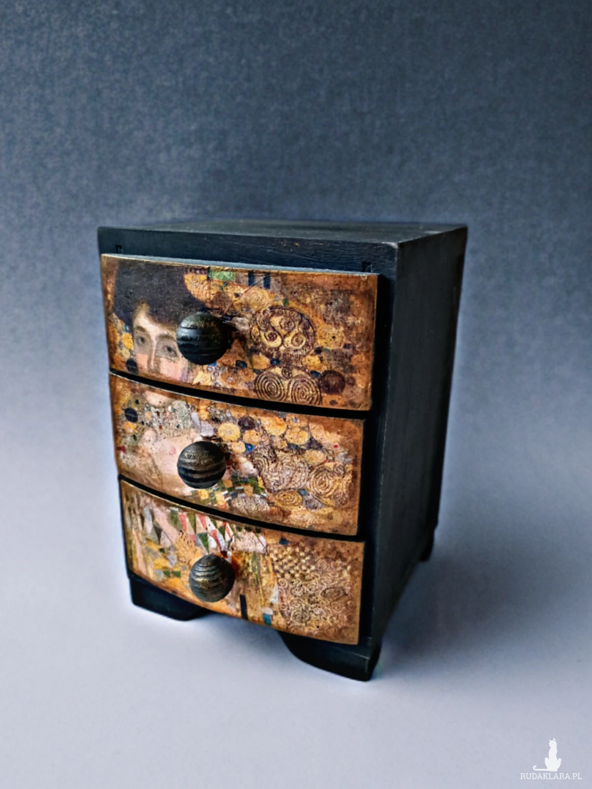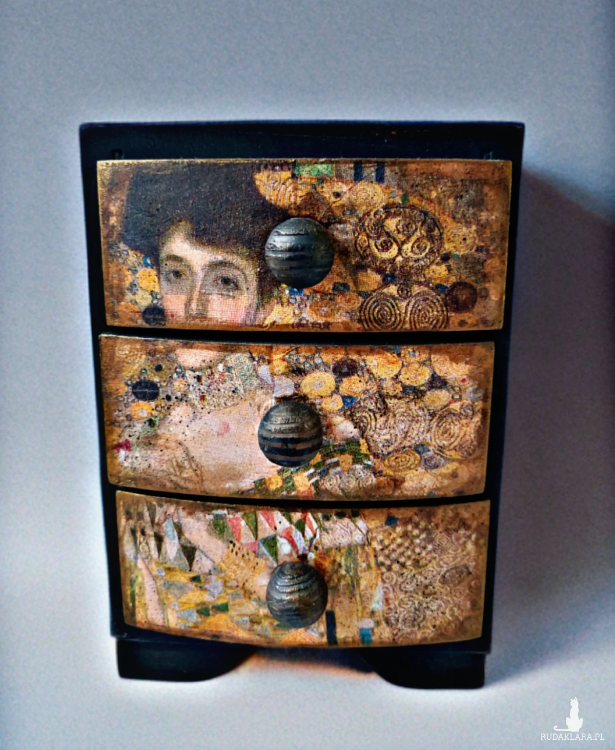 Drewniana szkatułka na biżuterię w kształcie małej komódki, z trzema szufladkami.