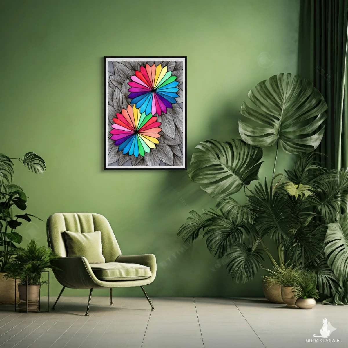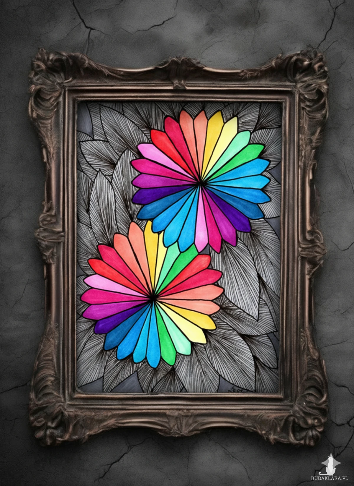Dynamiczna, jaskrawa ilustracja przedstawiająca dwa duże, stylizowane kwiaty w kształcie promienistych gwiazd. Oba kwiaty mają płatki we wszystkich kolorach tęczy tworząc efekt wibrującego spektrum.