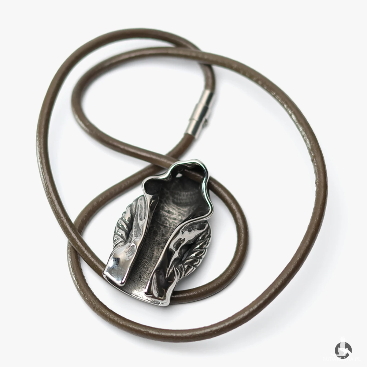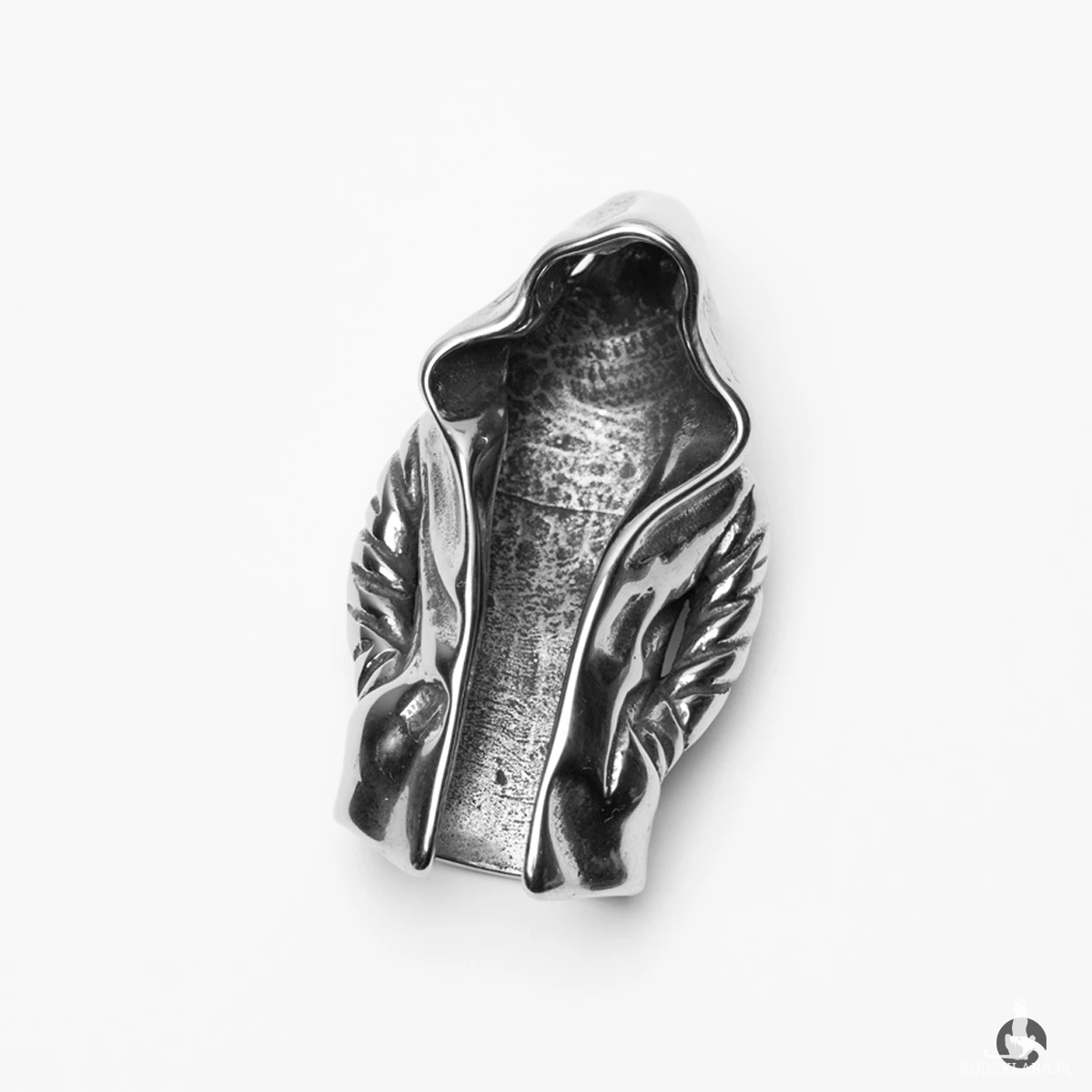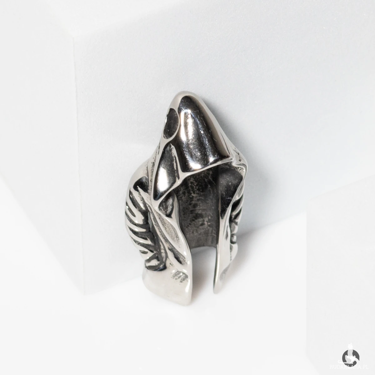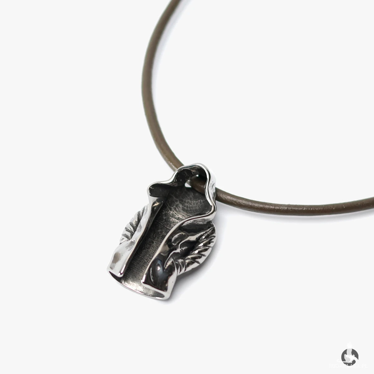 Naszyjnik z zawieszką w kształcie peleryny z kapturem, symbolizującą postać zamaskowanego wojownika lub zabójcy. Wykonany z trwałej i odpornej na korozję stali szlachetnej 316L. Detale skrzydeł na ramionach dodają zawieszce charakteru i głębi, a subtelne przyciemnienie wewnątrz kaptura podkreśla jej tajemniczy wygląd. Całość zawieszona na brązowym rzemieniu, który świetnie kontrastuje z chłodnym odcieniem metalu i nadaje naszyjnikowi surowy, vintage'owy charakter.