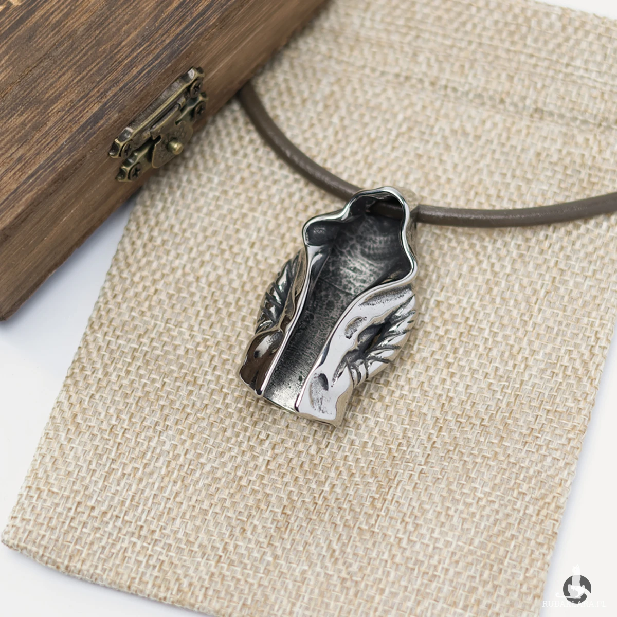 Wykonana z wysokiej jakości stali szlachetnej 316L, zawieszona na solidnym brązowym rzemieniu, doskonale podkreśla charakter noszącej ją osoby.
