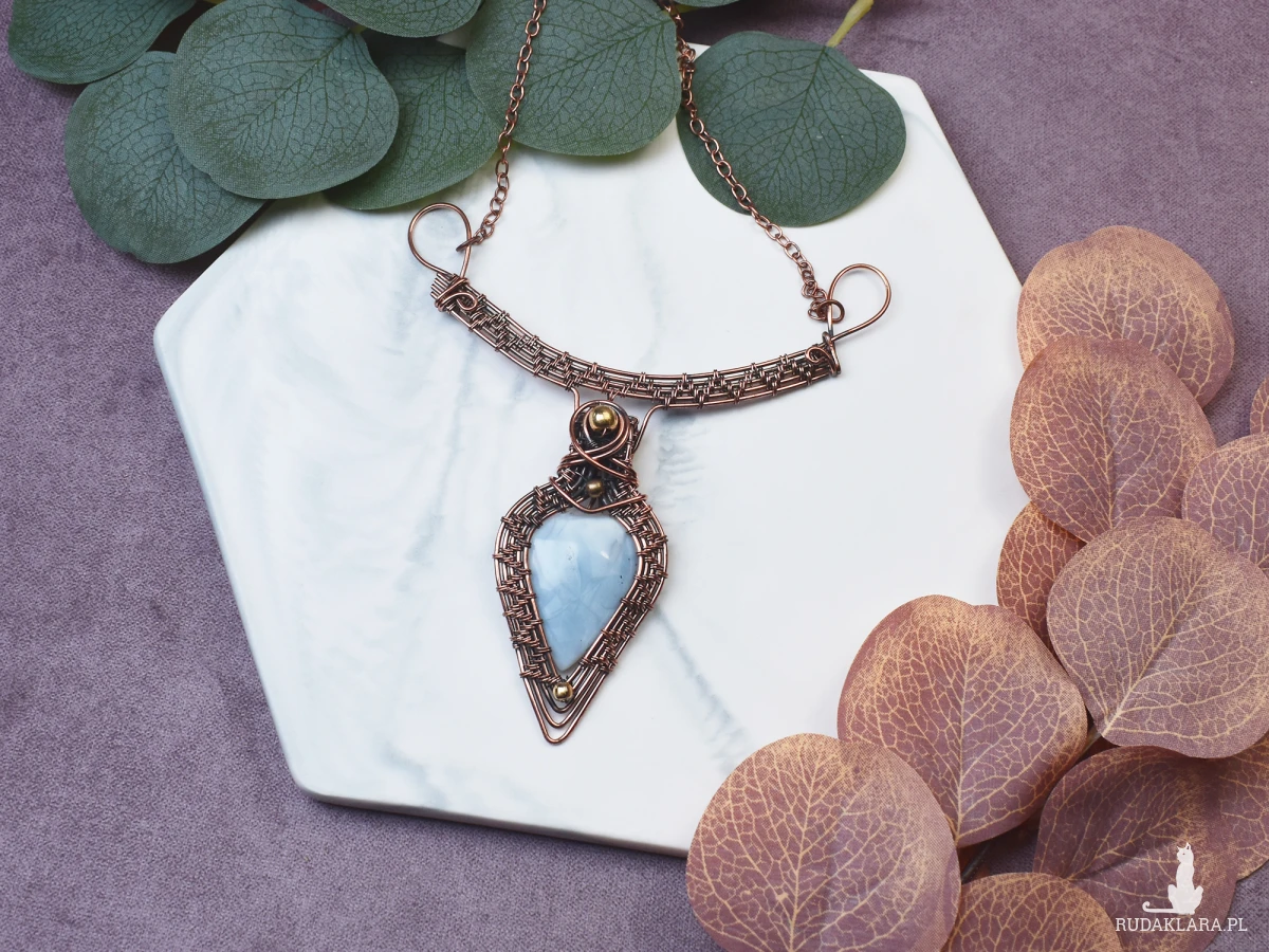 Ten miedziany naszyjnik wykonany techniką wire wrapping zachwyca prostotą i elegancją. Jego sercem jest piękny Owyhee Opal, który emanuje subtelnym blaskiem i niepowtarzalnymi refleksami. Miedź, starannie pleciona wokół kamienia, nadaje całości industrialnego uroku. Naszyjnik emanuje delikatnością i jednocześnie siłą natury, podkreślając unikalność noszącego.