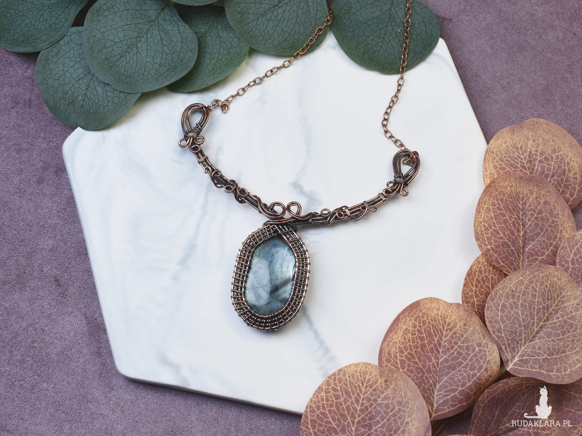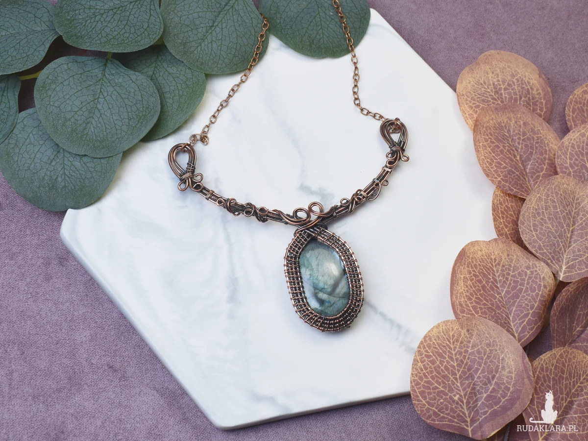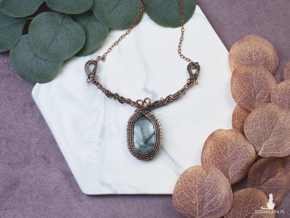 Ten uroczy naszyjnik wykonany techniką wire wrapping to delikatna kombinacja miedzi i labradorytu. Wisiorek w formie geometrycznej spirali oplata kamień, podkreślając jego naturalne piękno. Miedź nadaje całości rustykalny urok, a labradoryt, zmieniając kolory w świetle, dodaje niezwykłej magii. Kamień ten jest uznawany za symbol intuicji i ochrony, co czyni ten naszyjnik nie tylko modnym dodatkiem, ale również talizmanem energii pozytywnej. To wyjątkowe połączenie kunsztu ręcznej roboty i właściwości kamienia, które sprawia, że naszyjnik emanuje subtelnym pięknem i pozytywną energią.