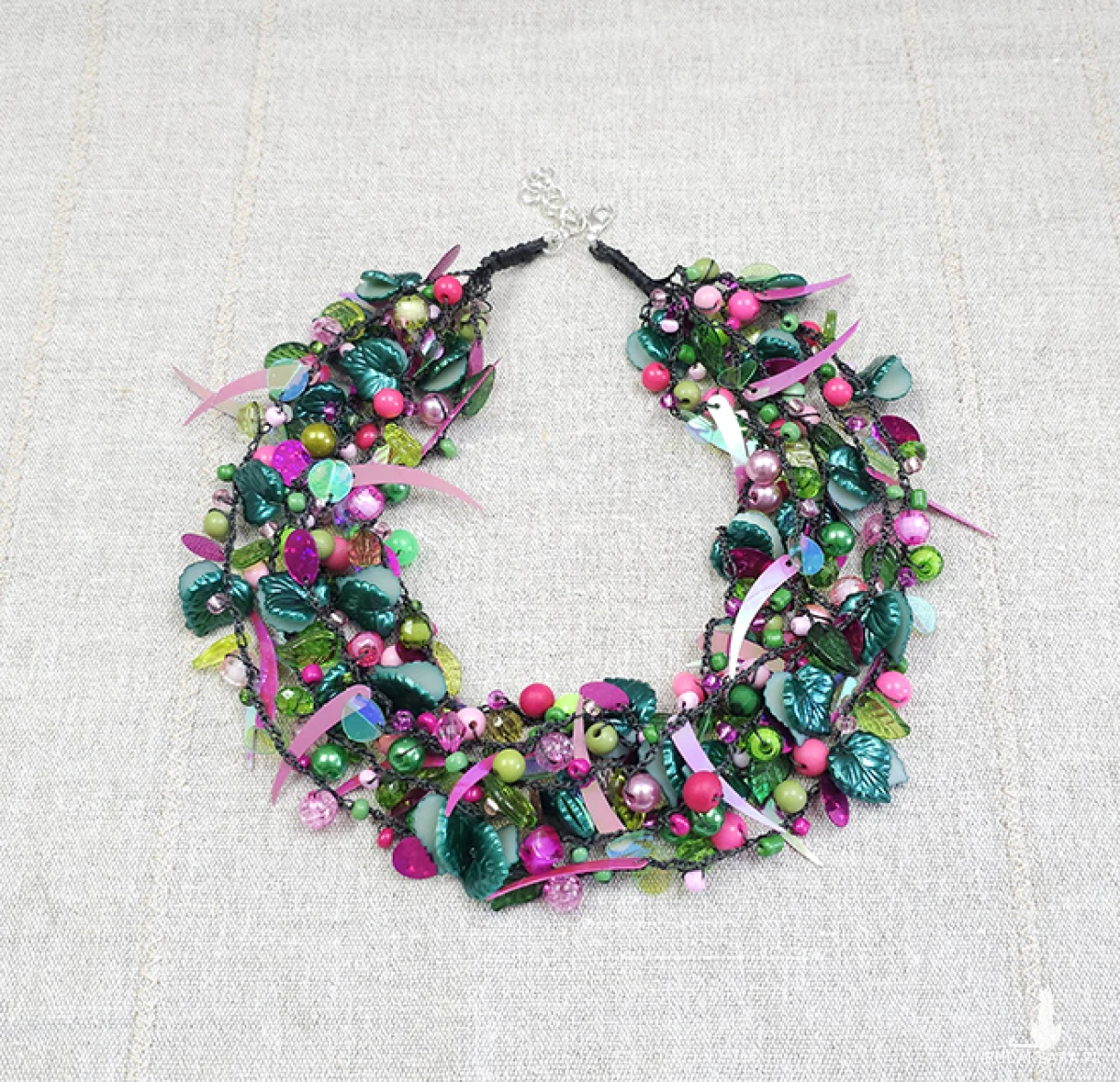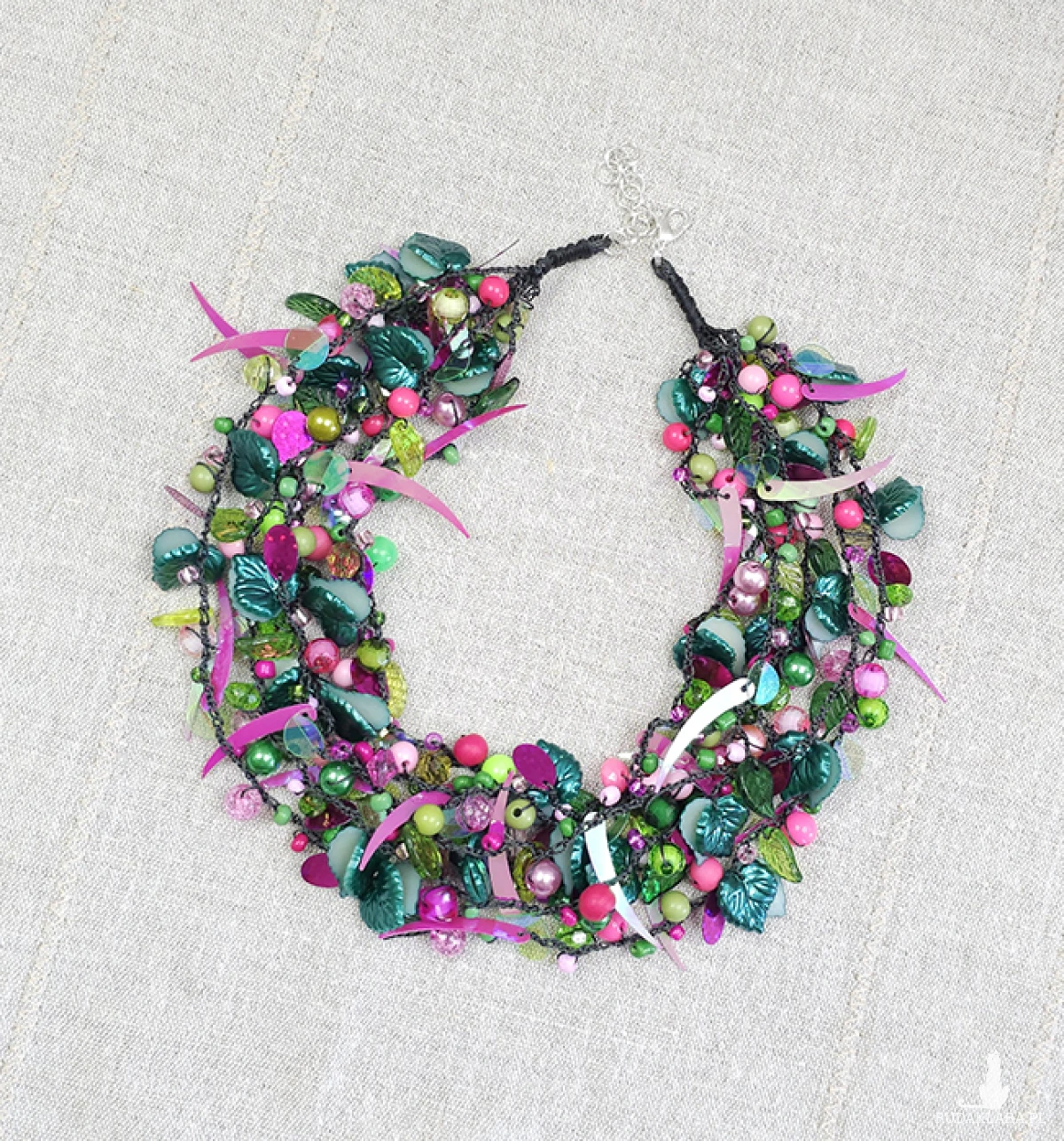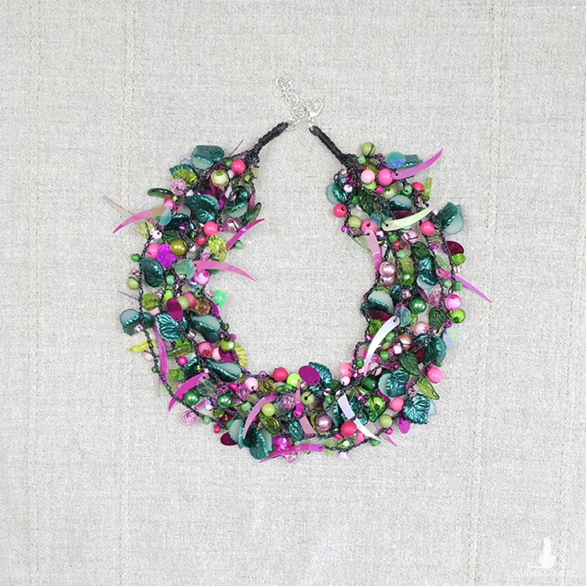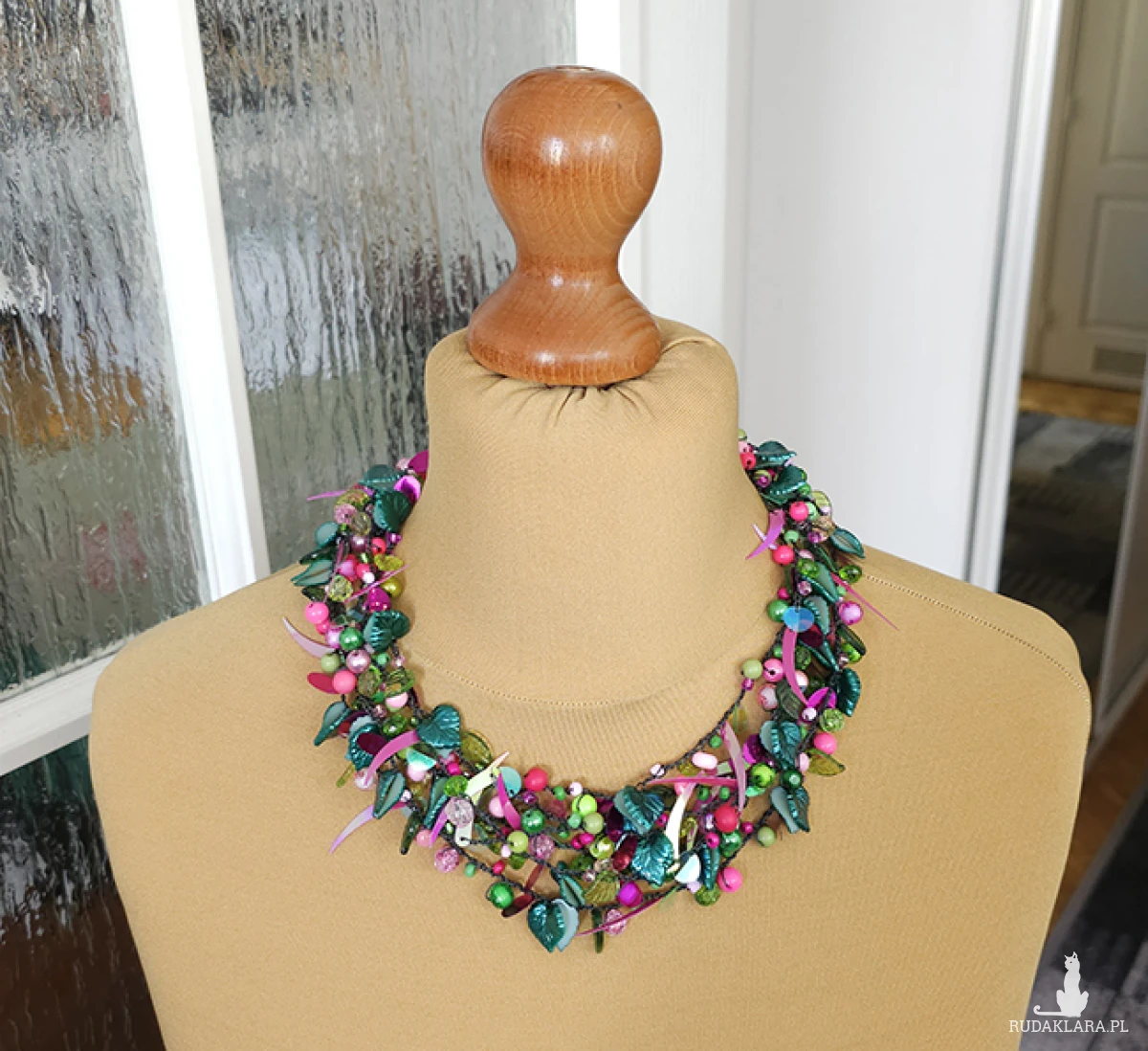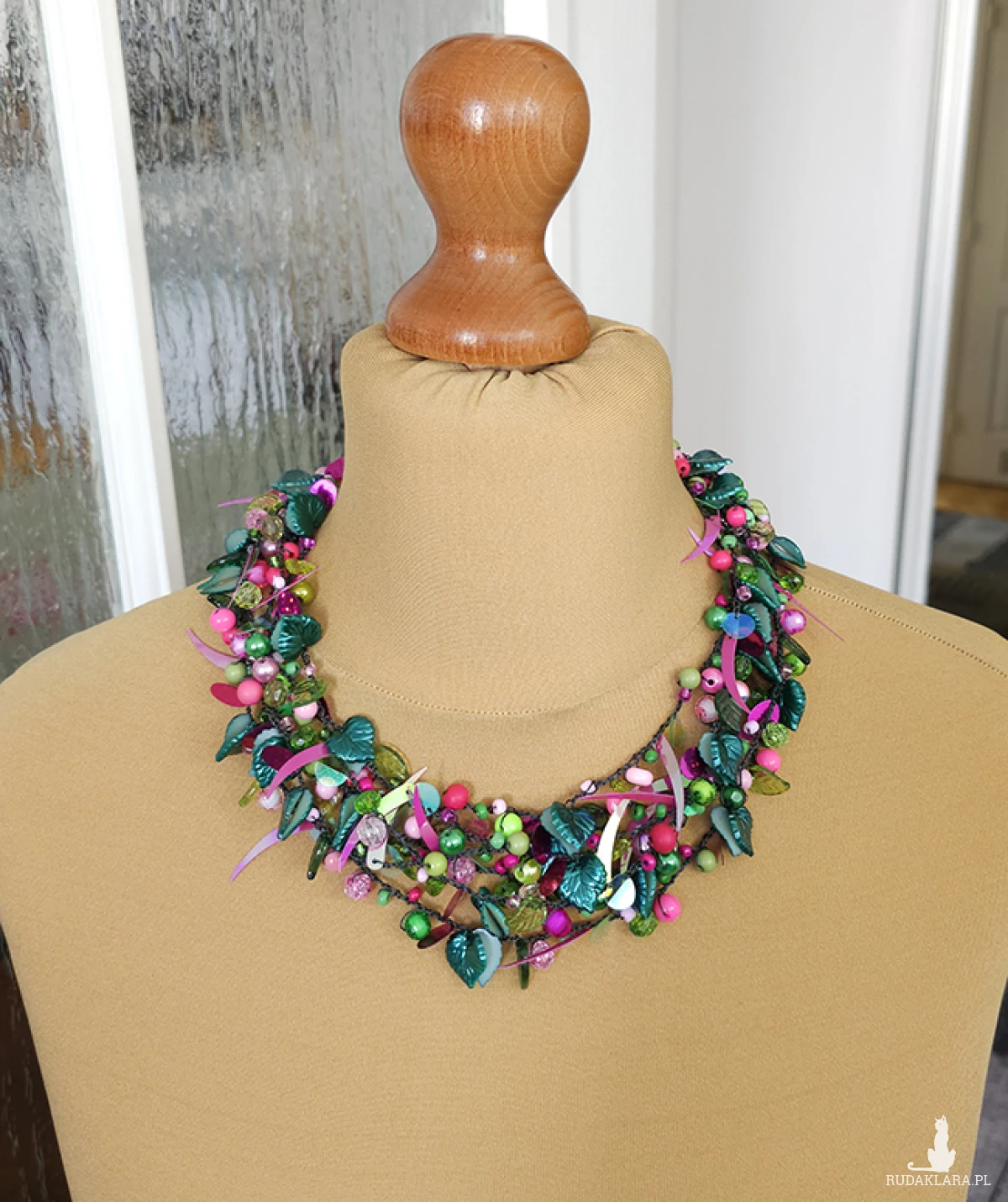 Poczuj letnią energię z naszym najnowszym naszyjnikiem! Połączenie soczystych odcieni zieleni, głębokiego turkusu i elektryzującego różu, wzbogacone o błyszczące, fasetowane elementy, przywołuje wspomnienia egzotycznych ogrodów.