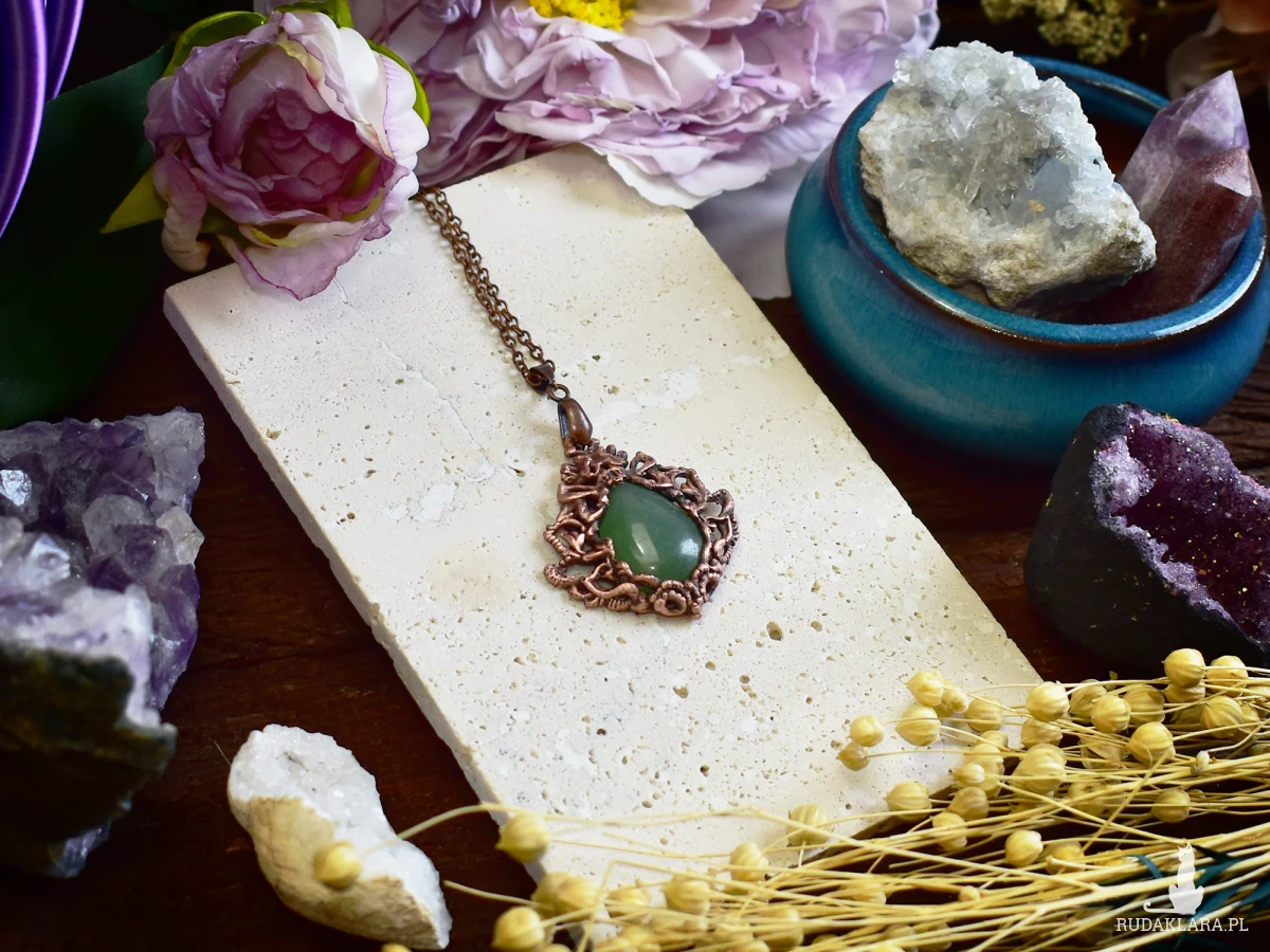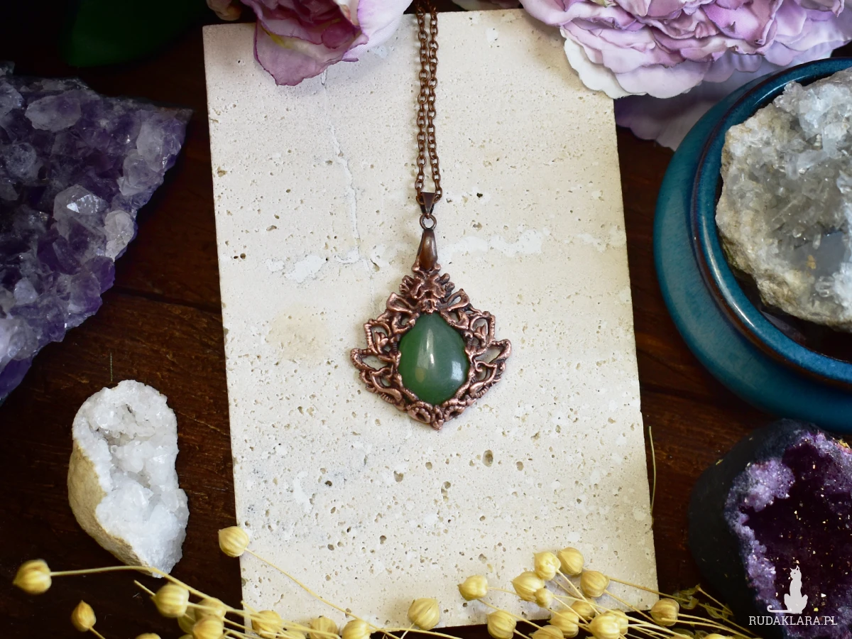 Wisiorek w stylu wiktoriańskim, wykonany techniką elektroformowania miedzi, ozdobiony awenturynem i wykończony patyną nadającą całości głębi oraz eleganckiego, postarzanego charakteru. Bogata forma i subtelne detale nawiązują do estetyki XIX wieku, w której biżuteria łączyła dekoracyjność z symboliką i kunsztem rzemiosła. Awenturyn, o swojej stonowanej zielonej barwie i delikatnym połysku, wprowadza do kompozycji harmonię i spokojny akcent, pięknie kontrastując z ciemniejszą, patynowaną miedzią. Całość tworzy nastrojowy, klasyczny wisiorek o wyraźnie historycznym charakterze, idealny dla osób ceniących biżuterię artystyczną, styl vintage i ponadczasową elegancję inspirowaną dawnymi epokami.