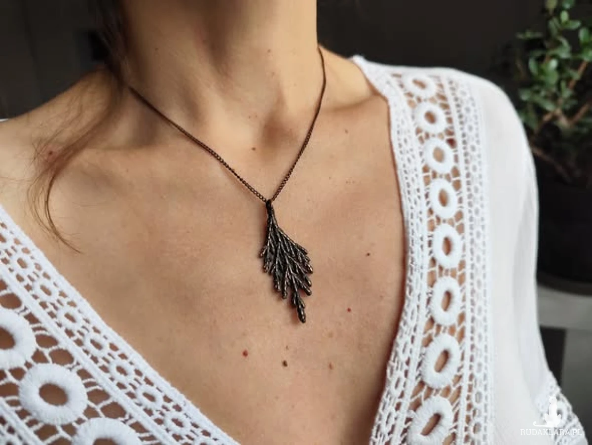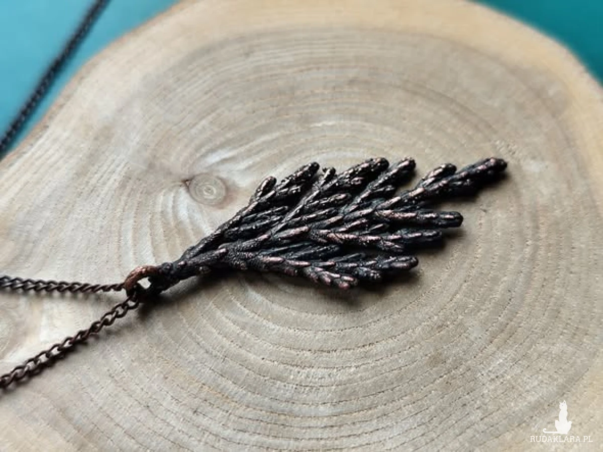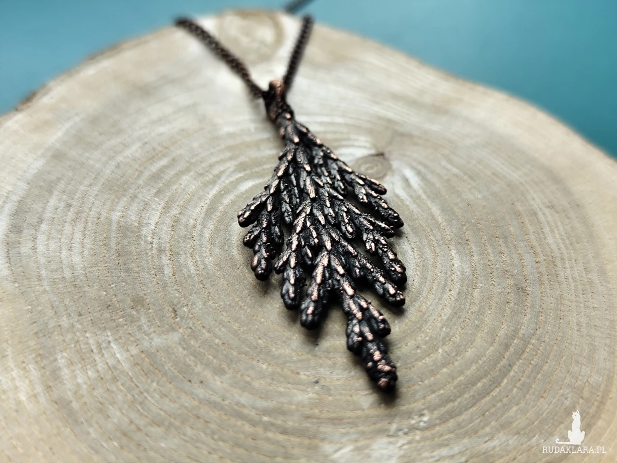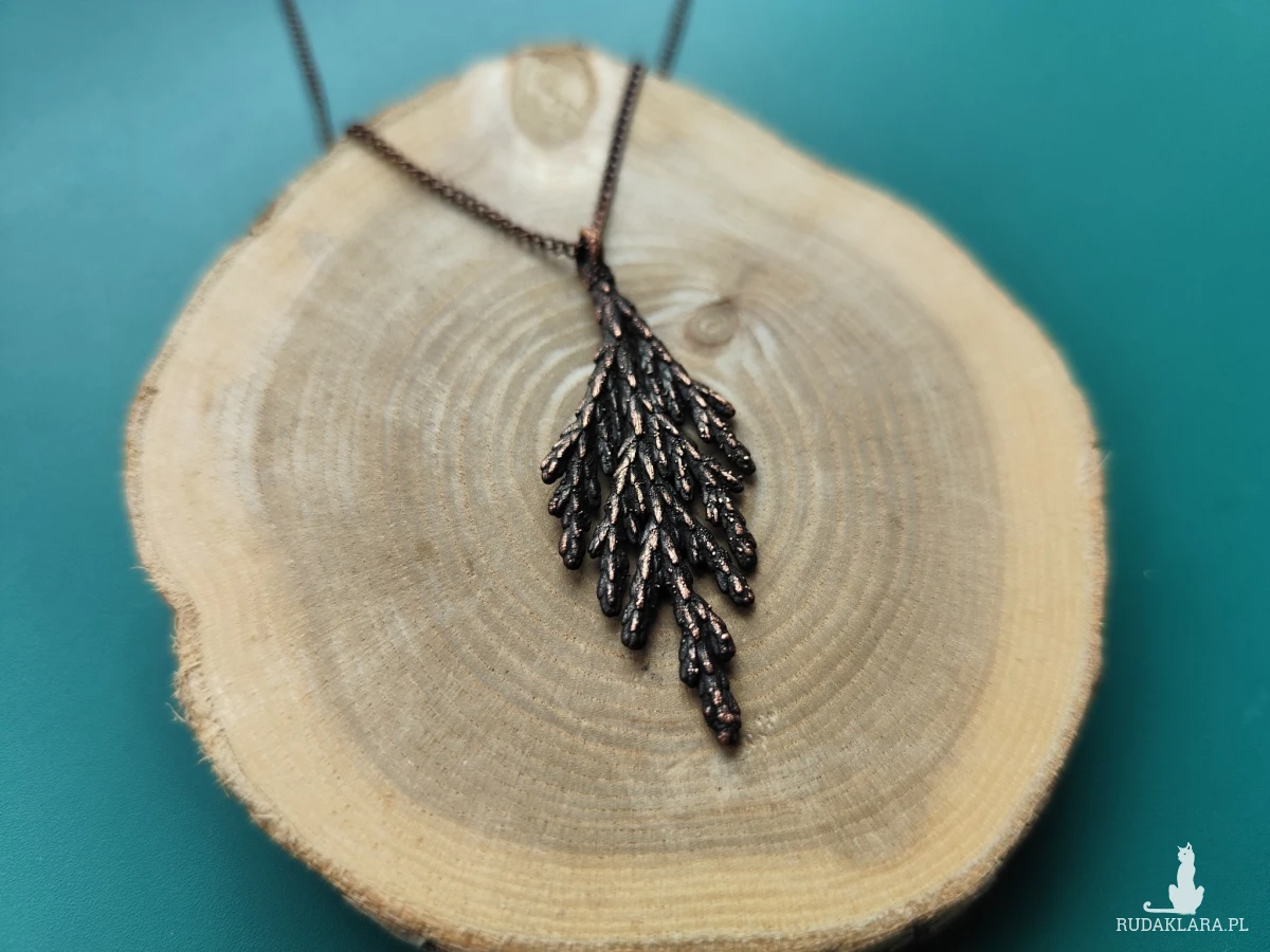 Prawdziwa gałązka cyprysiku zamknięta w miedzi. Naszyjnik z wisiorem.