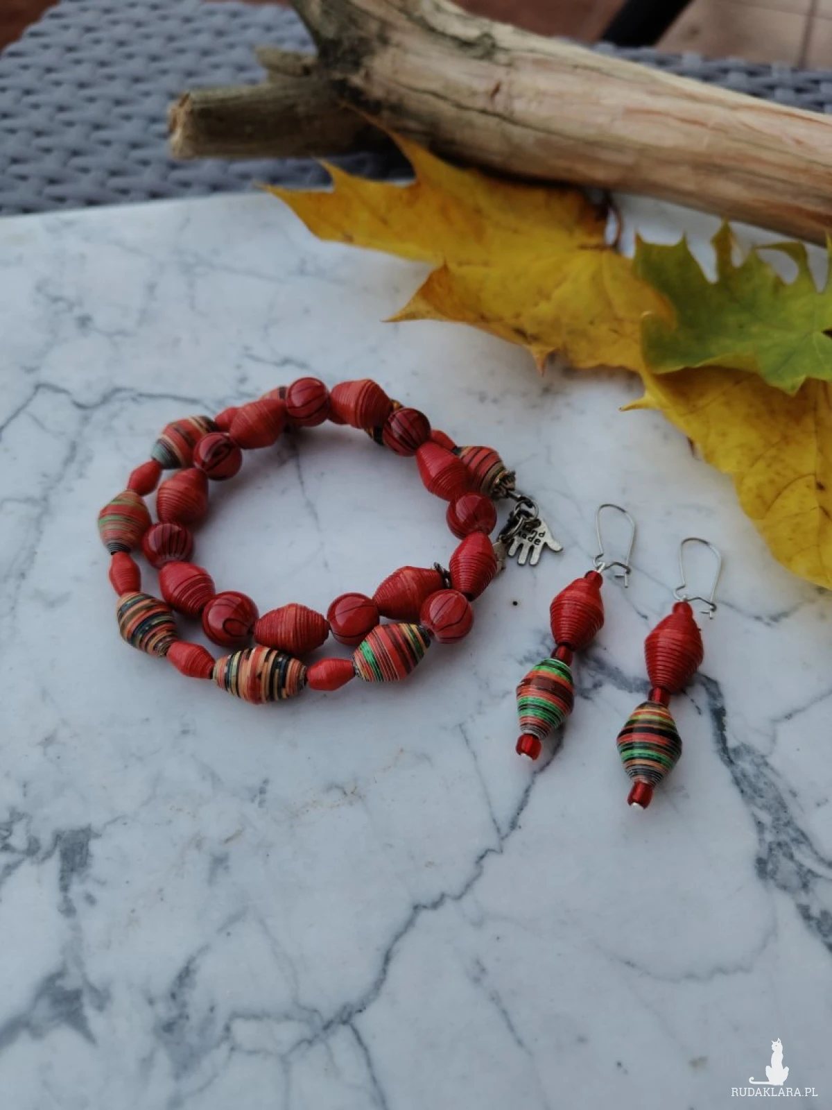 Ten wyjątkowy komplet biżuterii powstał z myślą o osobach, które kochają oryginalne dodatki, ekologiczne materiały i wyraziste kolory. Ręcznie zwijane koraliki z papieru tworzą niepowtarzalny wzór – każdy element ma własny charakter, dzięki czemu Twój zestaw będzie jedyny w swoim rodzaju. Ciepłe, intensywne odcienie czerwieni i wielobarwnych akcentów idealnie komponują się z jesienną aurą, dodając stylizacjom energii i artystycznego wyrazu. To biżuteria, która przyciąga spojrzenia i podkreśla Twoją kreatywność.