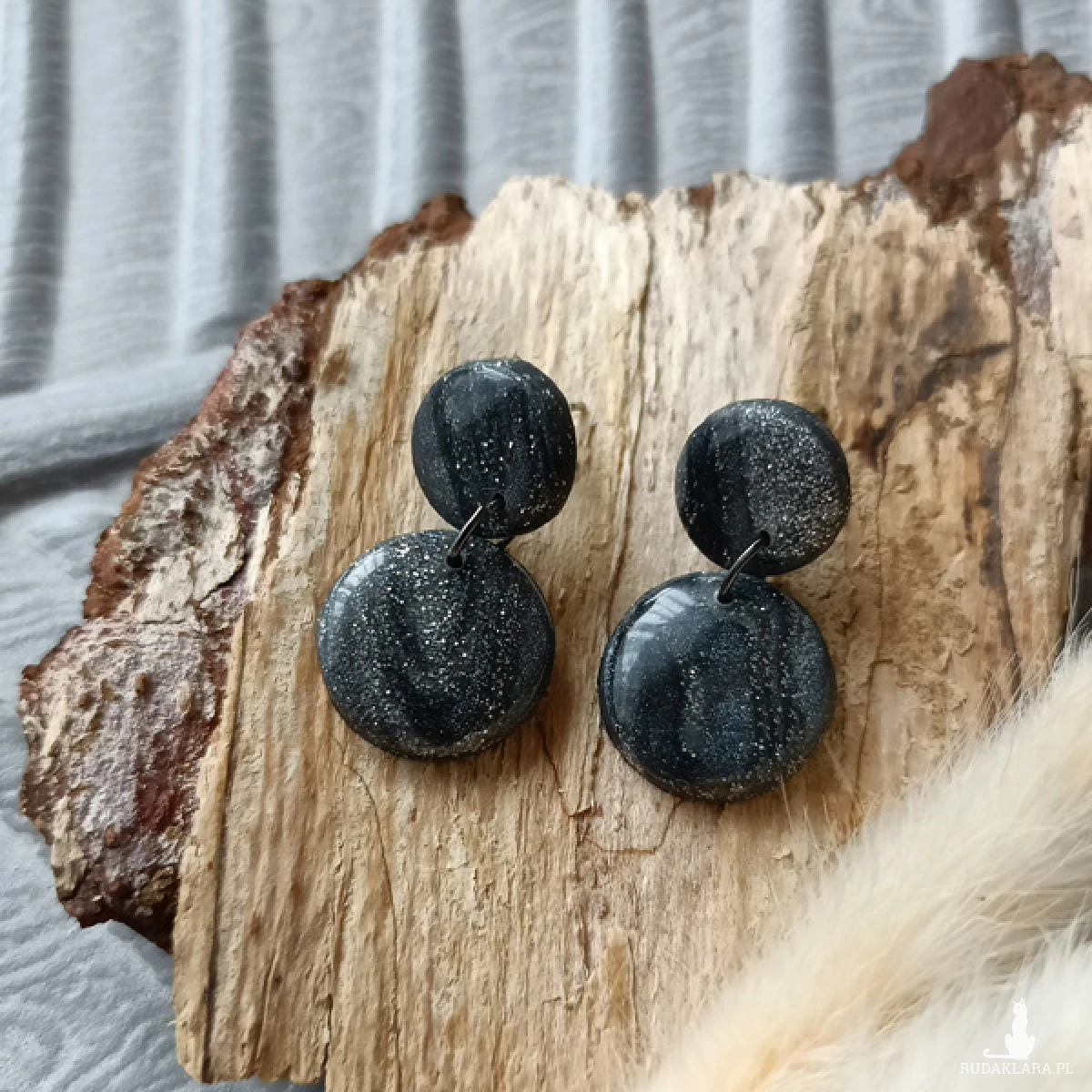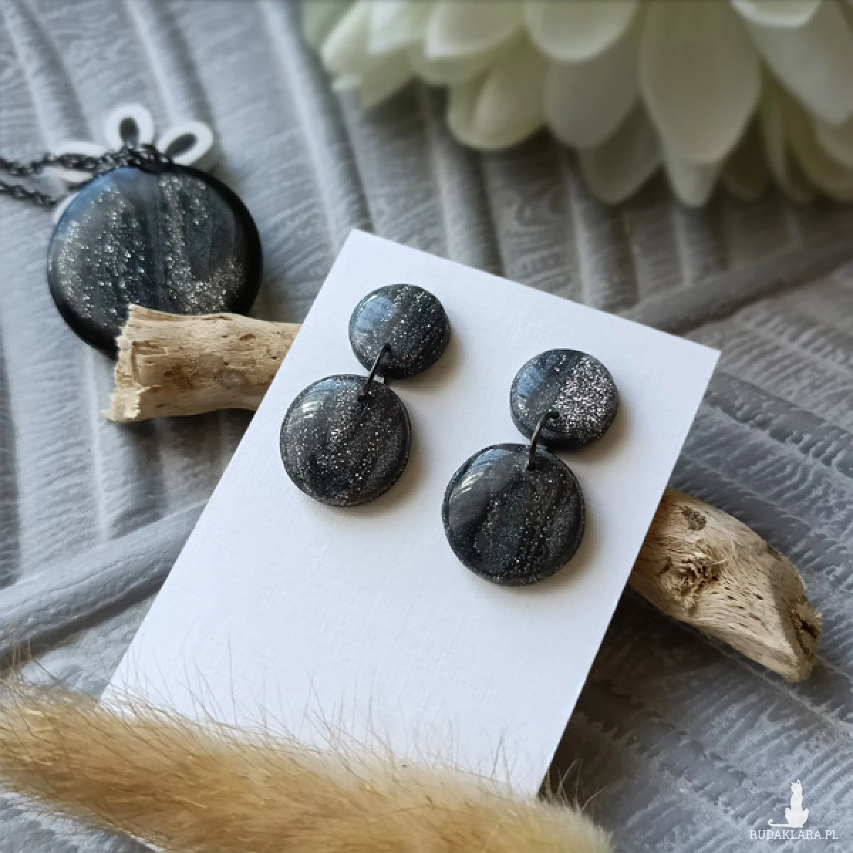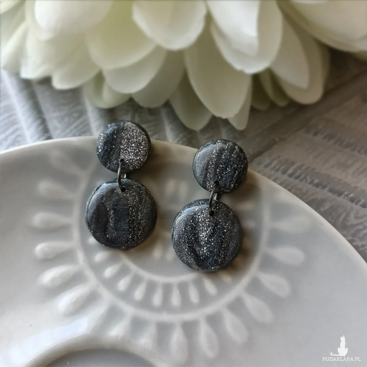 Kolczyki zostały wykonane w całości ręcznie z wysokiej jakości glinki polimerowej. Jest to materiał bardzo trwały, lekki i odporny na wszelkiego rodzaju czynniki zewnętrzne. Kolczyki są w kolorze szarym z drobinkami brokatu, zawieszone na sztyftach. Zostały pokryte żywicą epoksydową dla nadania błyszczącego efektu.Elementy metalowe są ze stali chirurgicznej. Całkowita długość kolczyków 2,8 cm, szerokość 1,8 cm. Są bardzo lekkie i pasują do każdej stylizacji na każdą porę dnia. Biżuteria pakowana jest w ozdobne pudełko. W innej ofercie dostępna jest zawieszka do kompletu.