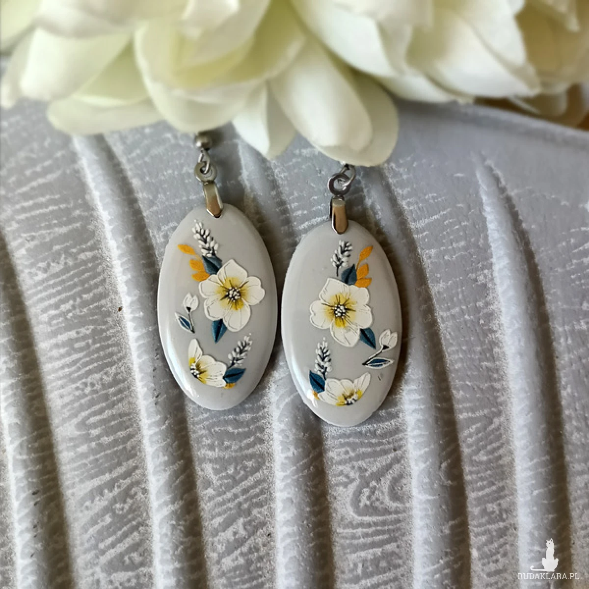 Kolczyki zostały wykonane w całości ręcznie z wysokiej jakości glinki polimerowej. Jest to materiał bardzo trwały, lekki i odporny na wszelkiego rodzaju czynniki zewnętrzne. Kolczyki są w kolorze szarym z delikatnym ornamentem, pokryte żywicą epoksydową dla nadania błyszczącego efektu. Elementy metalowe są ze stali chirurgicznej w kolorze srebrnym. Całkowita długość kolczyków 5,5 cm, szerokość 2 cm. Są bardzo lekkie i pasują do każdej stylizacji na każdą porę dnia. Biżuteria pakowana jest w ozdobne pudełko.