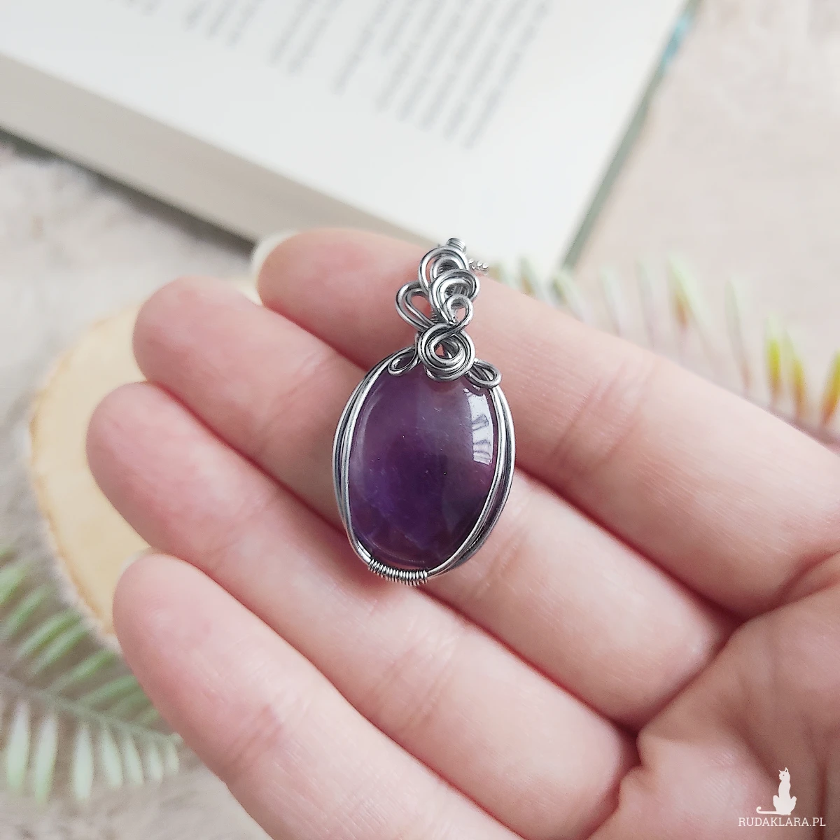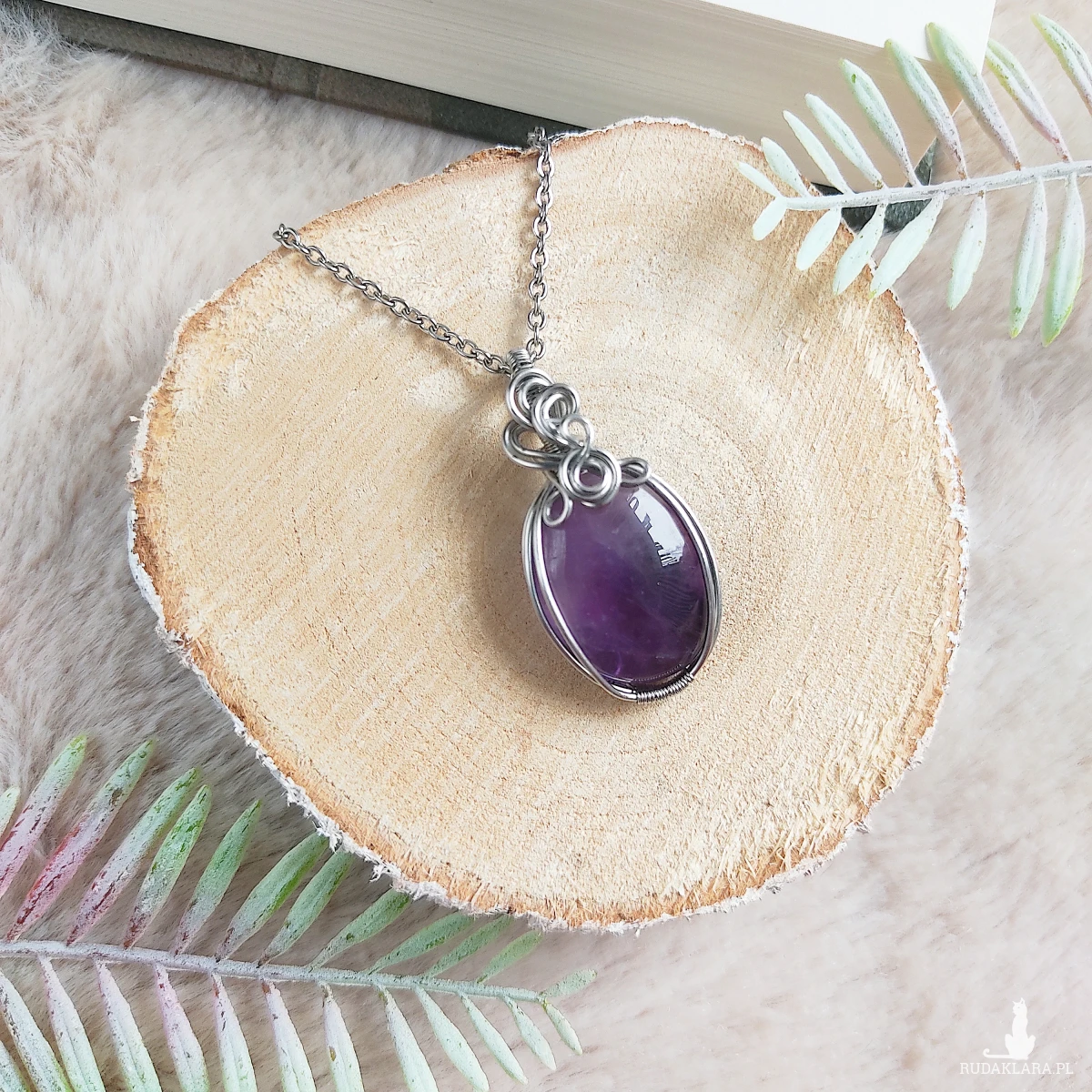 Naszyjnik Ametyst ręcznie robiony. Wykonany techniką wire wrapping z drutów ze stali chirurgicznej.