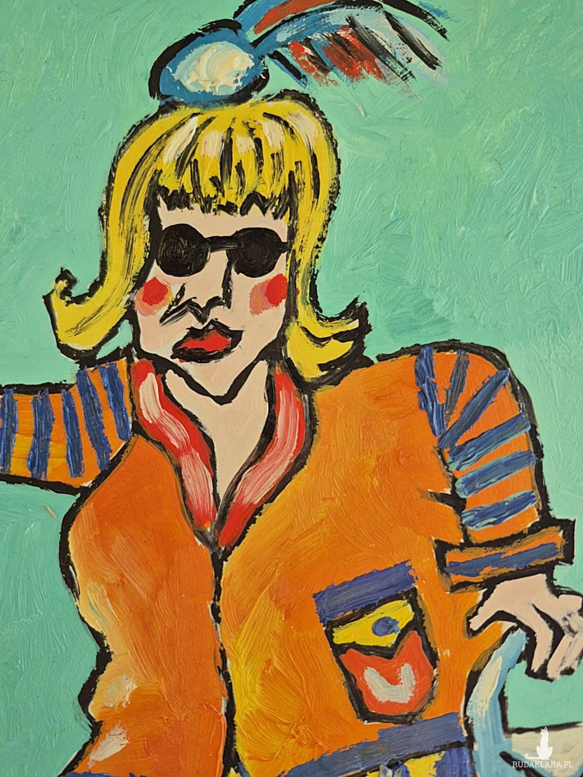 Na obrazie widzimy postać jak z bajki lub snu – kobietę o przerysowanych proporcjach, namalowaną grubą, zdecydowaną kreską. Jej sylwetka jest dynamiczna, jakby była w ruchu lub pozowała z teatralną pewnością siebie. Ma jasne, żółte włosy obcięte na prosto, ozdobione fantazyjnym piórkiem, a oczy skrywa za ciemnymi okularami, co dodaje jej tajemniczości i lekkiej ironii. Różowe rumieńce i czerwone usta podkreślają ekspresję twarzy.