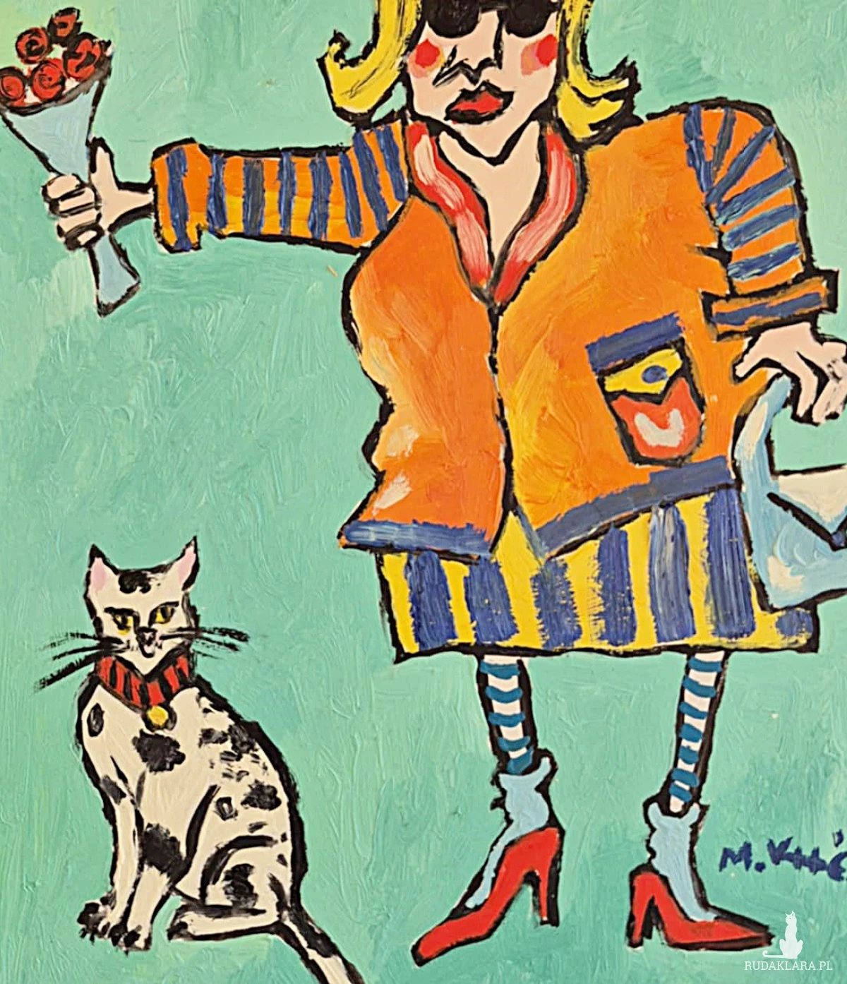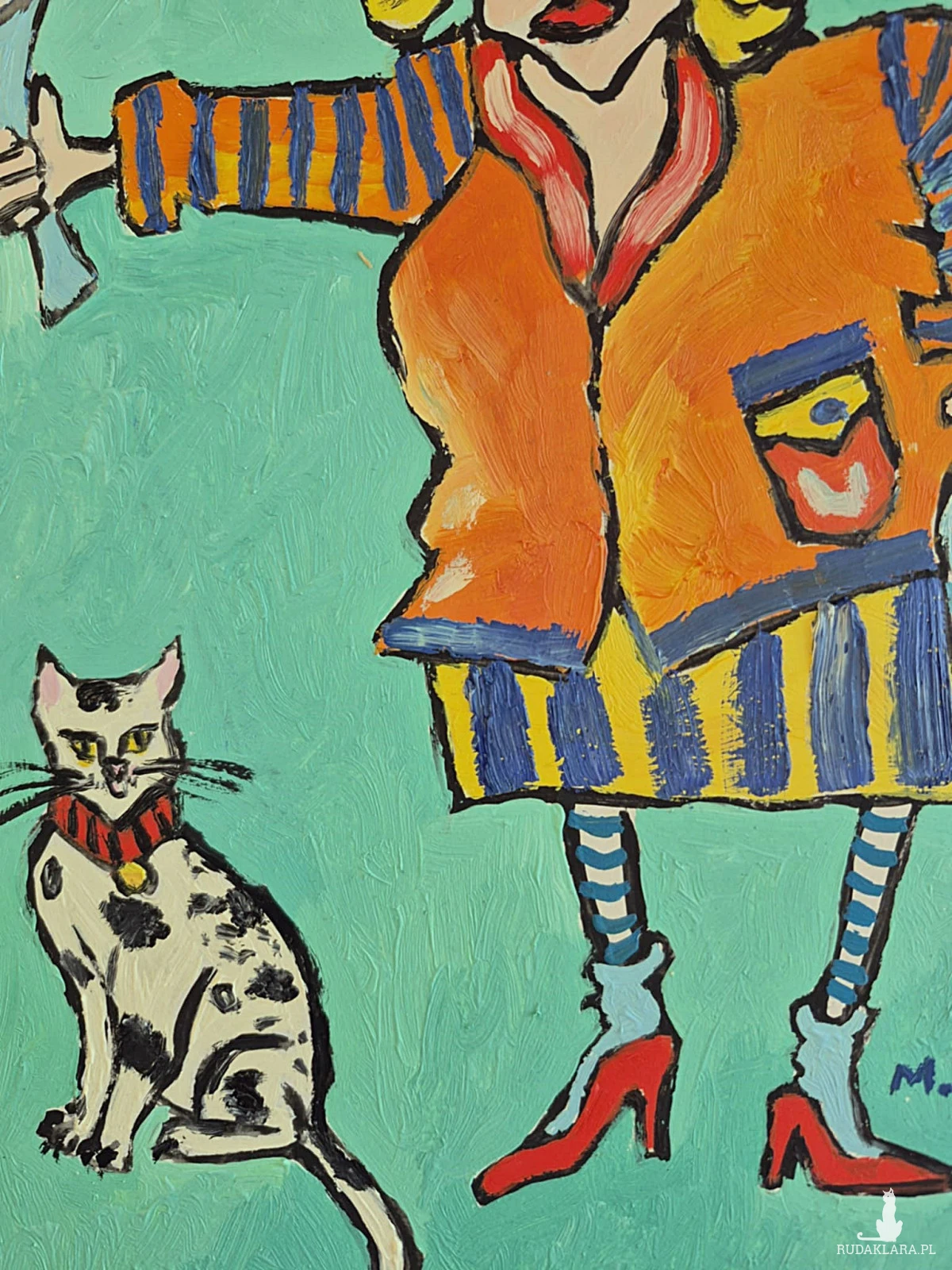 Obok niej siedzi kot, biały w czarne łaty, spokojny i czujny. Jego obecność równoważy kompozycję i wprowadza nutę domowego ciepła, a jednocześnie kontrastuje z ekstrawagancją postaci ludzkiej.