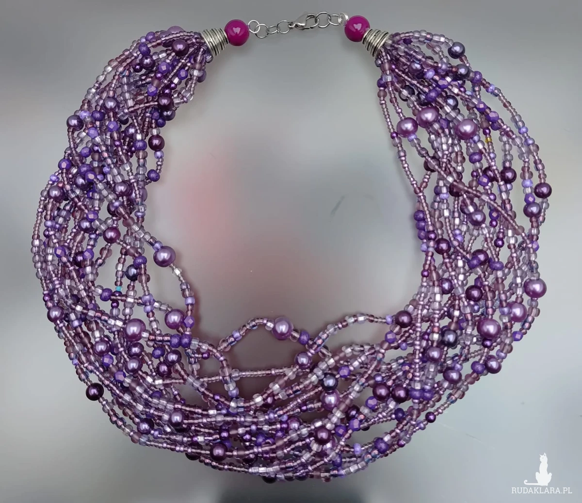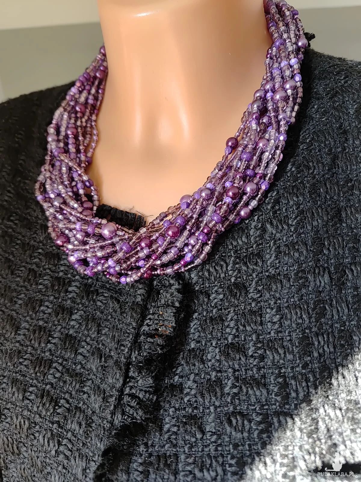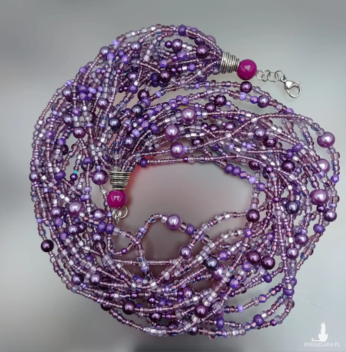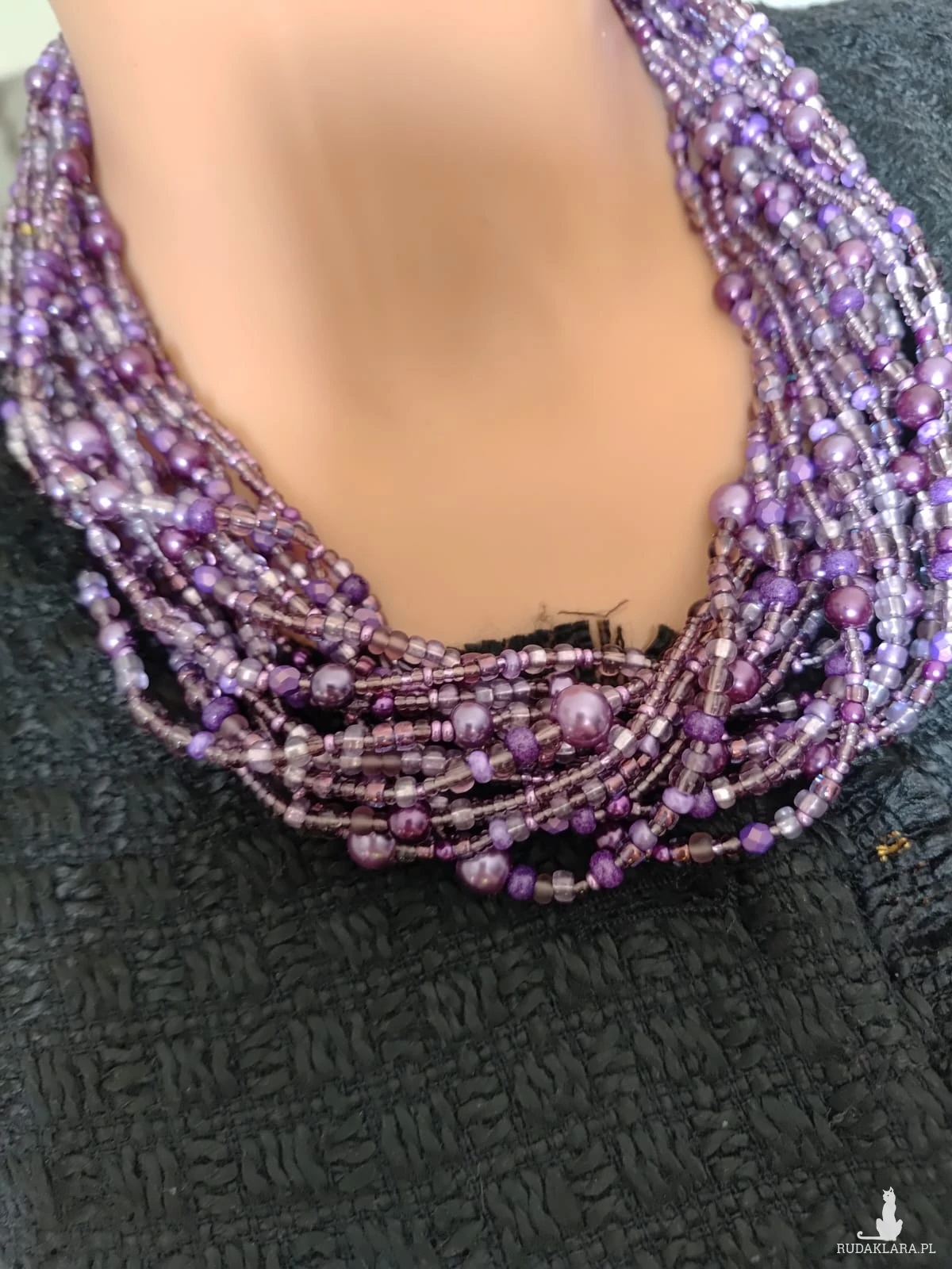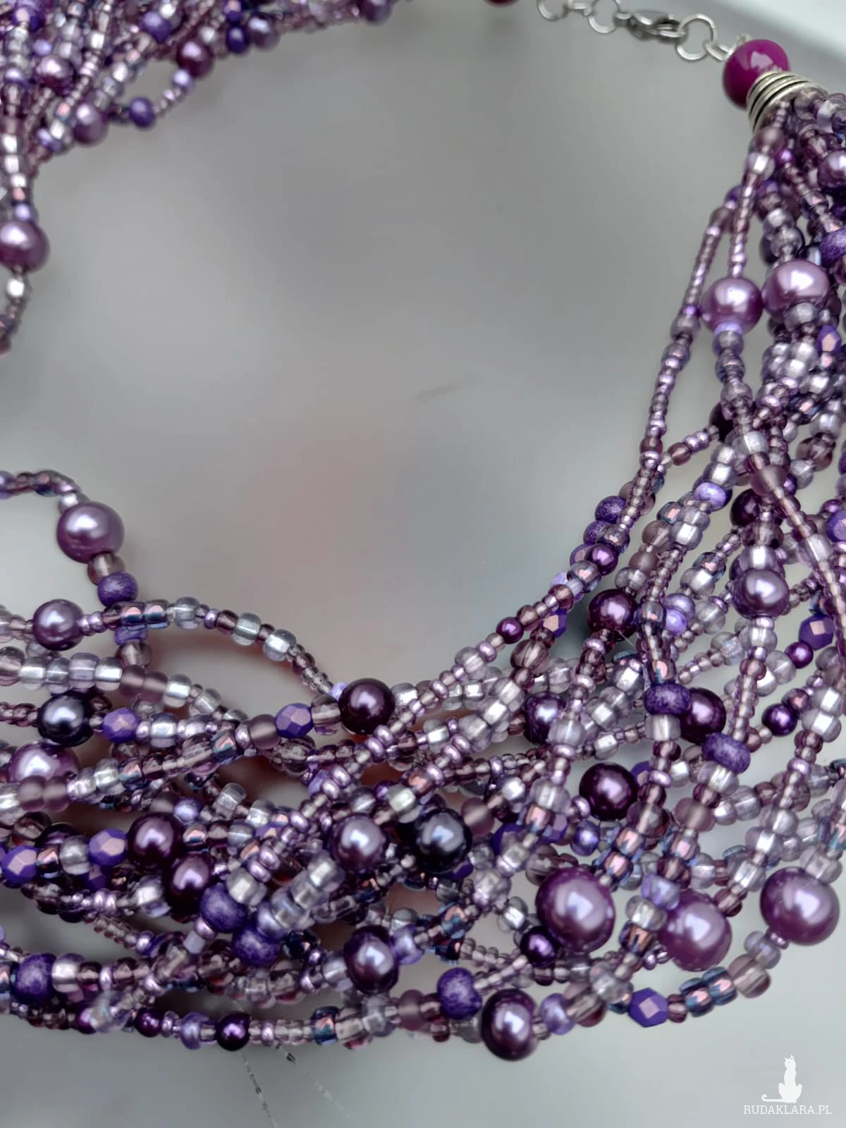 Naszyjnik z pereł szklanych w kolorze fioletowym. Wykończenie metalowymi