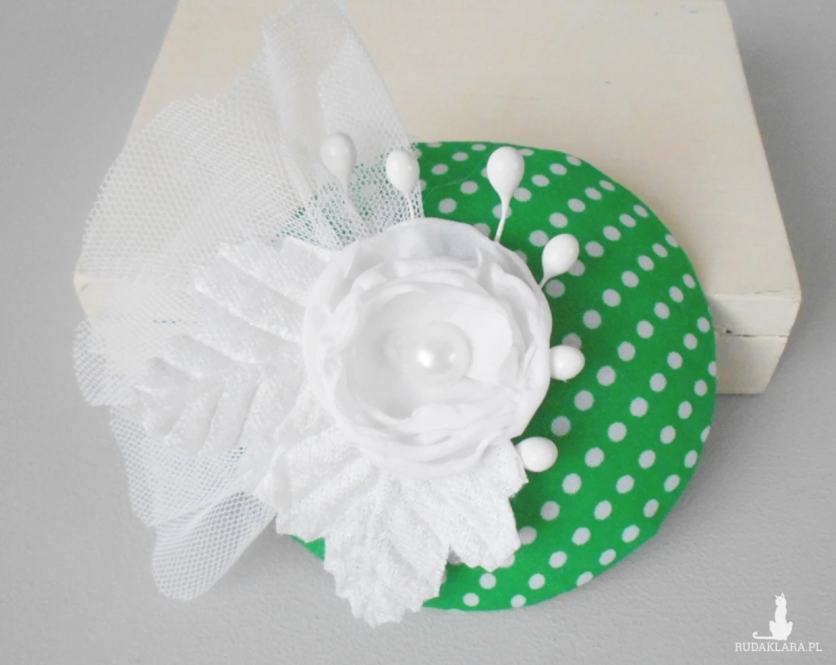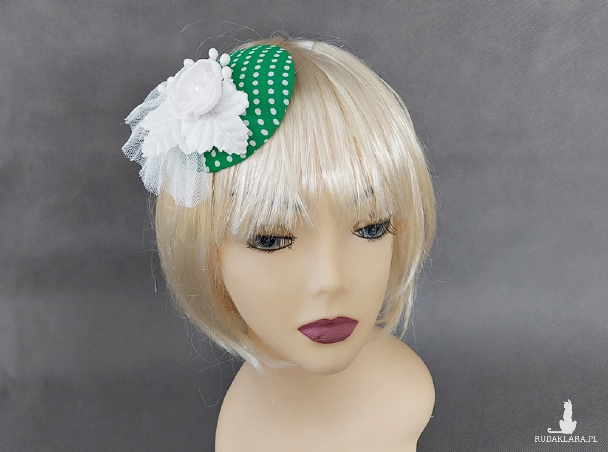 Polka Dots - czyli deseń w kropki to wzór na czasie. Ten fascynator w kolorach: intensywnie zielonym i białym to akcesorium, które podkreśli stylizacje nawet z najprostszą sukienką.