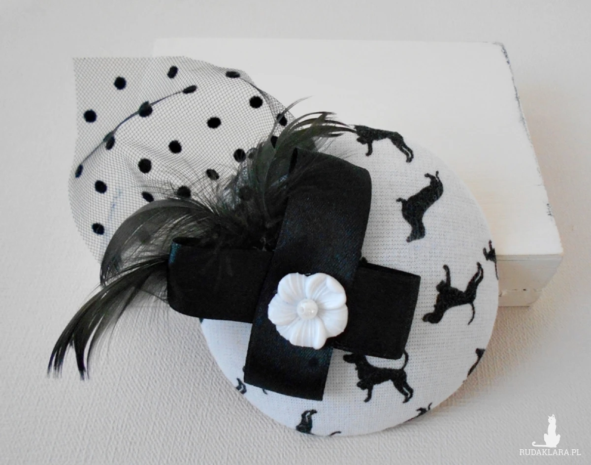 Ręcznie wykonany fascynator z dużą dawką kreatywności i humoru! Ten oryginalny dodatek przyciąga uwagę – zdobią go wesoło biegające pieski oraz dekoracja ze wstążki, tiulu i piór. Idealny dla miłośniczek stylu retro, które lubią wyróżniać się wyjątkowymi akcesoriami.