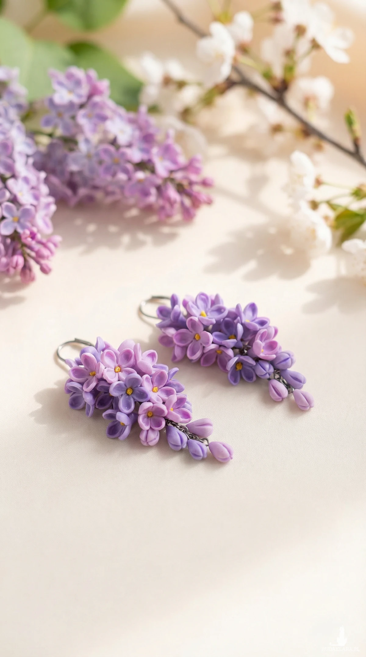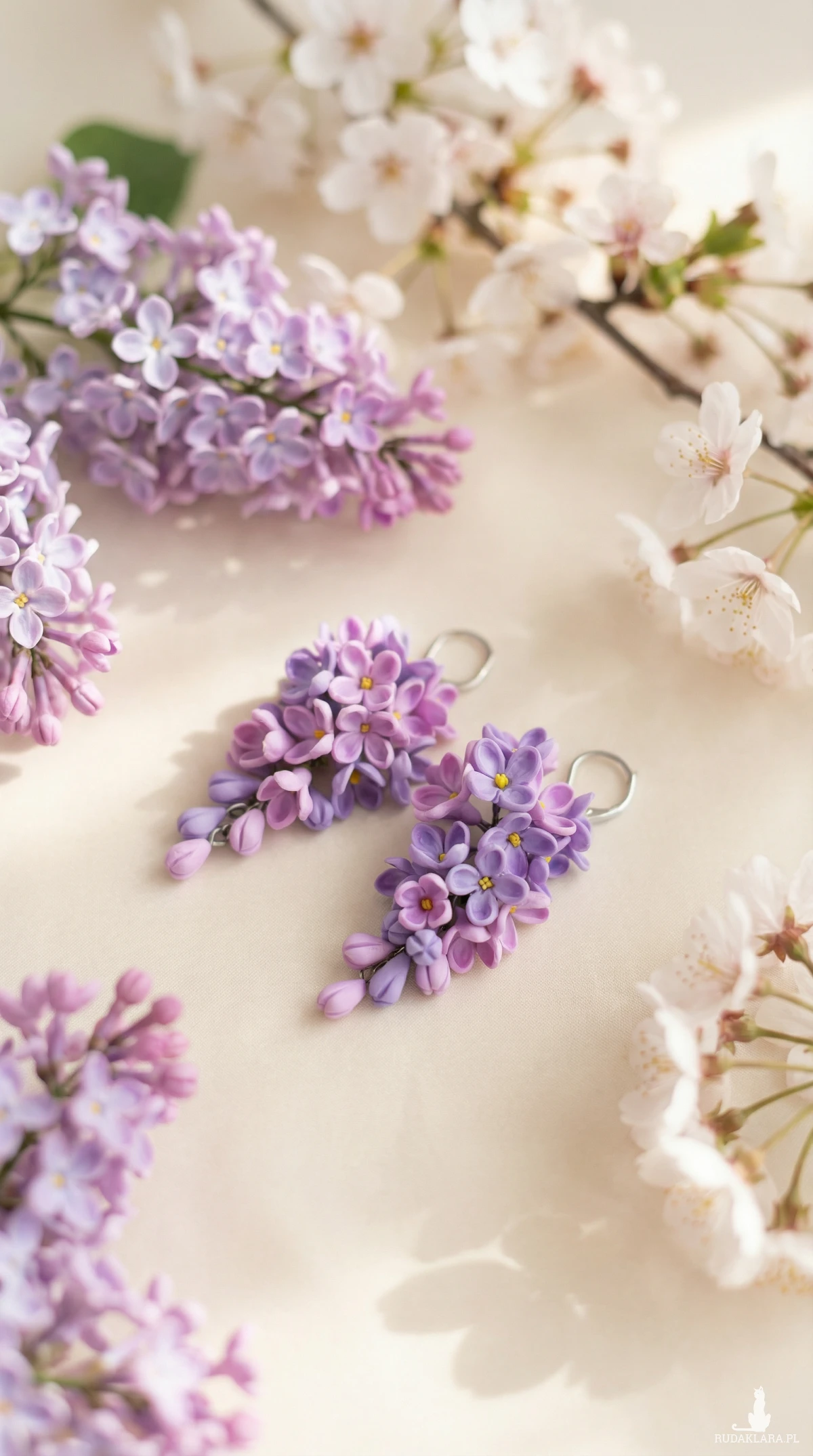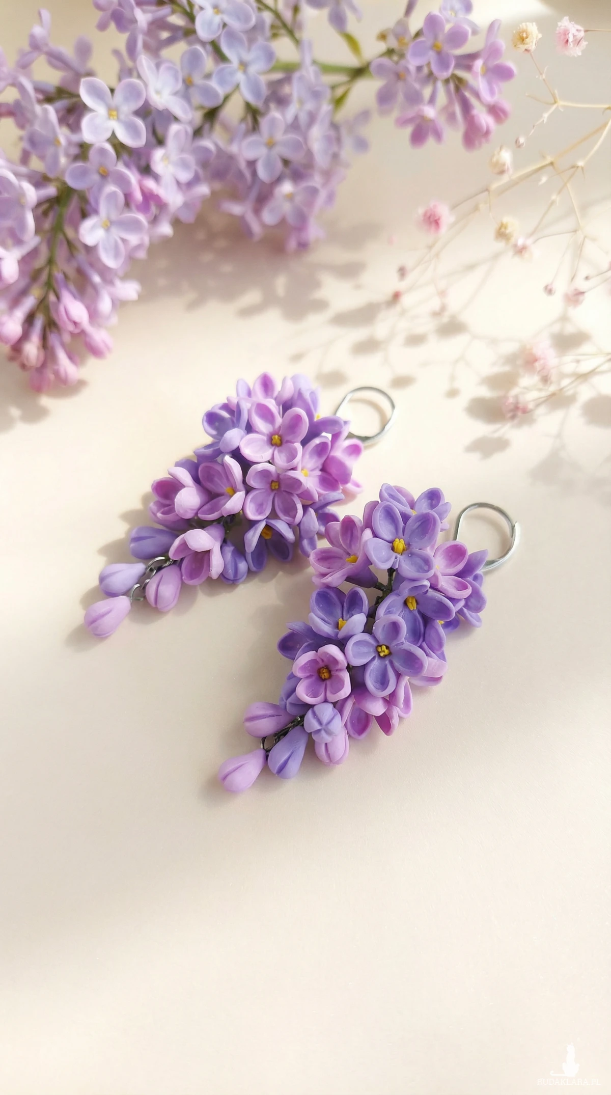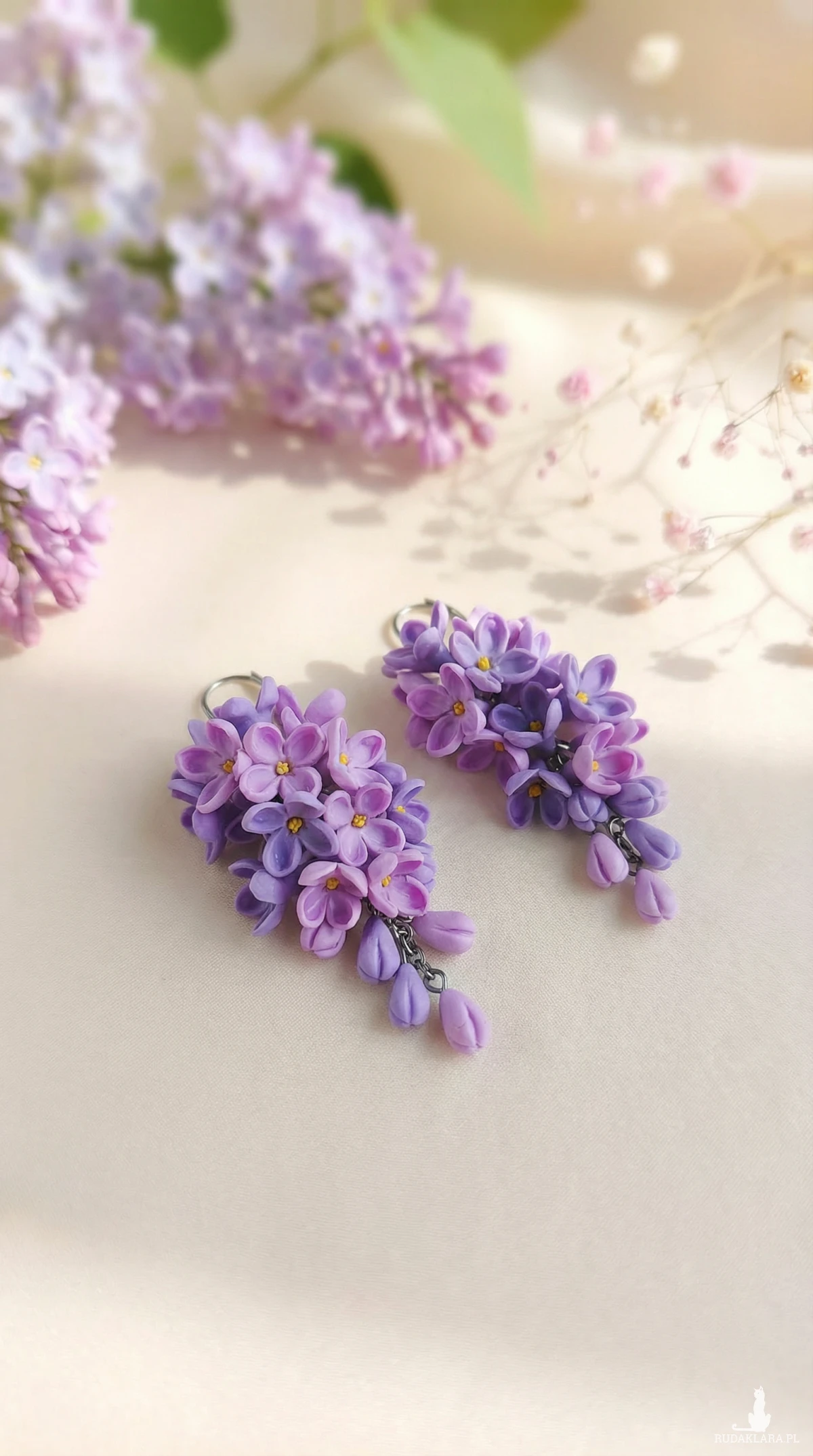 Kolczyki z kwiatuszkami bzu ręcznie wykonane z profesjonalnej gliny polimerowej.