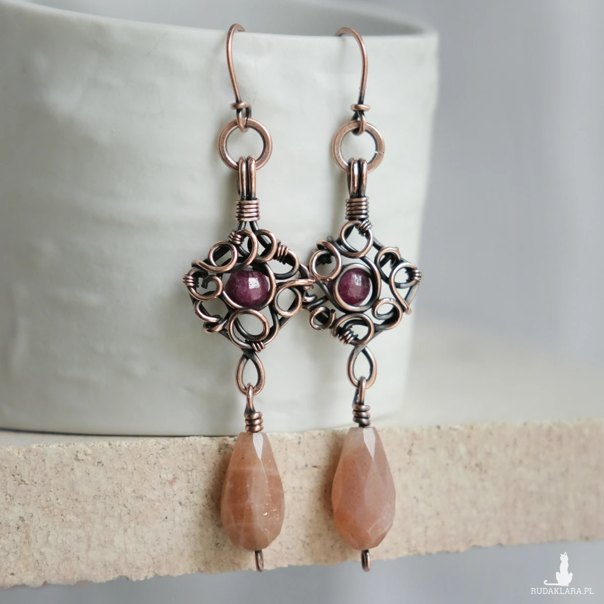 Kolczyki miedziane unikatowe wire wrapping z kamieniem słonecznym i rubinem