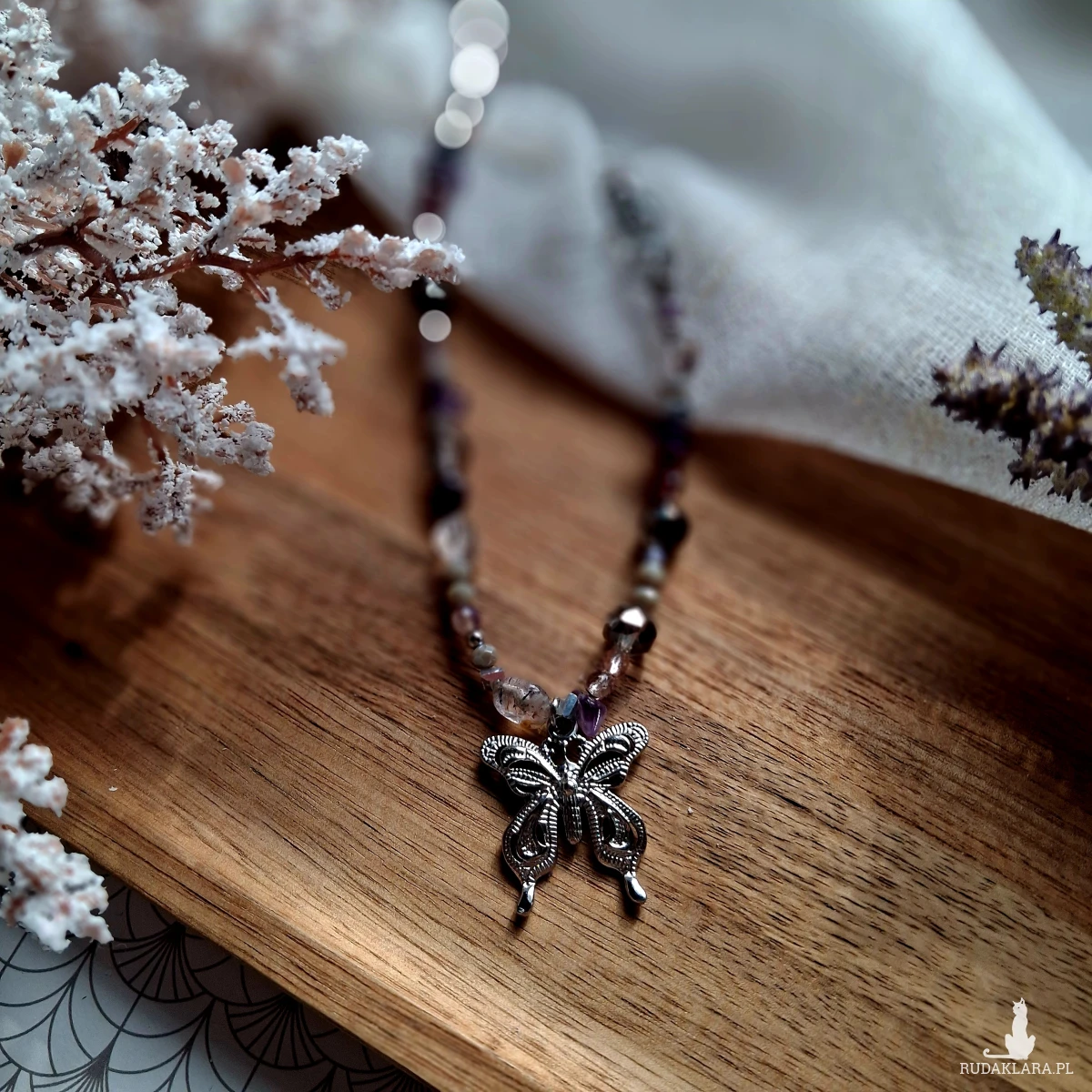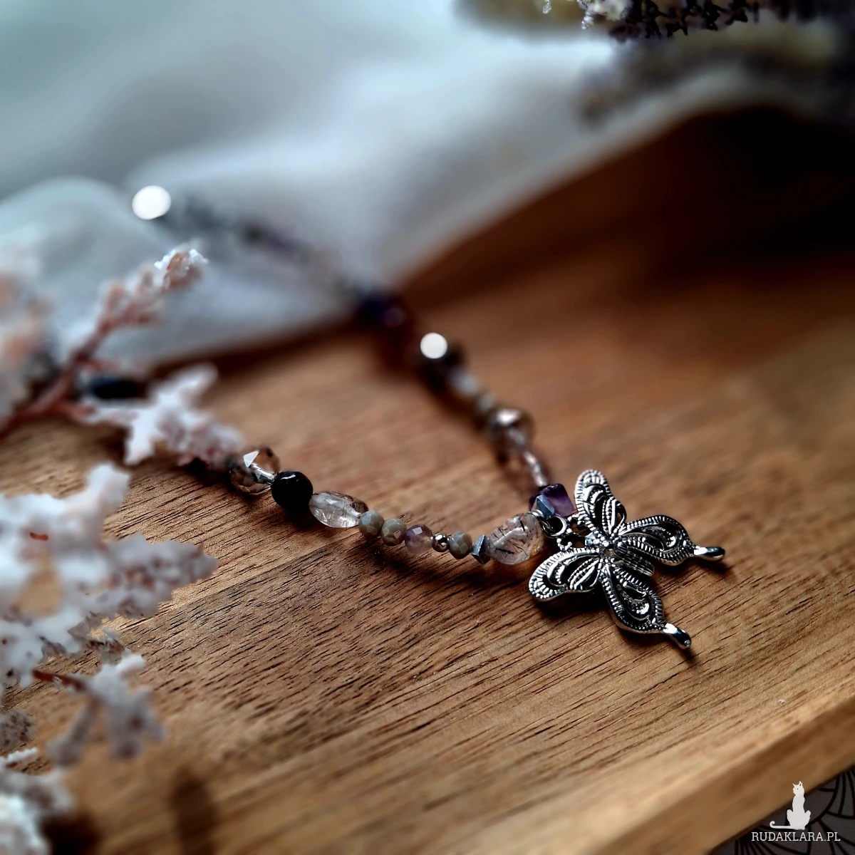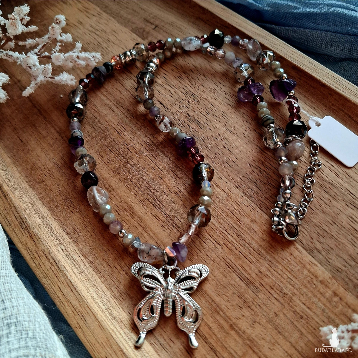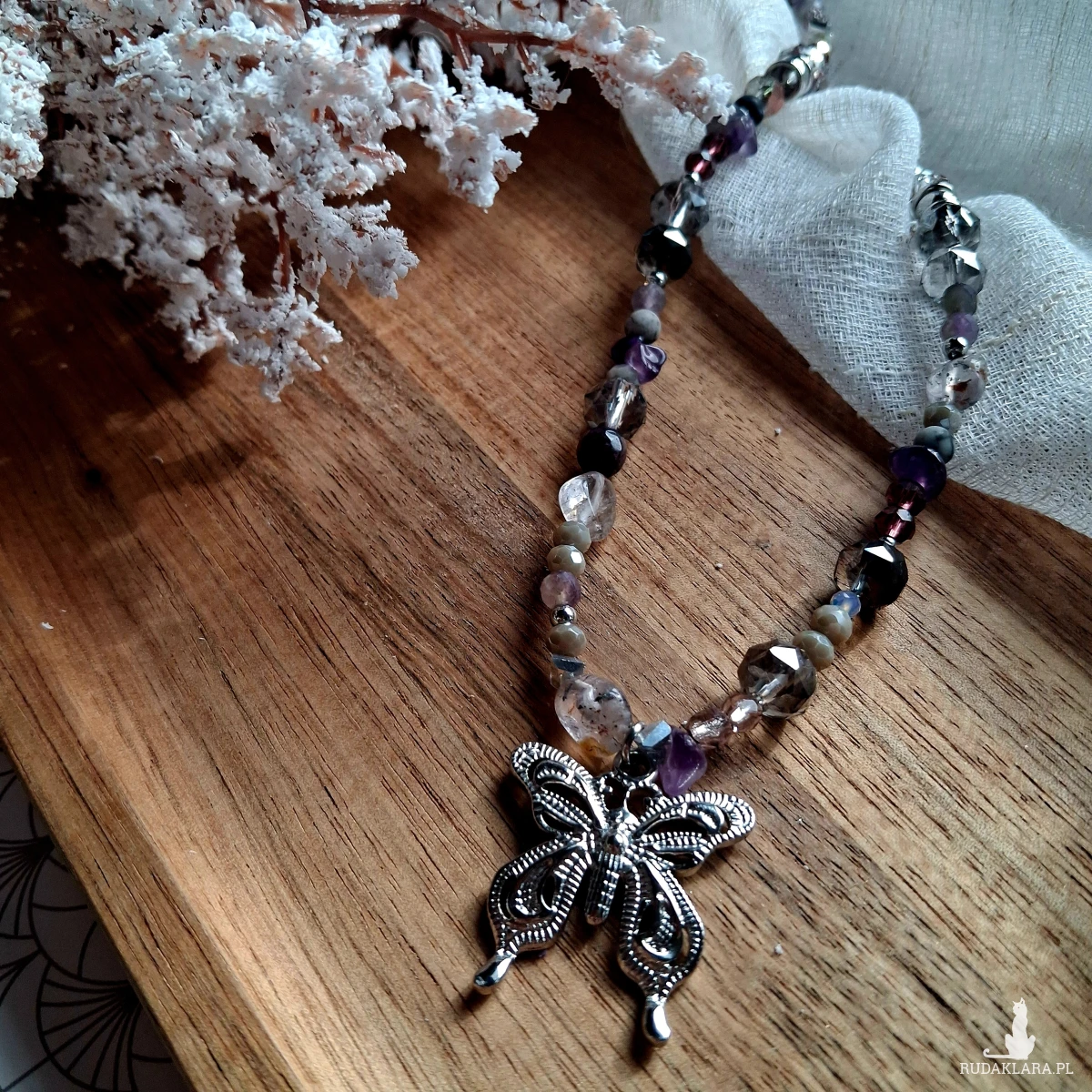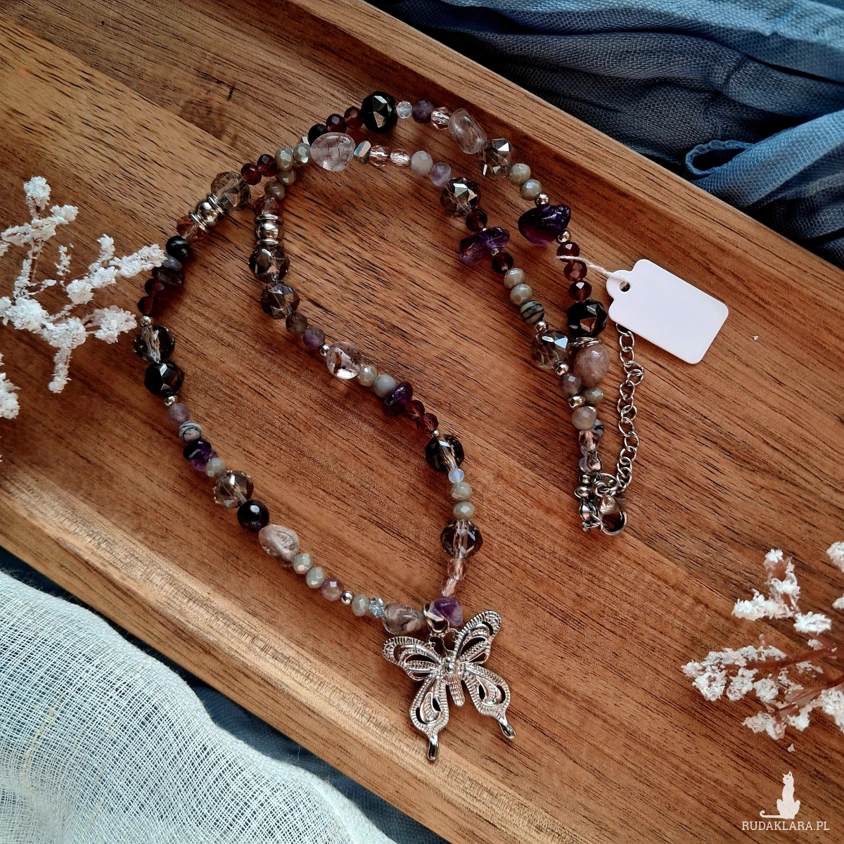 Naszyjnik srebrno-fioletowy. Wykonany z kamieni, szklanych koralików oraz stali nierdzewnej (jubilerskiej). Użyte kamienie: