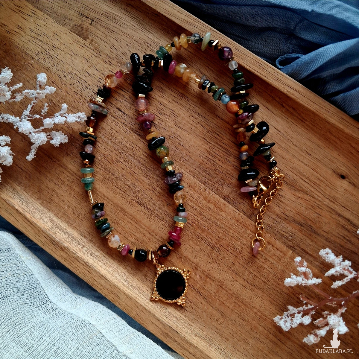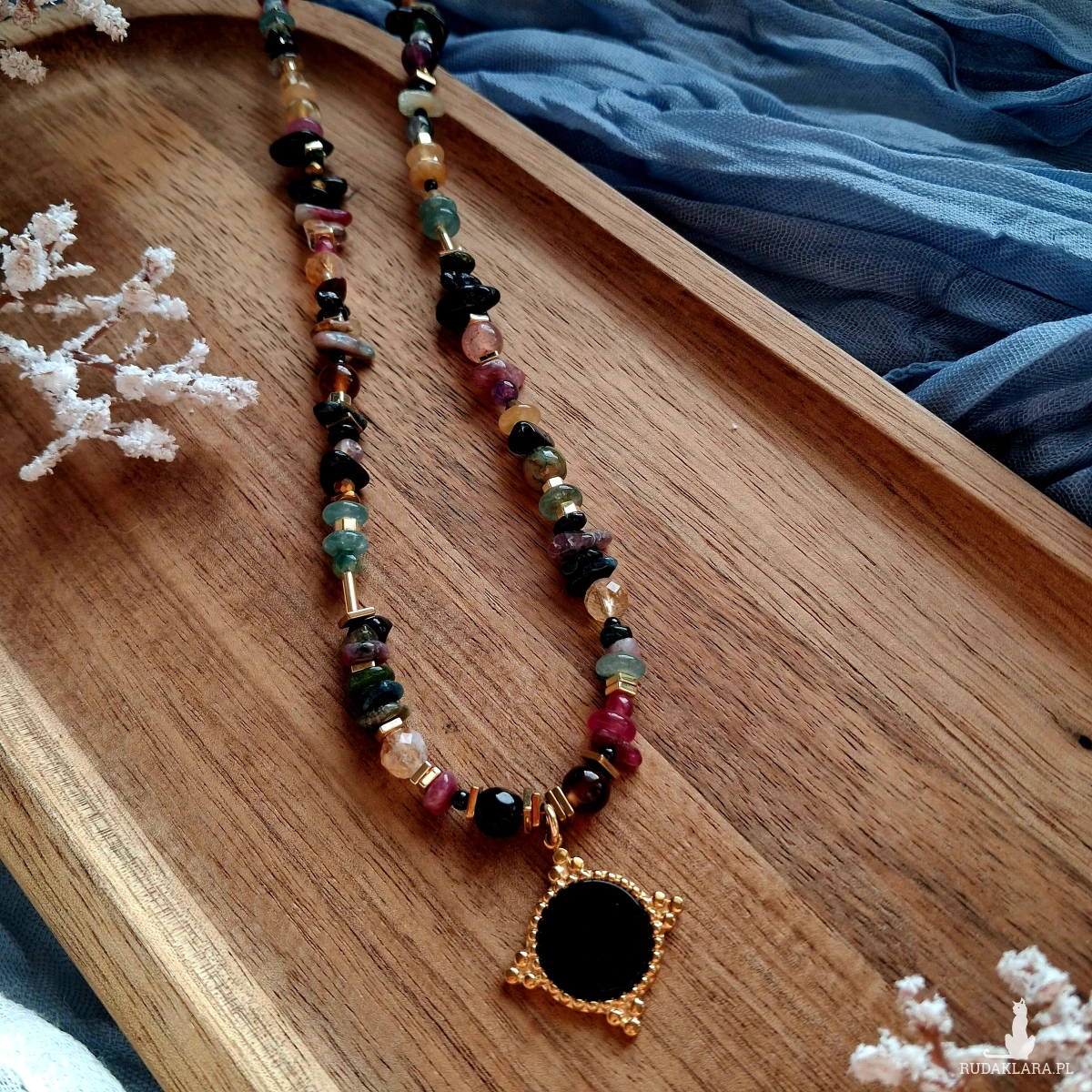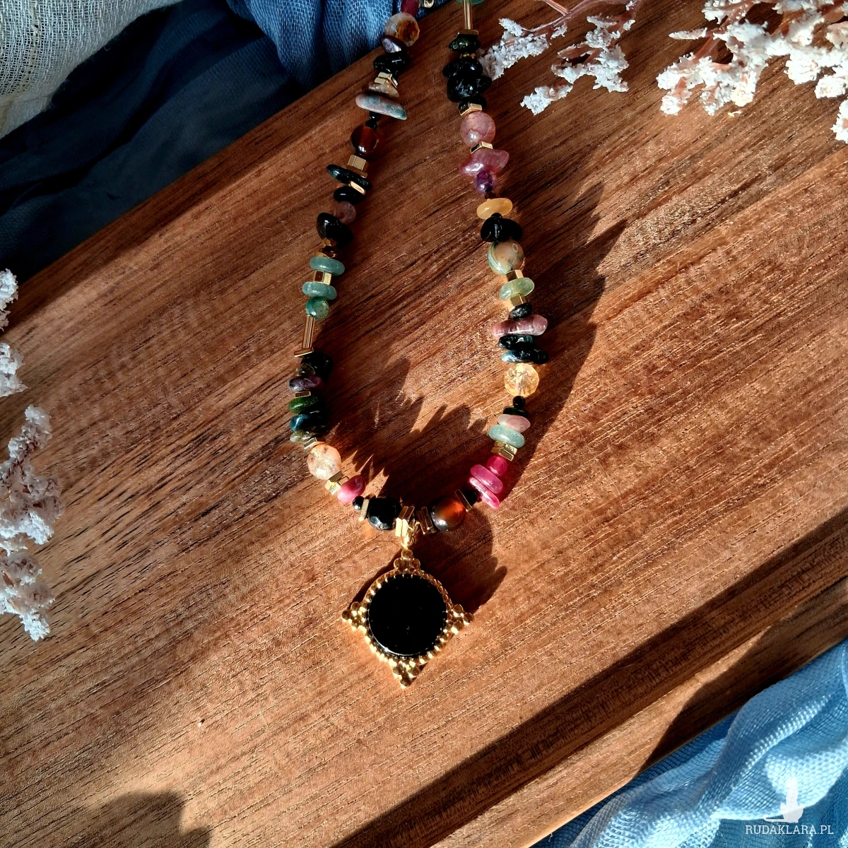 Naszyjnik wykonany z kamieni, szklanych koralików oraz stali nierdzewnej (jubilerskiej). Użyte kamienie: